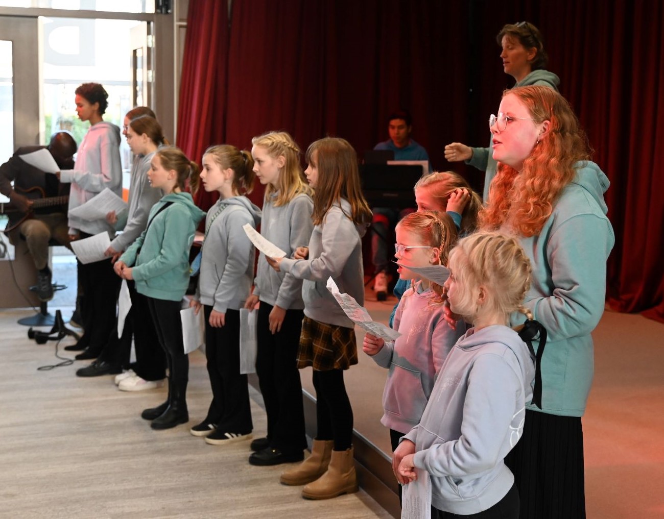 Op zondag 9 november zong het koor gospelkidZ tijdens het ZondagmiddagPodium in Bieb Nijkerk. Dat is een kinder- en tienerkoor uit Amersfoort met een warm hart voor muziek en geloof. Met hun meerstemmige repertoire brachten ze liederen vol blijdschap, bezinning en inspiratie. Ook de zaal mocht interactief meedoen. Foto Kees van den Heuvel