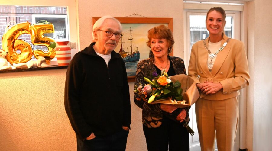 De vlag ging dinsdagmiddag 27 januari uit bij de familie Terschegget, want Hannie en Goos waren liefst 65 jaar getrouwd. Burgemeester De Jonge kwam langs om het jubilerende stel met een boeket bloemen te feliciteren. Goos kennen we vooral als oud-wethouder van de gemeente Nijkerk en de judo sportschool. Op die judoschool heeft hij Hannie uiteindelijk ook leren kennen. Na zijn politieke loopbaan heeft hij zich vooral ingezet voor hulpacties voor Oost-Europa. Het meest trots is hij op zijn overtocht naar de Amerikaanse zusterstad Schenectady in 1984 toen hij met gevaar voor eigen leven de Atlantische Oceaan per zeilschip overstak. In Schenectady werd hij verwelkomd door een groep van dertig Nijkerkers die op een wat veiligere manier de oversteek hadden gemaakt. Foto Kees van den Heuvel