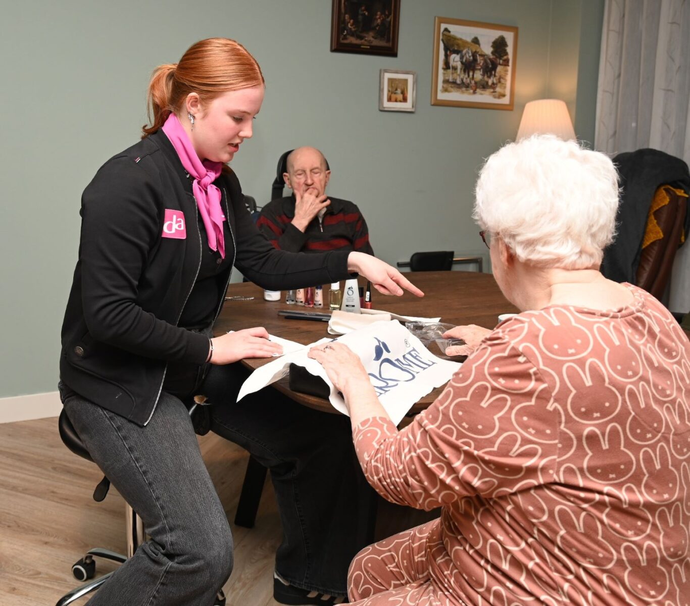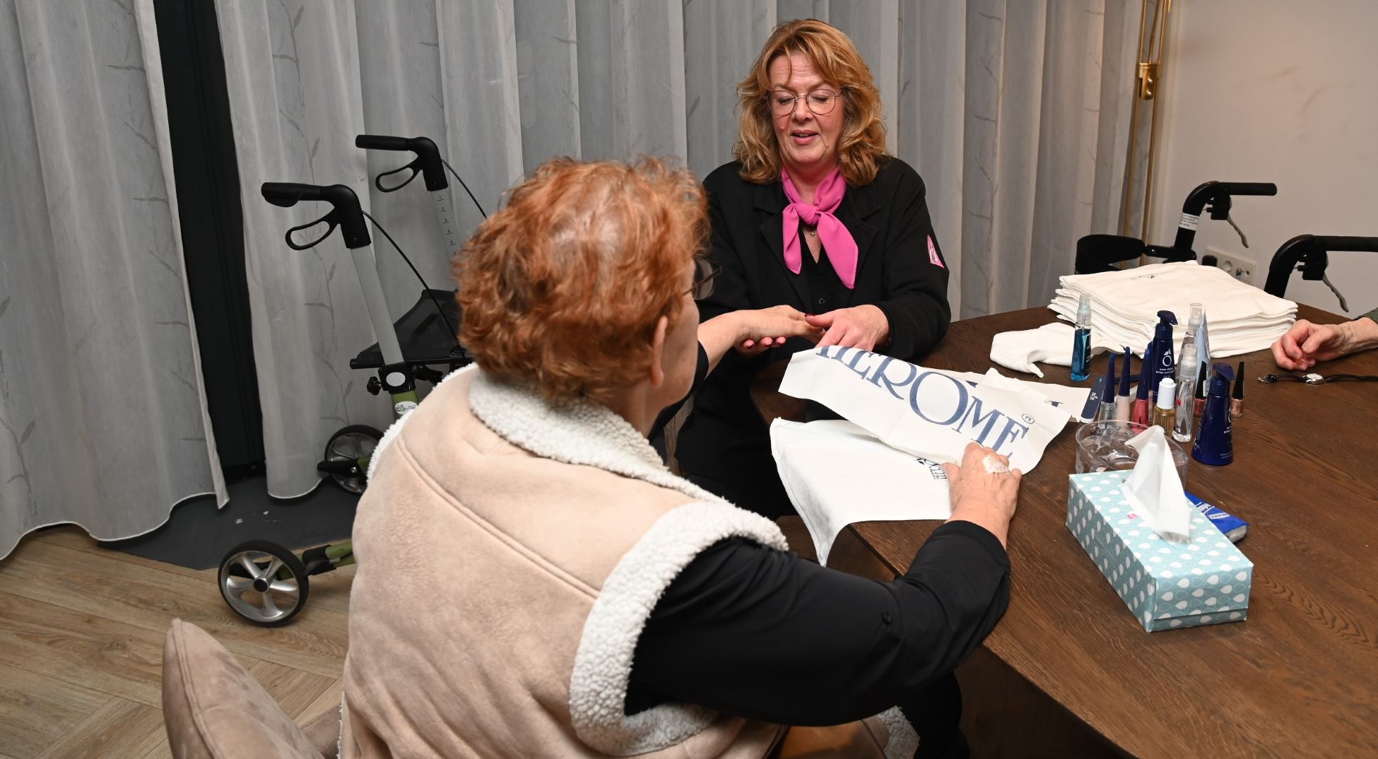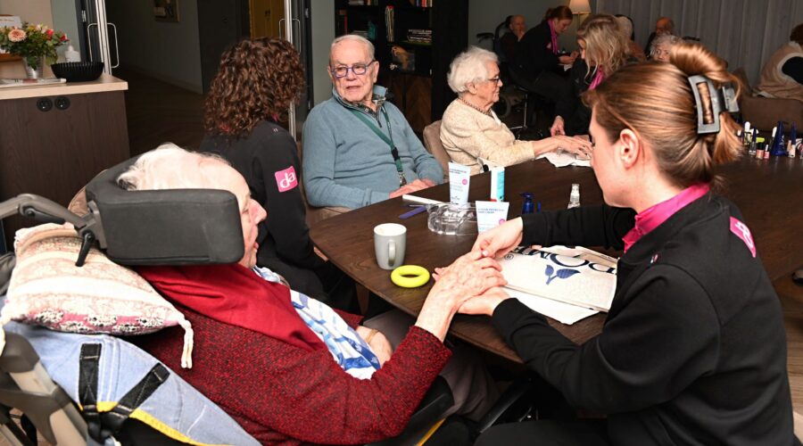 De Health Queens van Drogisterij en Parfumerie Hoevelaken hebben de bejaarde bewoners van de Eendracht in Zwartebroek dinsdagavond 24 februari april heel erg blij gemaakt. Veel medewerksters waren aanwezig om de bewoners een manicure en een scrub te geven. Zowel de vrouwen als de mannen werden onder handen genomen. Het geluksmomentje werd door de drogist uiteraard geheel belangeloos aangeboden. Eigenaresse Herma Huijgen: ,,Wij vinden het namelijk belangrijk om met het team wat te doen voor onze oudere medemens”. Foto Kees van den Heuvel