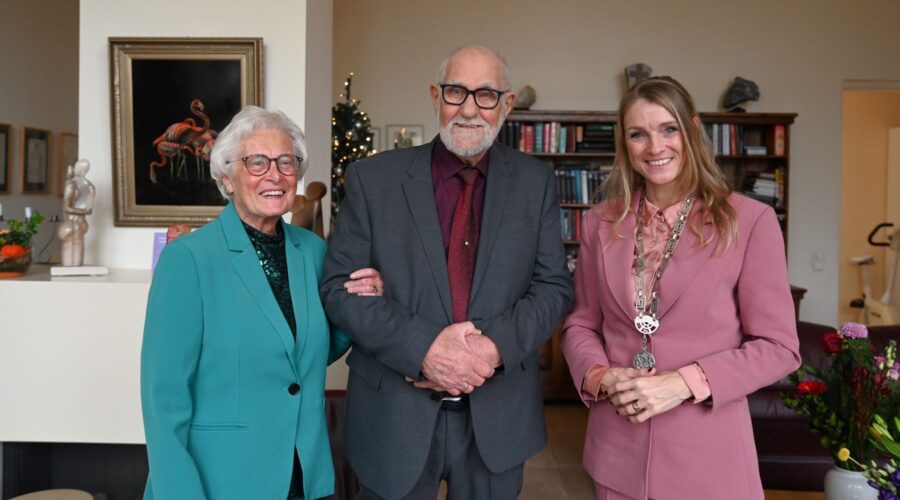 Henk en Nel van Omme vierden woensdag 17 december dat zij zestig jaar zijn getrouwd. Het huwelijksjubileum werd opgesierd door de komst van burgemeester Tinet de Jonge die een bos bloemen meenam voor het jubilerende echtpaar. Ze hebben elkaar via de korfbalsport ontmoet. Henk was lid van Odik in Barneveld en Nel lid van DVO uit Bennekom. Tijdens een toernooi in Doetinchem werden ze verliefd op elkaar. Van de trouwdag blijft bij dat het enorm regende en een paraplu nodig was om de trouwjurk enigszins droog te houden. In zijn werkzame leven was Henk verkoopleider bij een liftenbedrijf in Veenendaal en Nel werkte in Arkemheen. Hulp aan vluchtelingen en minderbedeelden staat bij beide hoog op de agenda. foto Kees van den Heuvel