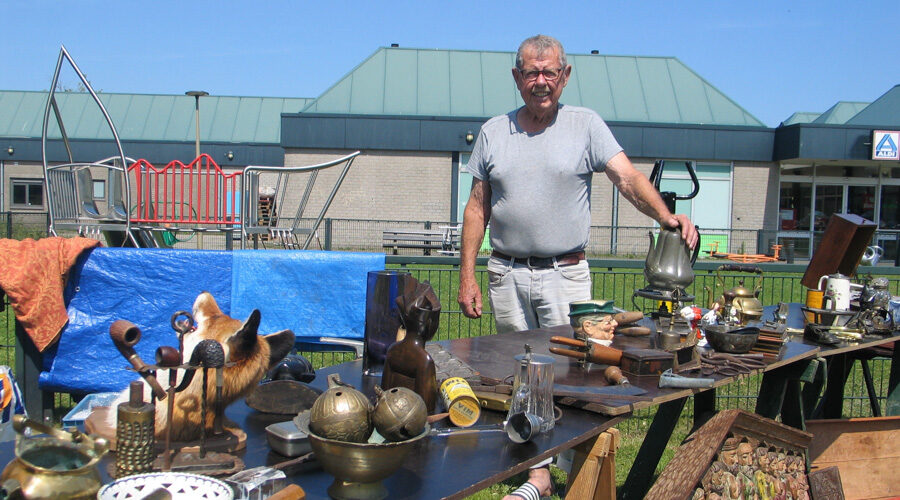 Met zijn 83 jaar was Hoevelaker Henk Kous ook zaterdag weer paraat tijdens de rommelmarkt en kofferbakverkoop in het Paasbos van Nijkerk. ,,Het was wel warm met ’s morgens al temperaturen van 25 graden, maar dat mag de pret niet drukken”, vertelt hij monter. ,,Het is vakantietijd en door de hitte zijn er ook niet zo veel belangstellenden”, vult hij aan. De meeste standhouders pakten dan ook op tijd hun spullen weer in.