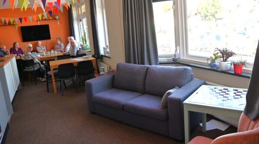 Trots presenteerde buurthuis De Refter in de binnenstad van Nijkerk deze week de nieuwe inrichting van het pand aan de Holkerstraat. Er staat nu in het midden van de ruimte een bankstel, waardoor de deelnemers van activiteiten meer achterin de zaalruimte zitten en er optimaler gebruik wordt gemaakt van de ruimte. Maar dit blijkt toch niet zo te bevallen. Het is bij de grote tafel best wel krapjes. Dus wordt volgende week weer alles omgegooid. Foto Kees van den Heuvel
