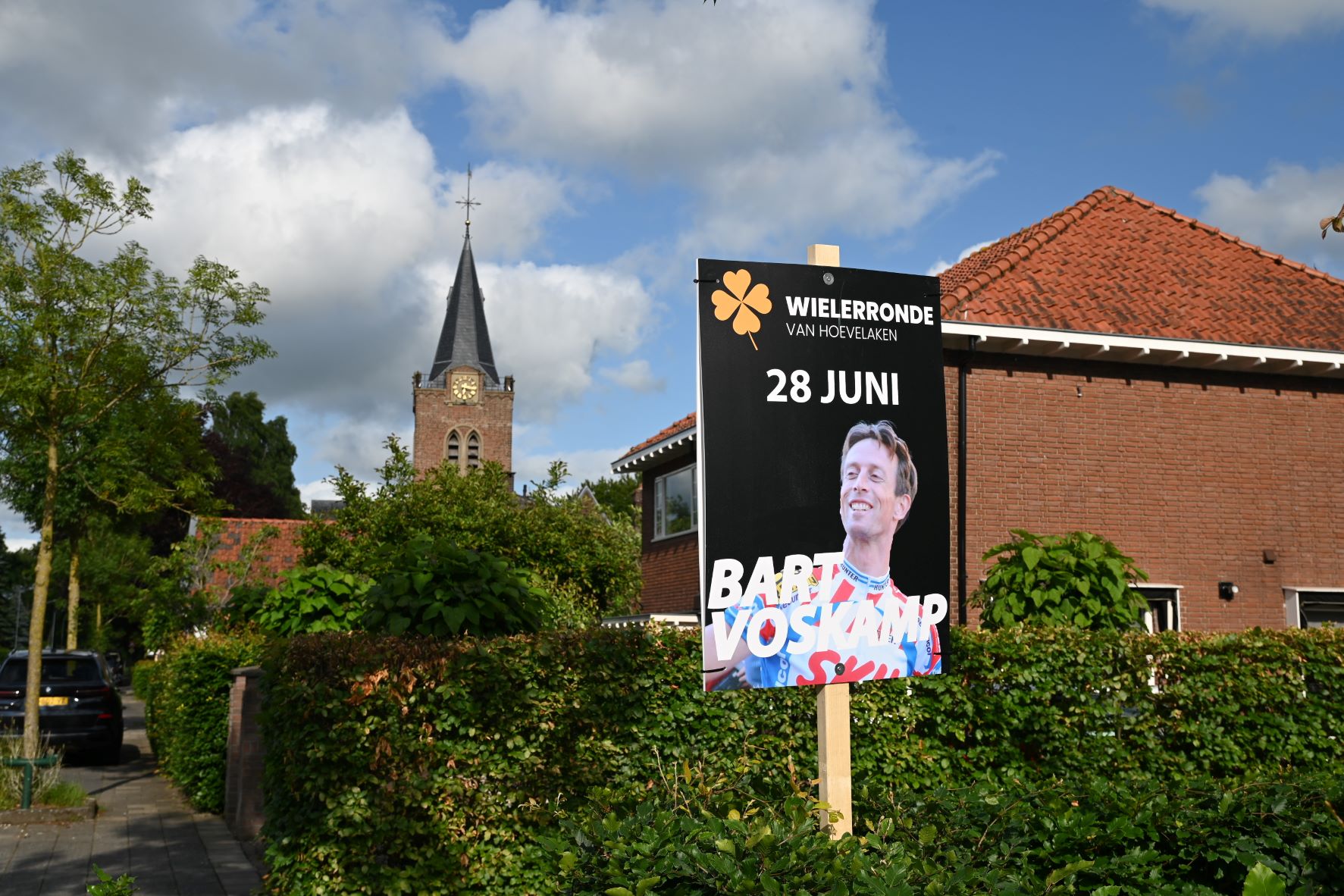 Op 28 juni vindt de wielerronde van Hoevelaken plaats. Het dorp is al helemaal in de ban van het evenement. Wie Hoevelaken binnenkomt wordt geconfronteerd met de vijftien topwielrenners die hierbij aanwezig zullen zijn. Hun foto is op een bord geplaatst en onder meer in diverse tuinen gepoot langs de Westerdorpsstraat. Ook staat een groot spandoek bij de westelijke entree van het dorp en rondom de muziektent. Onder de topwielrenners zitten Johan Museeuw, Erik Breukink, Michael Boogerd, Erik Dekker en Leontien Zijlaard-Van Moorsel. Roxanne Knetemann wordt vervangen door Steven Rooks. Verder is olympisch schaatskampioene Marianne Timmer aanwezig. Het is de bedoeling dat de topsporthelden samen met de gewone Hoevelakers een koppelkoers gaan rijden. Deelnemers uit het dorp en omliggende plaatsen die eerder op de dag de toertocht van 85 kilometer uitrijden, kunnen daarna nog deelnemen aan een wedstrijd over het uitgezette dorpsparcours, met start en finish aan de Oosterdorpstraat. De rapsten worden vervolgens aan een oud-prof gekoppeld. Foto Kees van den Heuvel