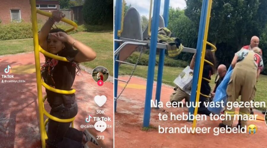 Caithlyn uit Nijkerk dacht nietsvermoedend in een klimrek in Hoevelaken te gaan zitten, maar al snel bleek dat ze geen kant meer op kon. Ze zat muurvast in een spiraal. Na een uur in die benarde positie te hebben gezeten is de brandweer van Hoevelaken gebeld en die heeft haar weten te bevrijden. Ze mocht zelfs een stukje houden van het speeltoestel. Het filmpje staat op Tiktok en wordt massaal bekeken. Foto TikTok