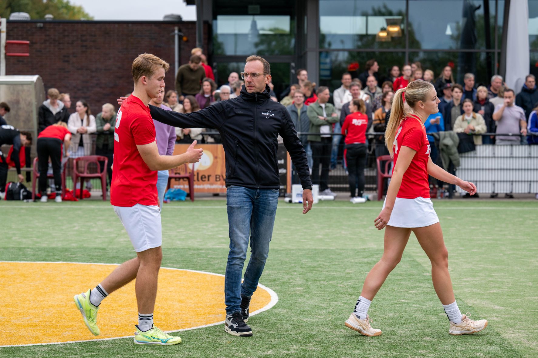 Tweemaal Zes bleef ondertussen koel en effectief. Toen de klok richting de slotfase tikte en de stand opliep naar 13-15, hing er aan Hoevelakense zijde nog een sprankje hoop in de lucht. Eén interceptie, één schot, één moment van euforie – het had voldoende kunnen zijn. Maar in plaats daarvan forceerden de bezoekers een strafworp, rondde die koelbloedig af en floot scheidsrechter Grotendorst – die overigens een puike wedstrijd leidde – direct voor het einde. Tweemaal Zes mocht feestend het veld af als terechte kampioen, terwijl Telstar zichtbaar teleurgesteld achterbleef. Toch overheerst de trots: het doel voorafgaand aan dit veldseizoen was simpelweg handhaving, en in plaats daarvan mocht men ruiken aan een kampioenschap en dromen van de hoofdklasse. Nu volgt een weekje rust en verwerking, waarna de blik vol vertrouwen richting de zaalcompetitie gaat. Hopelijk opnieuw met grote getalen publiek langs de lijn in sporthal De Slag – want als één ding duidelijk werd deze middag, is het dat Telstar niet alleen strijdt met karakter, maar ook speelt voor een vol en gepassioneerd publiek. Waarvoor heel erg dank! Foto’s: Dennis van Keulen
