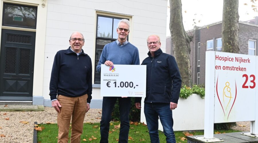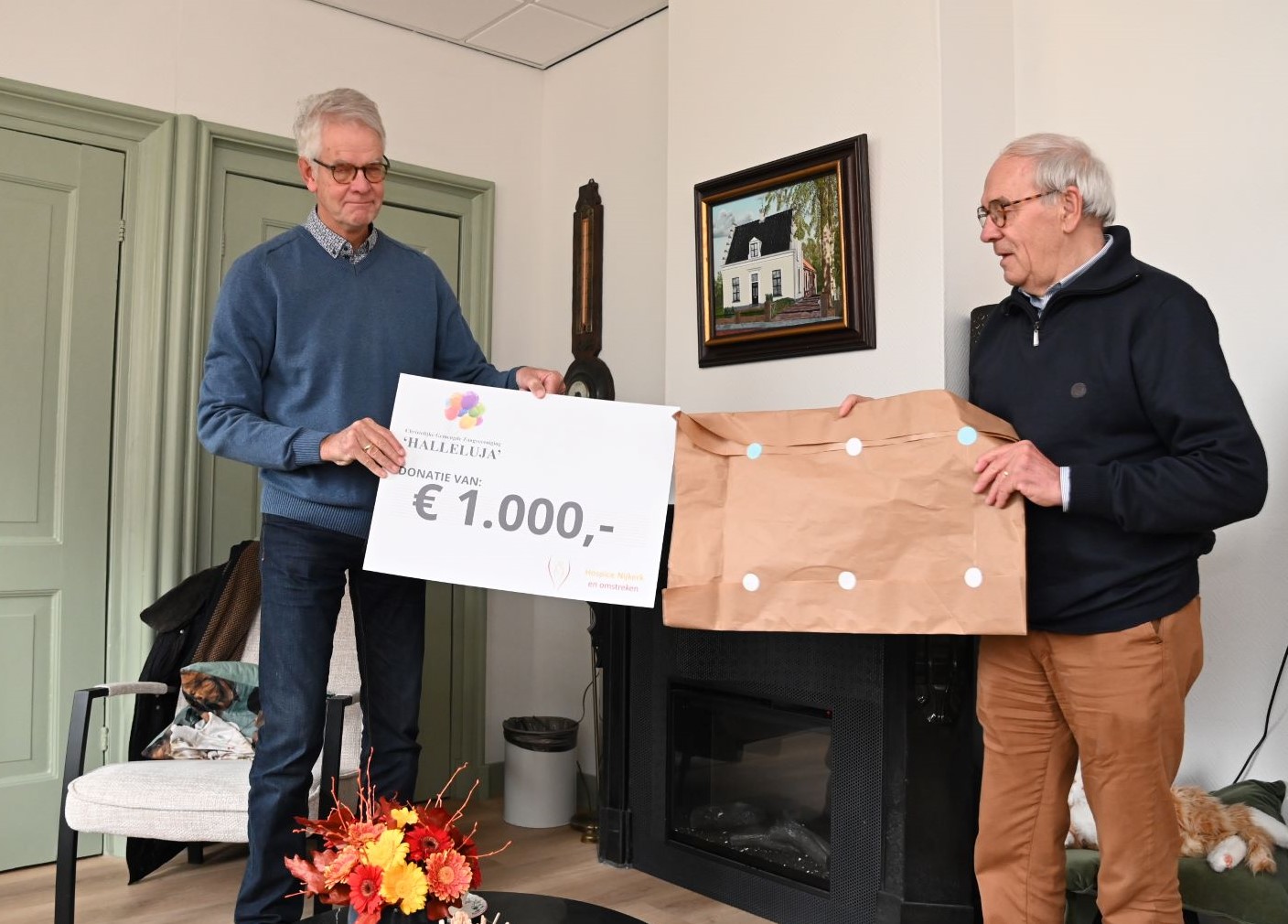 Hospice Nijkerk e.o. heeft donderdagmorgen 16 november een cheque ter waarde van €1.000,00 in ontvangst mogen nemen van het christelijk gemengde koor Halleluja uit Nijkerkerveen. Halleluja bestond onlangs honderd jaar en dat werd gevierd met een jubileumconcert, waar een collecte werd gehouden. Het bedrag van die collecte, aangevuld door het koor zelf, werd donderdag overhandigd aan voorzitter Peter van Hofwegen van Hospice Nijkerk e.o. Hofwegen zei op zijn beurt zeer dankbaar te zijn. Overigens is Halleluja na het jubileumconcert opgeheven wegens een toekomstig gebrek aan koorleden. Foto Kees van den Heuvel
