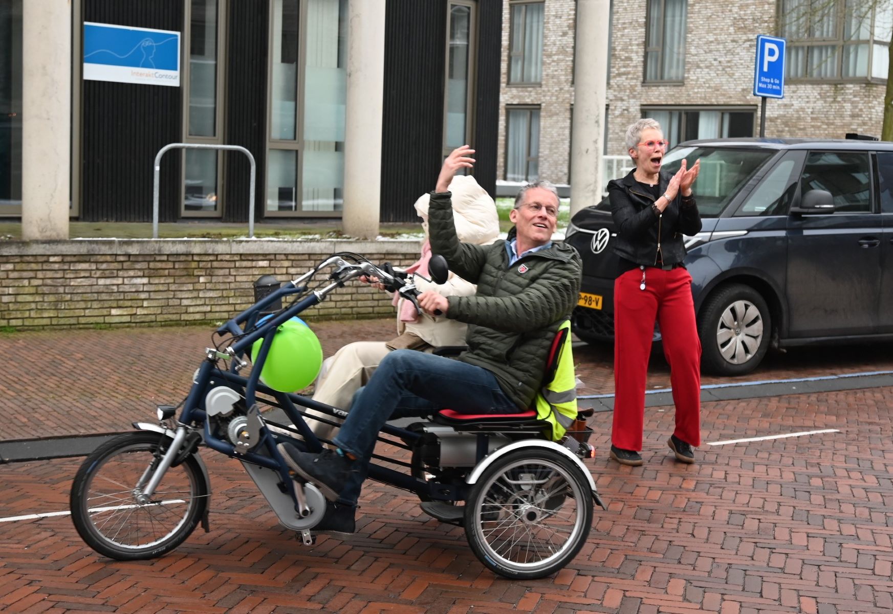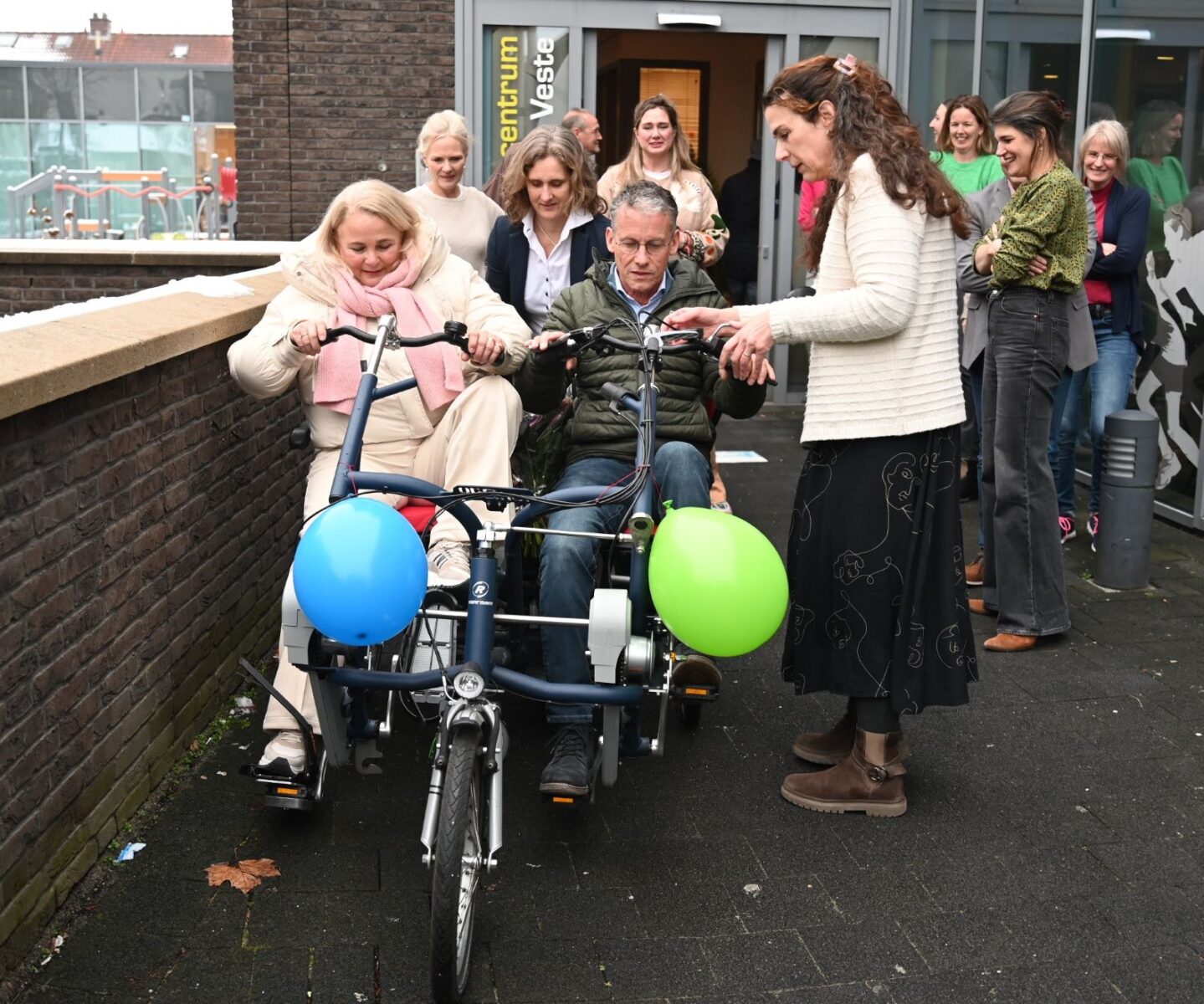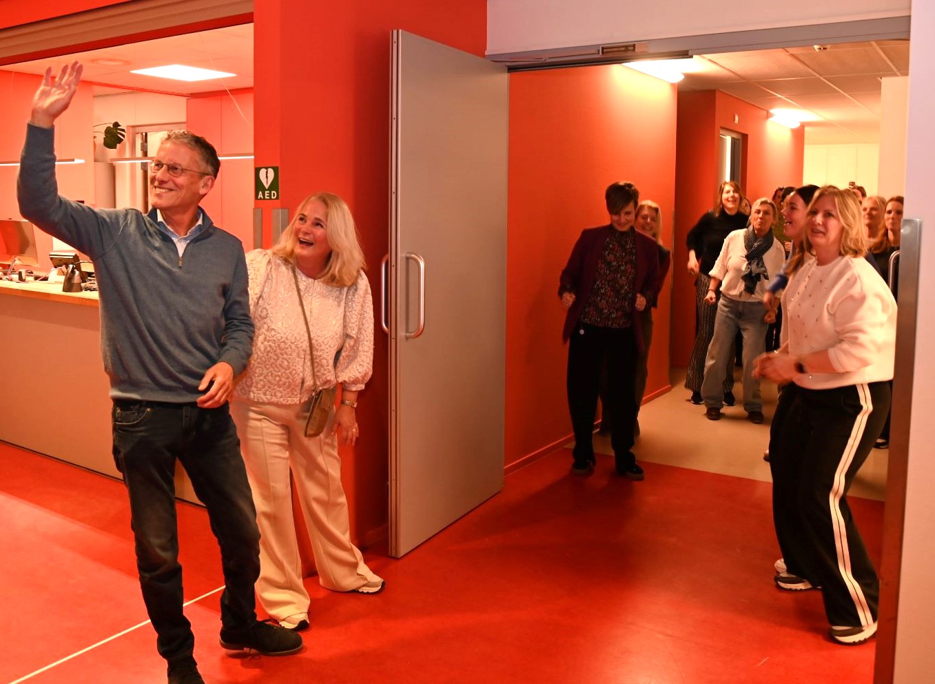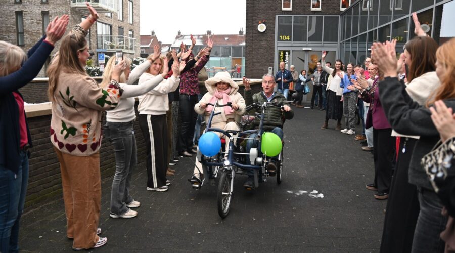 Huisarts Hans van Daalen heeft donderdagmiddag 29 januari afscheid genomen van de huisartsenpraktijk De Nije Veste in Nijkerk. Hij ging na 34 jaar met pensioen. Op ludieke wijze werden hij en zijn echtgenote uitgezwaaid. Op de klanken van “Viva la Vida” van Coldplay werd middels een soort flashmob afscheid genomen van het stel. Op iedere verdieping haakten steeds meer collega’s aan. Buiten aangekomen mochten Hans en zijn echtgenote plaatsnemen op een duofiets waarna ze naar het Koetshuis reden voor een receptie. De praktijk van Hans wordt voortgezet door huisarts mevrouw De Graaf, bijgestaan door de nieuwe huisartsen mevrouw Goedegebuure en de heer Van der Kaaij (per 1 juni). Foto Kees van den Heuvel
