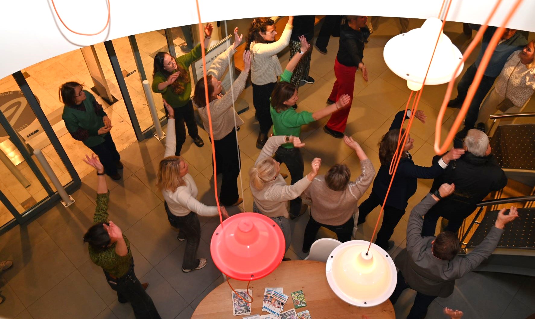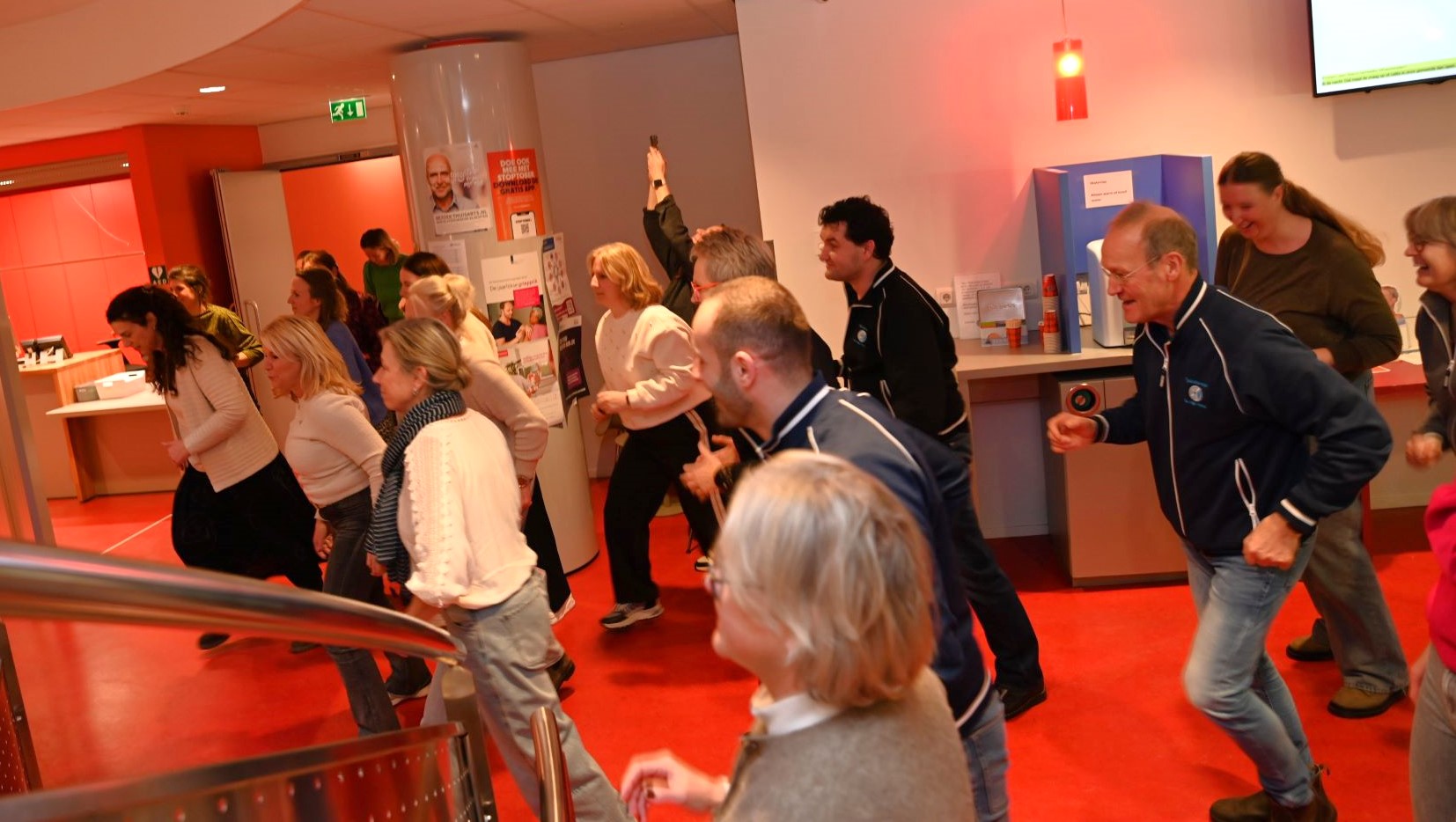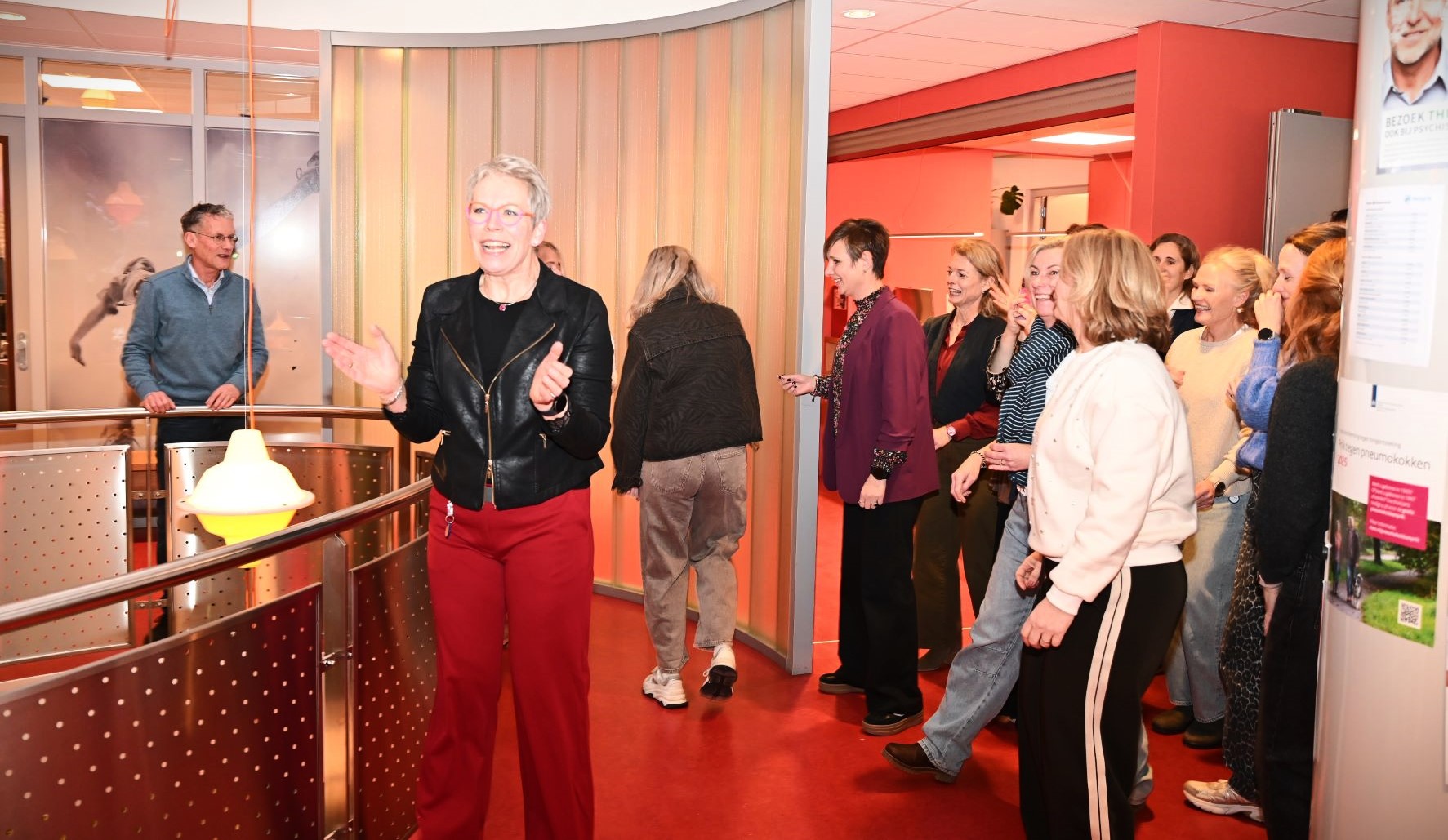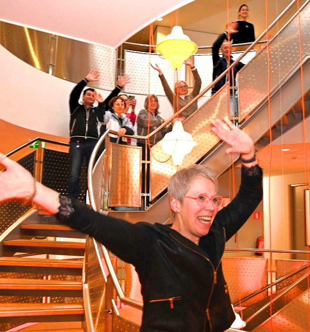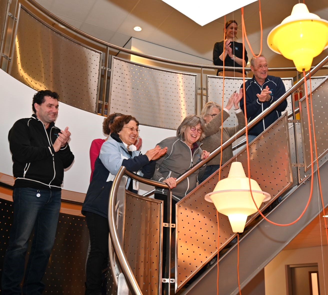 Huisarts Hans van Daalen heeft donderdagmiddag 29 januari afscheid genomen van de huisartsenpraktijk De Nije Veste in Nijkerk. Hij ging na 34 jaar met pensioen. Op ludieke wijze werden hij en zijn echtgenote uitgezwaaid. Op de klanken van “Viva la Vida” van Coldplay werd middels een soort flashmob afscheid genomen van het stel. Op iedere verdieping haakten steeds meer collega’s aan. Buiten aangekomen mochten Hans en zijn echtgenote plaatsnemen op een duofiets waarna ze naar het Koetshuis reden voor een receptie. De praktijk van Hans wordt voortgezet door huisarts mevrouw De Graaf, bijgestaan door de nieuwe huisartsen mevrouw Goedegebuure en de heer Van der Kaaij (per 1 juni). Foto Kees van den Heuvel