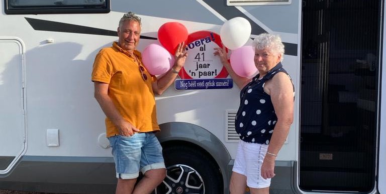 In Nederland is het baggerweer. Daar gaan we ons huwelijksfeest dus niet vieren, besloten Gert en Erna van Nieuwenhuizen uit Nijkerkerveen vastberaden. Ze trokken erop uit met de camper en vierden in Spanje het heuglijke feit dat ze 41 jaar waren getrouwd. Dat doen ze niet alleen, want met drie campers is familie en vrienden op pad door het warme zuiden van Europa. Bron Kees van den Heuvel