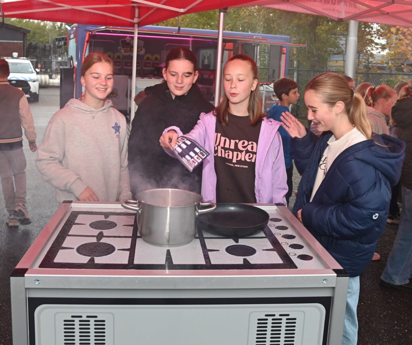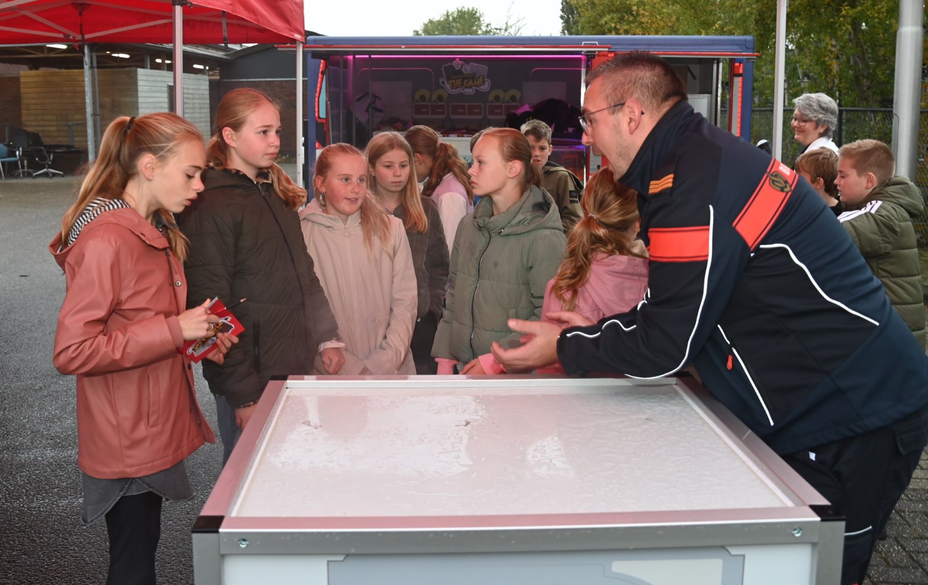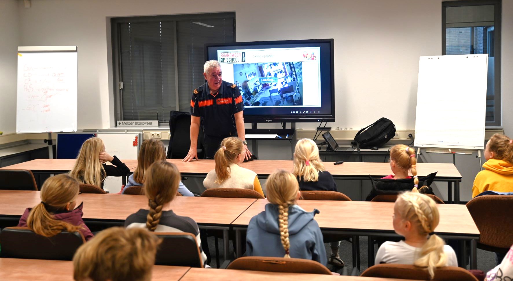 In oktober vinden de Nationale Brandpreventieweken plaats. Het thema is “Ik laad accuraat”, met aandacht voor het veilig gebruik van accu’s. De jeugd vormt de basis voor een brandveilige generatie. Daarom is de brandweer een bijzondere pilot gestart: het mobiele belevingscentrum. Groepen 7 en 8 van de Ichthusschool kregen maandag 6 oktober een interactieve les en beleefden zelf wat brand(on)veilig gedrag betekent. Bij het bezoek aan de brandweerkazerne was ook burgemeester De Jonge aanwezig. Foto Kees van den Heuvel