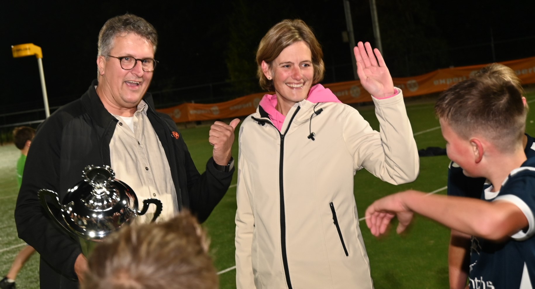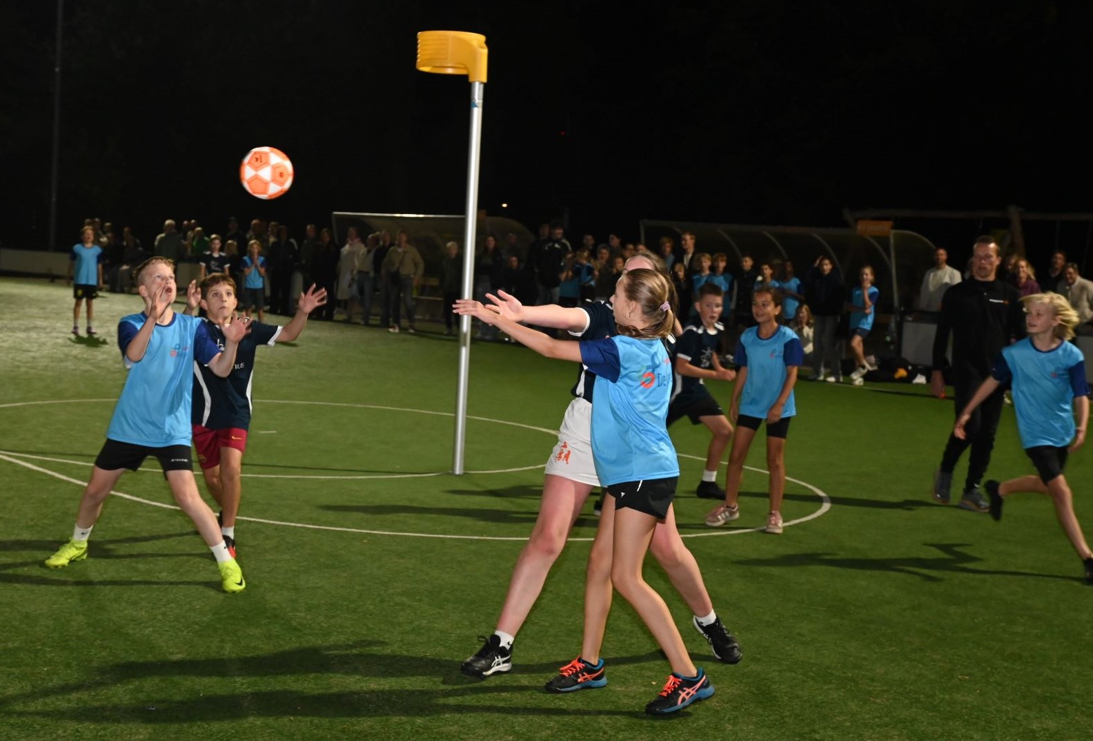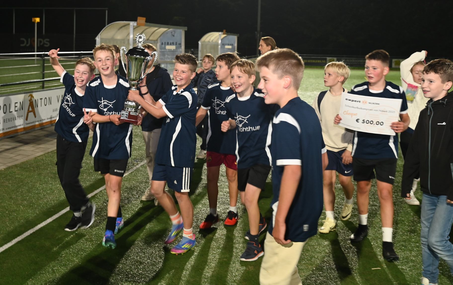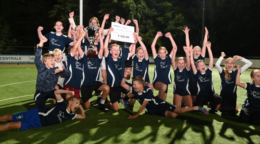 Vrijdagavond 26 september is de finale van het Gert Krijkamp Schoolkorfbal toernooi bij Sparta Korfbal in Nijkerk gewonnen door de Ichthusschool. Die ploeg won met 4-0 van de Maranathaschool. De Ichthusschool ontving de beker met de grote oren en is opvolger van de Rehobothschool dat vorig jaar won. Het is voor de begeleidster van de Ichthusschool de derde keer achter elkaar dat ze de hoofdprijs winnen. Uit handen van Jan Gardebroek van sponsor Expert Gardebroek uit Nijkerk ontving de Ichthusschool de beker. Bovendien krijgt de school een cheque ter waarde van 500 euro om vrij te besteden. Foto’s Kees van den Heuvel
