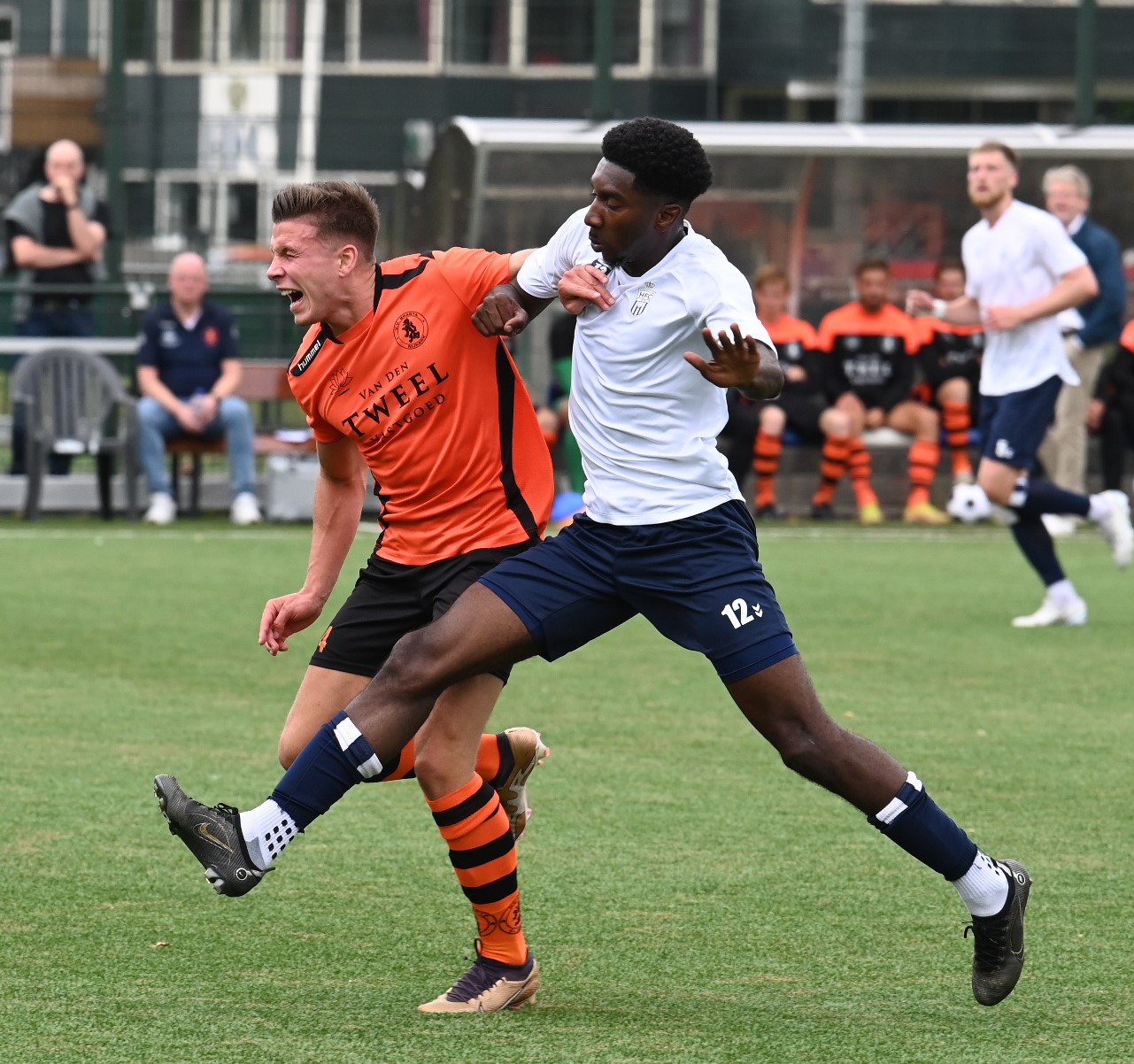 Sparta Nijkerk heeft een zeer goed begin van het seizoen achter de rug. In de eerste oefenwedstrijd zaterdag 22 juli tegen tweede divisionist Koninklijke HFC uit Haarlem werd het 2-4. Vooral in het eerste kwartier kende Sparta in Haarlem een ijzersterke start. Toen had het ook zomaar 0-5 kunnen staan. Al na drie minuten kreeg Marc van der Weijden een penalty toegewezen na een overtreding in het strafschopgebied. Hij mocht zelf achter de bal plaatsnemen. Aanvankelijk werd de bal gepareerd door de keeper maar in de rebound ging de bal er alsnog in. Nog geen minuut later scoorde Christos Ibrahim met een ongenadig mooie krulbal de 0-2, een wereldgoal vanaf een meter of twintig. Na nog twee minuten werd wederom een penalty toegewezen na een overtreding op uitblinker Kevin Sterling. Marc van der Weijden mocht opnieuw plaatsnemen achter de bal maar ditmaal miste hij. Sterling zag daarna nog een bal langszij gaan en Marc van der Weijden zag na tien minuten de bal opnieuw gekeerd door de keeper van HFC maar anders zat er een echt een stunt in het verschiet tegen de club uit Haarlem. In de tweede helft nam Sparta wat gas terug en kwam nog maar sporadisch bij de goal van de tegenstander, maar als ze er waren werd er ook raak geschoten. Er waren goals van Frank Heus die geblesseerd het veld verliet en Stefano Fransberg. HFC dat in de tweede helft veel beter stond, scoorde tegen middels goals van Veerman en Yuya. Na afloop van de wedstrijd was trainer Eric Speelziek trots op zijn jongens. ‘We hebben slechts één trainingsweek gehad. We waren vooral bezig met het spel zonder bal, de intensiteit van het druk zetten. Van de vier goals kwamen er drie vandaan vandaag. Dat hebben ze heel goed gedaan.’’ Kevin Sterling was in de ogen van de verslaggever de allerbeste speler, ofschoon hij niet scoorde. ‘Ja geweldig. Hij is heel goed. We hebben meer snelheid en agressie voorin erbij gekregen. Ook Christos Ibrahim heeft het hartstikke goed gedaan. Die maakte die fantastische tweede goal.’ Volgens Speelziek had daarmee vorig seizoen wellicht het verschil kunnen zijn gemaakt. ‘Maar ik ben vooral tevreden wat we getraind hebben. Balbezit, vooruit lopen met zeven mensen. Dit biedt perspectief. We spelen met veel jonge jongens. Veel basisspelers waren er niet. Er kwamen er vijf uit de onder 23.’ De zeven ontbrekende selectieleden voegen zich maandag bij de groep. ‘Het zou mooi zijn als we vrijdag tegen IJsselmeervogels weer zo starten.’ Foto’s en verslag/interview Kees van den Heuvel