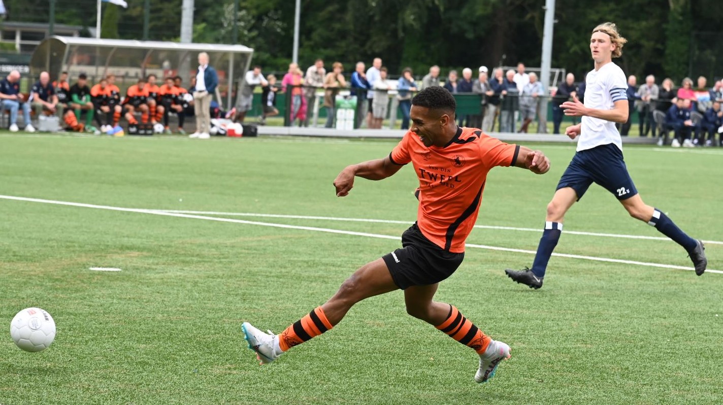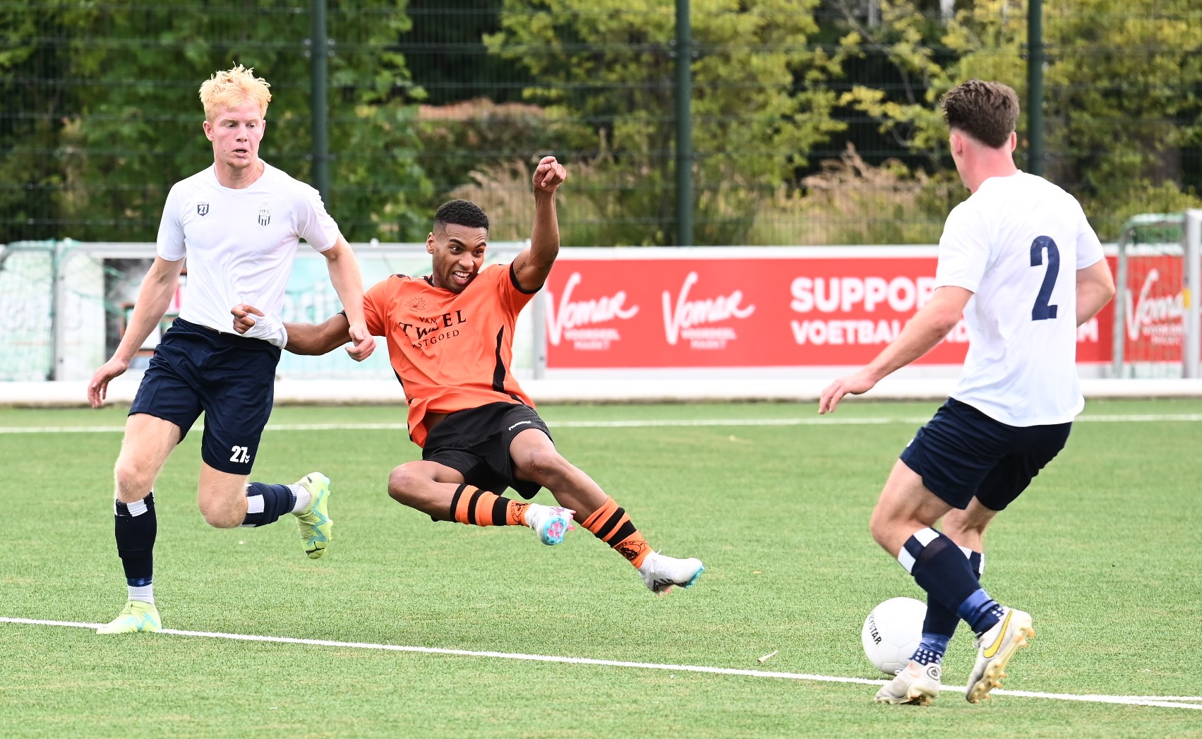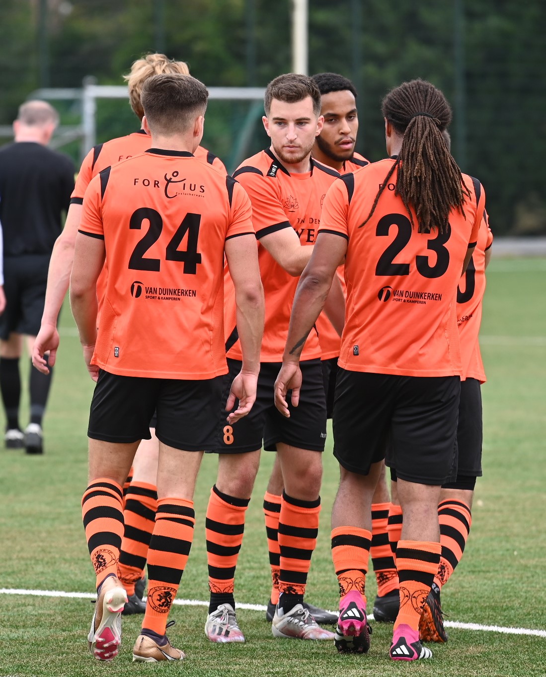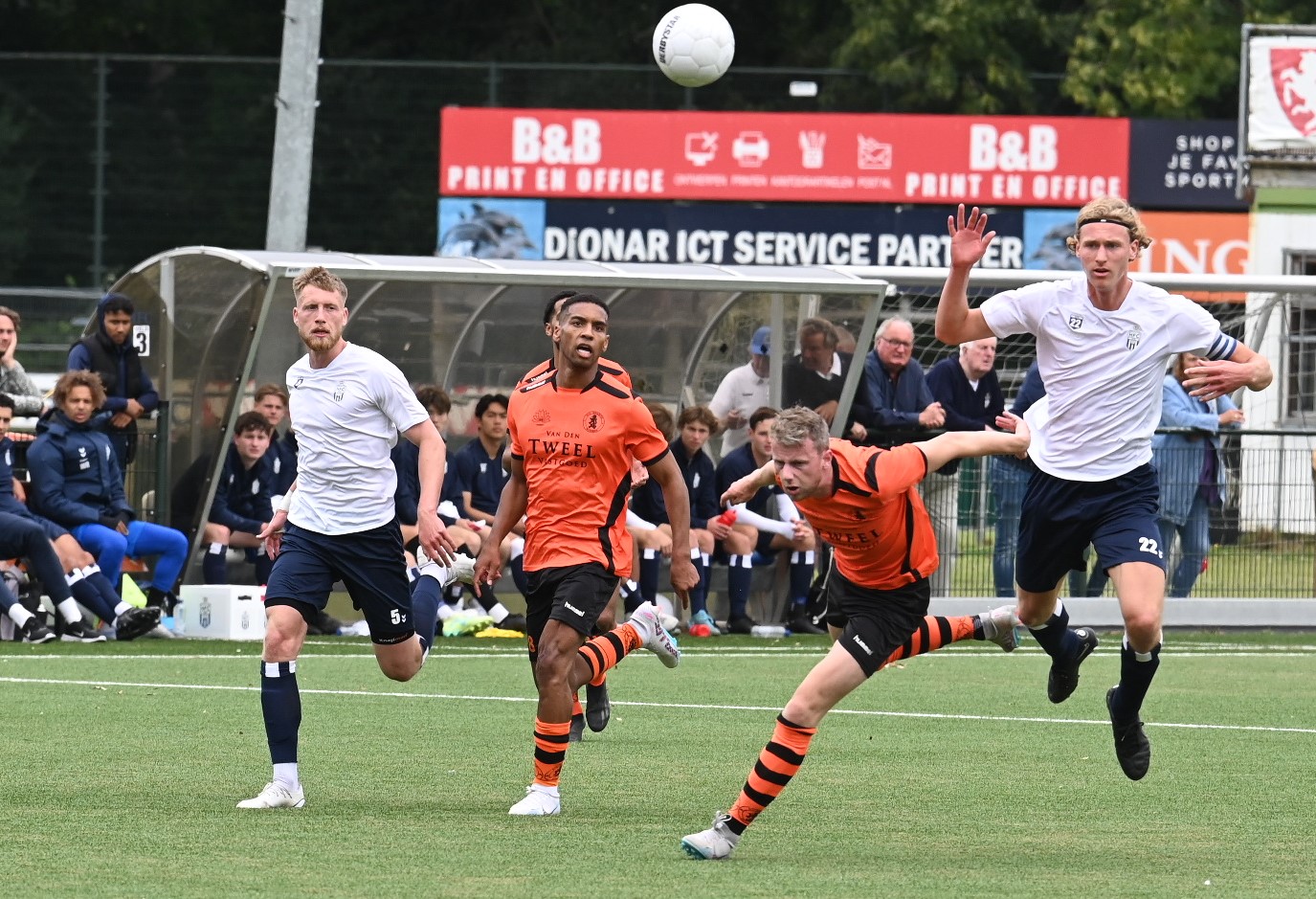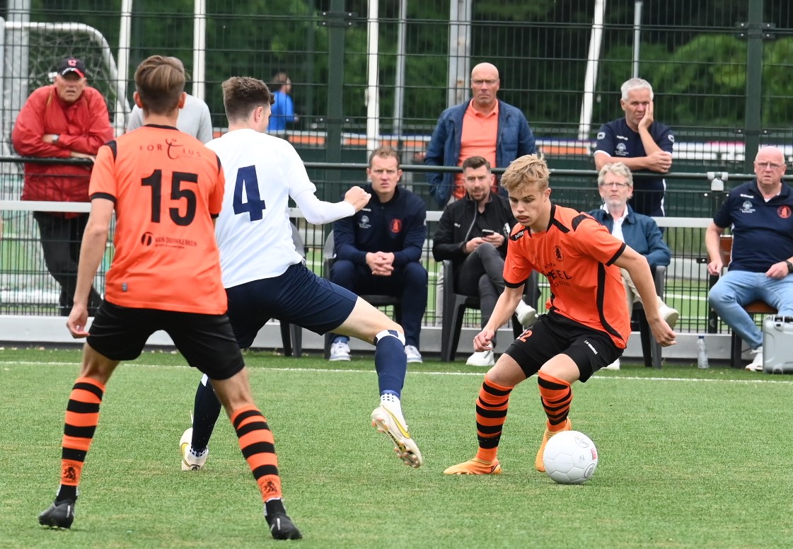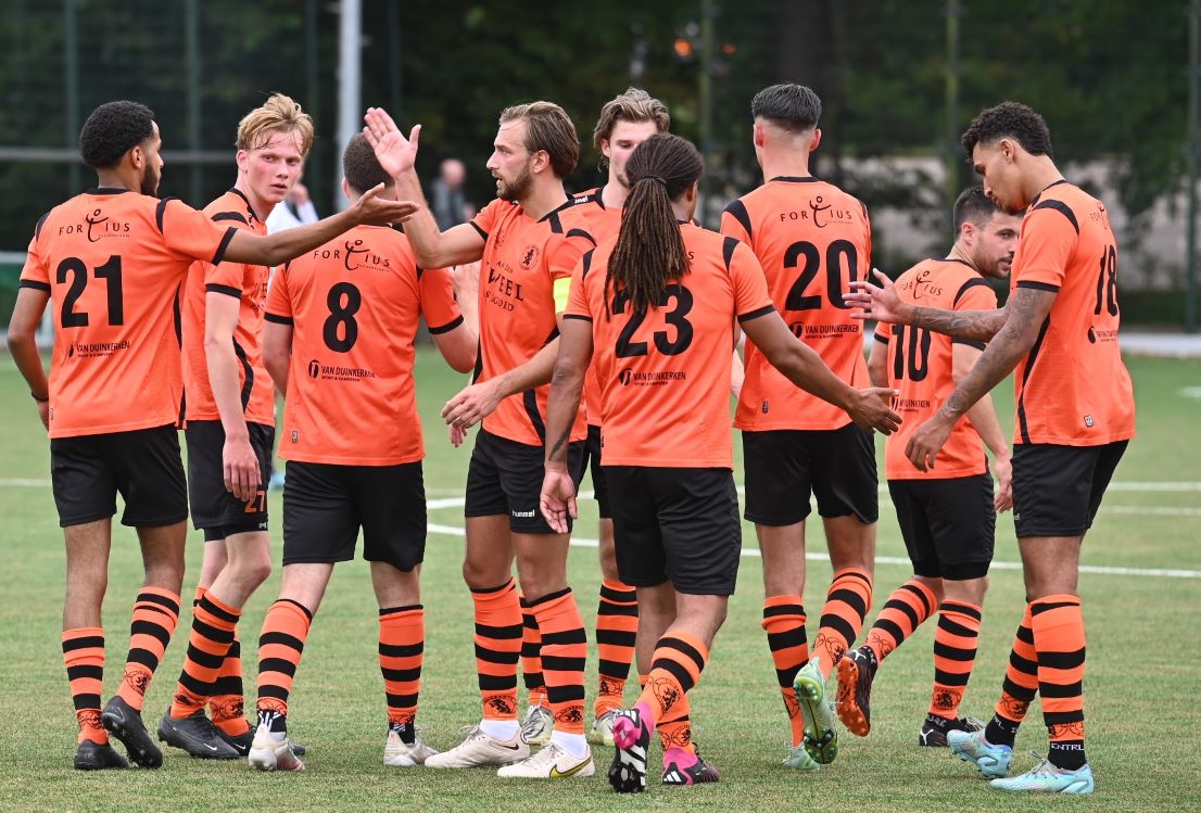 Sparta Nijkerk heeft een zeer goed begin van het seizoen achter de rug. In de eerste oefenwedstrijd zaterdag 22 juli tegen tweede divisionist Koninklijke HFC uit Haarlem werd het 2-4. Vooral in het eerste kwartier kende Sparta in Haarlem een ijzersterke start. Toen had het ook zomaar 0-5 kunnen staan. Al na drie minuten kreeg Marc van der Weijden een penalty toegewezen na een overtreding in het strafschopgebied. Hij mocht zelf achter de bal plaatsnemen. Aanvankelijk werd de bal gepareerd door de keeper maar in de rebound ging de bal er alsnog in. Nog geen minuut later scoorde Christos Ibrahim met een ongenadig mooie krulbal de 0-2, een wereldgoal vanaf een meter of twintig. Na nog twee minuten werd wederom een penalty toegewezen na een overtreding op uitblinker Kevin Sterling. Marc van der Weijden mocht opnieuw plaatsnemen achter de bal maar ditmaal miste hij. Sterling zag daarna nog een bal langszij gaan en Marc van der Weijden zag na tien minuten de bal opnieuw gekeerd door de keeper van HFC maar anders zat er een echt een stunt in het verschiet tegen de club uit Haarlem. In de tweede helft nam Sparta wat gas terug en kwam nog maar sporadisch bij de goal van de tegenstander, maar als ze er waren werd er ook raak geschoten. Er waren goals van Frank Heus die geblesseerd het veld verliet en Stefano Fransberg. HFC dat in de tweede helft veel beter stond, scoorde tegen middels goals van Veerman en Yuya. Na afloop van de wedstrijd was trainer Eric Speelziek trots op zijn jongens. ‘We hebben slechts één trainingsweek gehad. We waren vooral bezig met het spel zonder bal, de intensiteit van het druk zetten. Van de vier goals kwamen er drie vandaan vandaag. Dat hebben ze heel goed gedaan.’’ Kevin Sterling was in de ogen van de verslaggever de allerbeste speler, ofschoon hij niet scoorde. ‘Ja geweldig. Hij is heel goed. We hebben meer snelheid en agressie voorin erbij gekregen. Ook Christos Ibrahim heeft het hartstikke goed gedaan. Die maakte die fantastische tweede goal.’ Volgens Speelziek had daarmee vorig seizoen wellicht het verschil kunnen zijn gemaakt. ‘Maar ik ben vooral tevreden wat we getraind hebben. Balbezit, vooruit lopen met zeven mensen. Dit biedt perspectief. We spelen met veel jonge jongens. Veel basisspelers waren er niet. Er kwamen er vijf uit de onder 23.’ De zeven ontbrekende selectieleden voegen zich maandag bij de groep. ‘Het zou mooi zijn als we vrijdag tegen IJsselmeervogels weer zo starten.’ Foto’s en verslag/interview Kees van den Heuvel