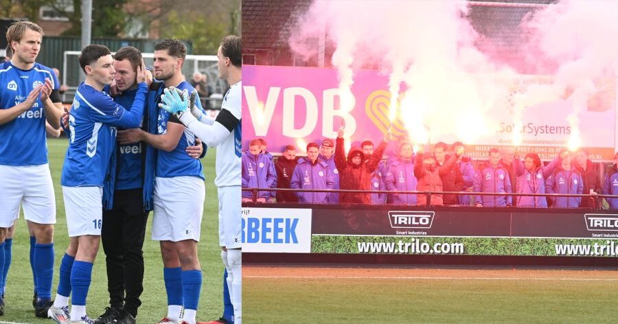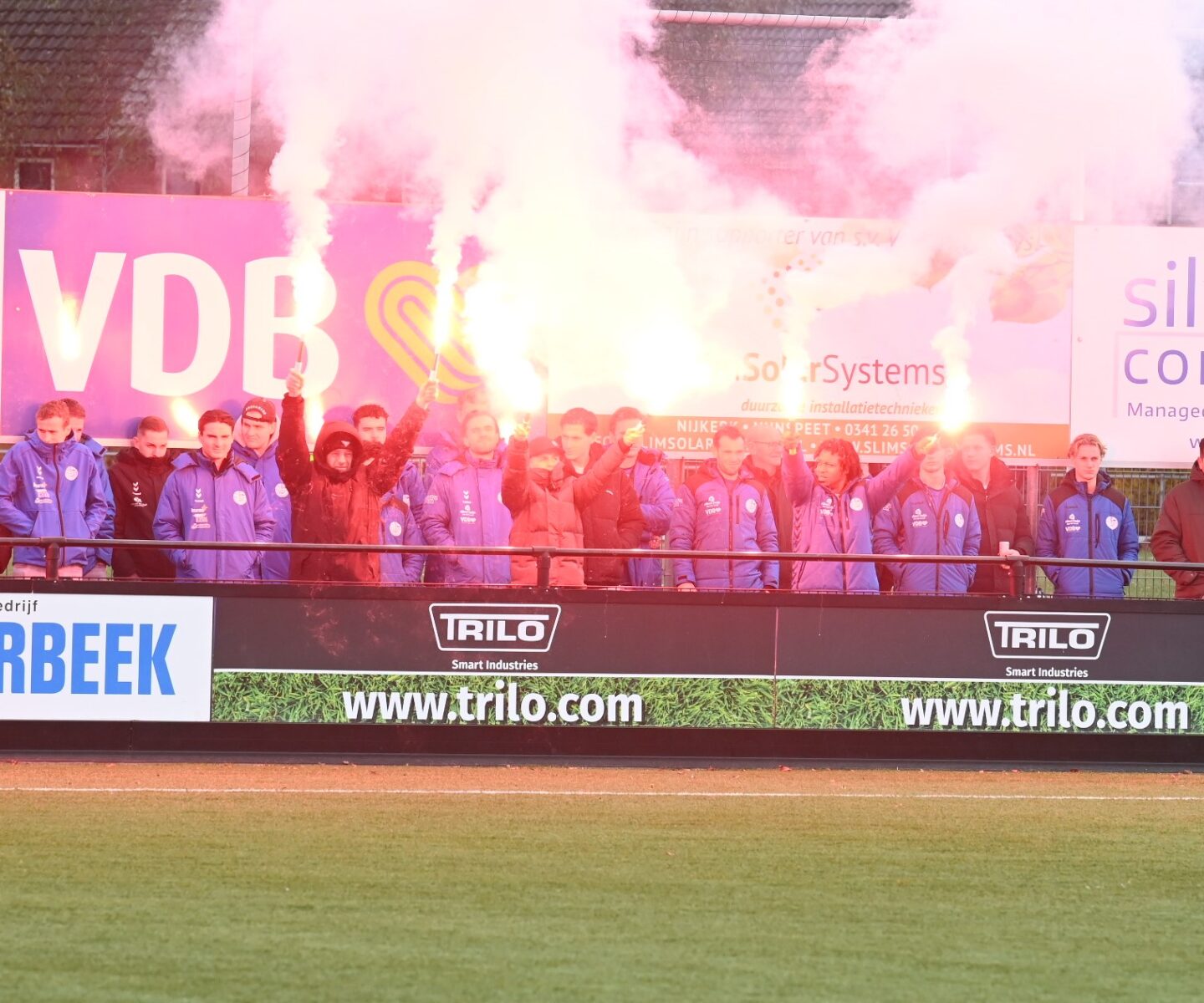 Op zeer indrukwekkende wijze heeft Veensche Boys een eerbetoon gebracht ter nagedachtenis aan het overlijden van Lars Doppenberg, broer van eerste elftalspeler Rik Doppenberg. Er was een minuut stilte en er werden toortsen afgestoken. Met dit moment van bezinning wilde de voetbalvereniging aangeven dat ze met heel haar hart aanwezig is bij het verdriet van de familie Doppenberg. Ook de tegenstander VVOG en het scheidsrechtertrio heeft haar condoleance overgebracht. Foto Kees van den Heuvel