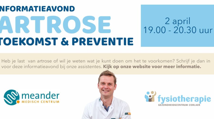 Op donderdag 2 april 2026 organiseert Fysiotherapiepraktijk Corlaer een voorlichtingsavond over artrose. Deze avond staat in het teken van de toekomst en preventie. Wat kun je zelf doen om klachten te verminderen of te voorkomen? En welke ontwikkelingen zijn er op het gebied van behandeling? Tijdens de avond delen een orthopeed uit het Meander Medisch Centrum en twee fysiotherapeuten hun kennis en ervaring. Zij geven inzicht in het ontstaan van artrose, de nieuwste behandelmethoden en praktische adviezen voor het dagelijks leven. Er is volop ruimte om vragen te stellen en in gesprek te gaan. Deelname aan deze avond is gratis. Iedereen met interesse in artrose, preventie en gezond bewegen is van harte welkom.