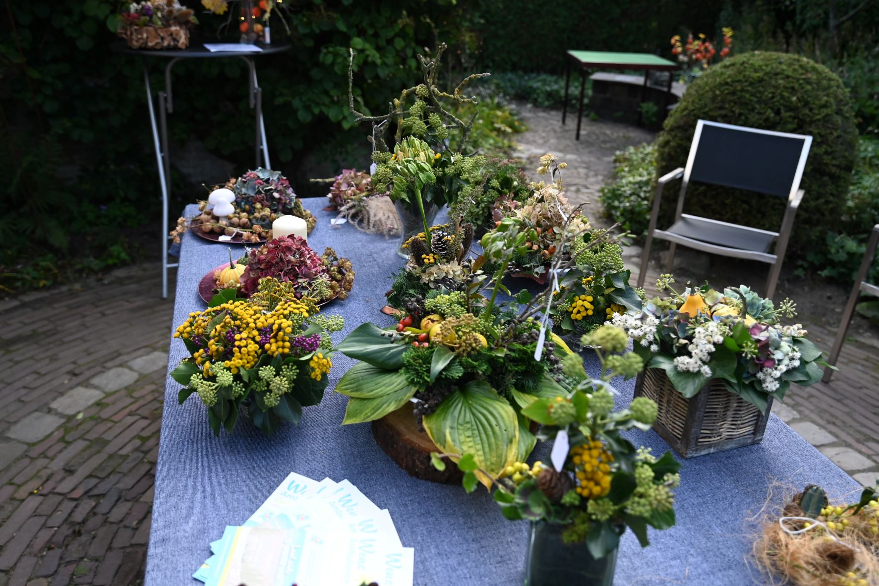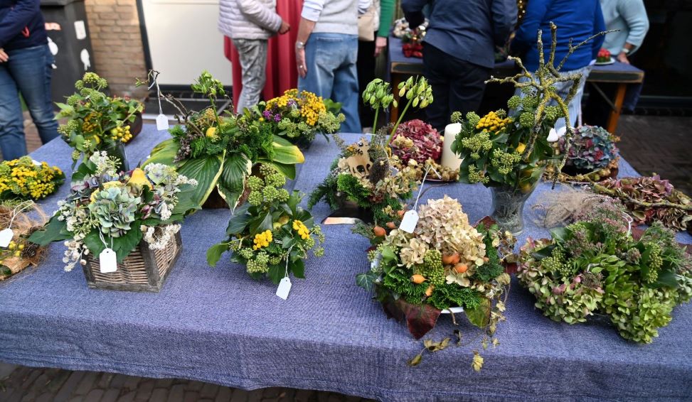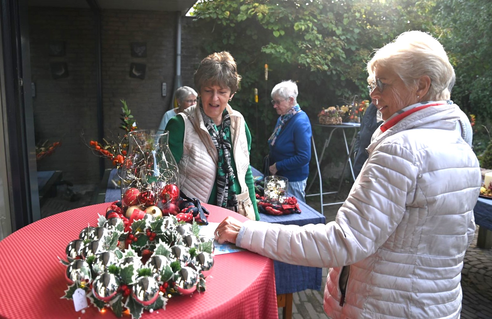 De Nijkerkse afdeling van serviceclub Inner Wheel voert actie voor de WAG Wensambulance Gelderland. Inner Wheel wil daarmee bijdragen aan de vervulling van wensen van mensen die zelf niet meer kunnen reizen. Inner Wheel verkoopt bloemstukken en kransen die ze zelf hebben gemaakt. Donderdag 3 oktober was er een verkoopmiddag op de Ulst in Nijkerk, maar Inner Wheel is ook aanwezig op de Ossenmarkt in Putten, welke woensdag 8 oktober wordt gehouden. Iedereen die dat wil kan een donatie doen voor Inner Wheel. Foto Kees van den Heuvel