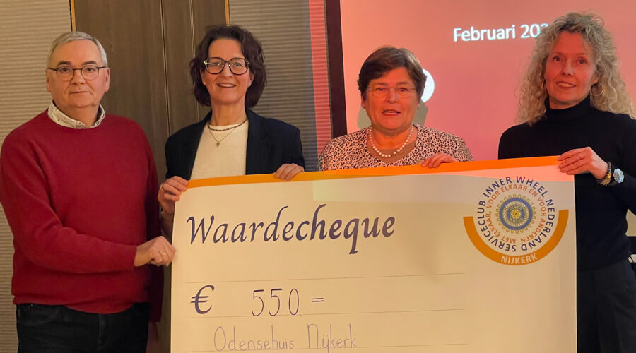 Op de bijeenkomst van de serviceclub Inner Wheel Nijkerk werd maandag 9 februari een cheque ter waarde van 550 euro overhandigd aan de mede-initiator van het Odensehuis in Nijkerk Harry van den Ham (links) en vrijwilligerscoördinator Marloes Mighelsen van het Odensehuis (tweede van links). Het geld werd overhandigd door twee Inner Wheelsters: Greet van den Ham (tweede van rechts) en Ingrid Overduin (rechts).