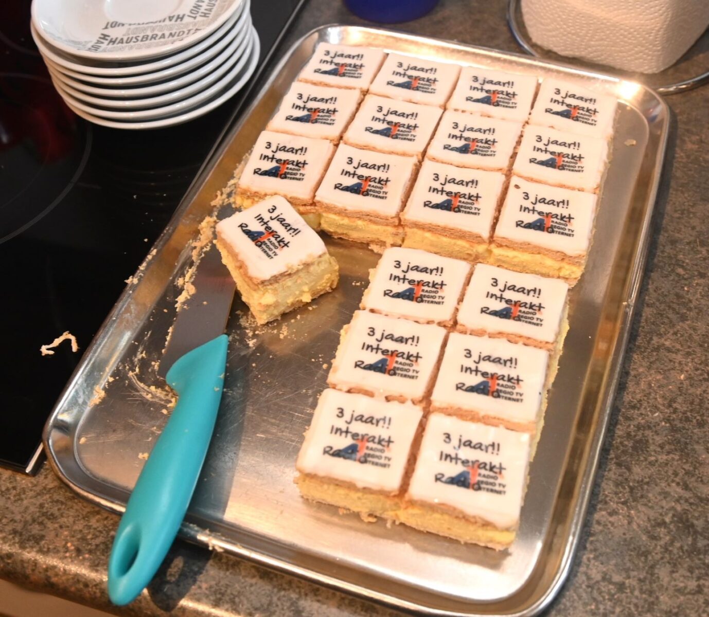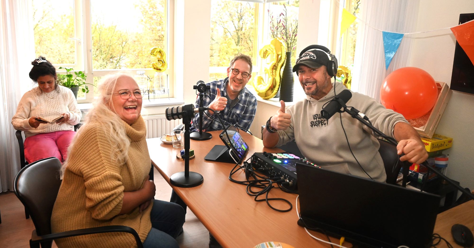 Interakt Radio, uitgezonden bij A1 Mediagroep, bestond dinsdag 21 november precies drie jaar. Dat werd gevierd in de flat Silverstate bij De Pol in Nijkerk, waar een radiostudio was ingericht en een drukte van belang heerste. Voor iedereen was er taart en er kon naar hartenlust wordt gedanst. Iedere dinsdag wordt een bijzondere radio-uitzending verzorgd voor bewoners en medewerkers van InteraktContour woonlocatie in Nijkerk. En het wordt steeds beter beluisterd. Door het hele land heen wordt het verzoekplatenprogramma van Jeroen Brons en Frans Kas integraal uitgezonden. Het project is ooit begonnen in samenwerking met zorgassistent Lynn van Waas, die dinsdag eveneens aanwezig was. Zij is samen met Jeroen Brons, die kampt met niet aangeboren hersenletsel, initiatiefnemer van het programma. ‘Het programma brengt grote verbondenheid binnen de doelgroep,’ meent ze. ‘Sinds corona organiseer ik dagelijks activiteiten met bewoners op de woonlocatie. Daarbij staat altijd de muziek aan. Muziek is belangrijk, het verbindt, roept herinneringen op en geeft je een goed gevoel. Na afloop draai ik altijd een verzoeknummer en zo is onze playlist ontstaan.” Wat zou het toch leuk zijn als deze eens werd gedraaid op de radio, zei Lynn tegen Jeroen. Waarop hij reageerde: “Dat kan ik wel regelen, ik werk tenslotte bij de radio!”. En zo geschiedde. Jeroen en Lynn spraken vervolgens met Erik-Jan de Dreu, coördinator radio bij Mediagroep A1. Aangestoken door hun enthousiasme wilde hij daar zeker zendtijd beschikbaar voor stellen. Extra bijzonder voor bewoners was dat ‘hun’ programma door Frans Kas werd gepresenteerd. Als Franky Stardust trad hij eerder een aantal keer voor bewoners op. Sindsdien zijn zij fan van hem. Het programma is elke dinsdagmiddag te beluisteren bij A1 Mediagroep van 15.00 tot 17.00 uur. InteraktContour is er voor mensen die problemen ervaren als gevolg van hersenletsel, na bijvoorbeeld een beroerte, ongeluk of hersentumor. Foto Kees van den Heuvel