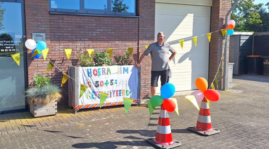 Jim van den Bosch uit Nijkerkerveen is 55 jaar geworden. Hij werd nietsvermoedend verrast door zijn vrienden, Terwijl Jim en Chantal op de terugreis reden van Oostenrijk naar Nederland, hebben vrienden een klein beetje de boel versierd. Jim was diep onder de indruk.