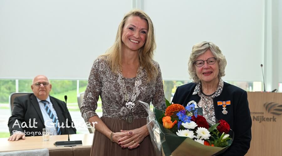 Tijdens de jaarlijkse lintjesregen heeft burgemeester Tinet de Jonge vrijdagmorgen 24 april een Koninklijke onderscheiding uitgereikt aan mevrouw Joke van Doornik-Vermeer (75). Vanwege haar uitzonderlijke en langdurige vrijwillige inzet voor de Nijkerkse samenleving is zij benoemd tot Lid in de Orde van Oranje-Nassau. Burgemeester De Jonge prees mevrouw Van Doornik-Vermeer voor haar onbezoldigde werkzaamheden die inmiddels bijna veertig jaar beslaan. De indrukwekkende staat van dienst van de decoranda begon in 1986. Gedurende 17 jaar leidde zij als presidente de vrouwenvereniging Lydia in Nijkerkerveen. Haar bestuurlijke kwaliteiten zette zij later voort bij vrouwenvereniging Sola Scriptura in Nijkerk, waar zij vanaf 2004 ruim 16 jaar lang de kar trok. Naast haar bestuurlijke rollen toonde mevrouw Van Doornik-Vermeer een groot hart voor de kwetsbare medemens. Tussen 2003 en 2019 was zij een bekend gezicht in woonzorgcentrum Amaris Arkemheen. Daar verzorgde zij niet alleen de koffiemomenten, maar bood zij vooral steun aan eenzame ouderen tijdens de stille avonduren. De laatste jaren ligt het zwaartepunt van haar werk bij Hospice Nijkerk. Sinds 2015 is zij daar als zorgvrijwilliger actief. Met grote toewijding en empathie begeleidt zij gasten in hun laatste levensfase, een rol waarin haar zorgzame karakter volledig tot zijn recht komt. tekst Kees van den Heuvel, foto Aalt Guliker