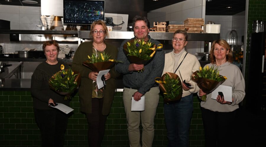 Tijdens de ledenvergadering van de Zonnebloem, afdeling Nijkerk/Nijkerkerveen zijn jubilarissen gehuldigd in een nieuwe categorie. Dat was de groep 5-jarigen. De leden Pea van Hussel, Eveline van Soeren, Aalt van de Bunt, Gerda Klompenhouwer, Ellie Pater en Monique Waerts werden in de bloemen gezet. Foto Kees van den Heuvel