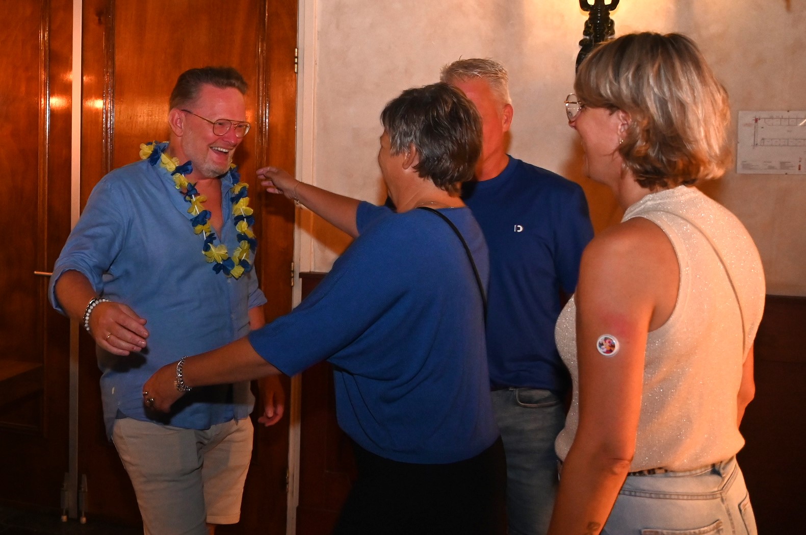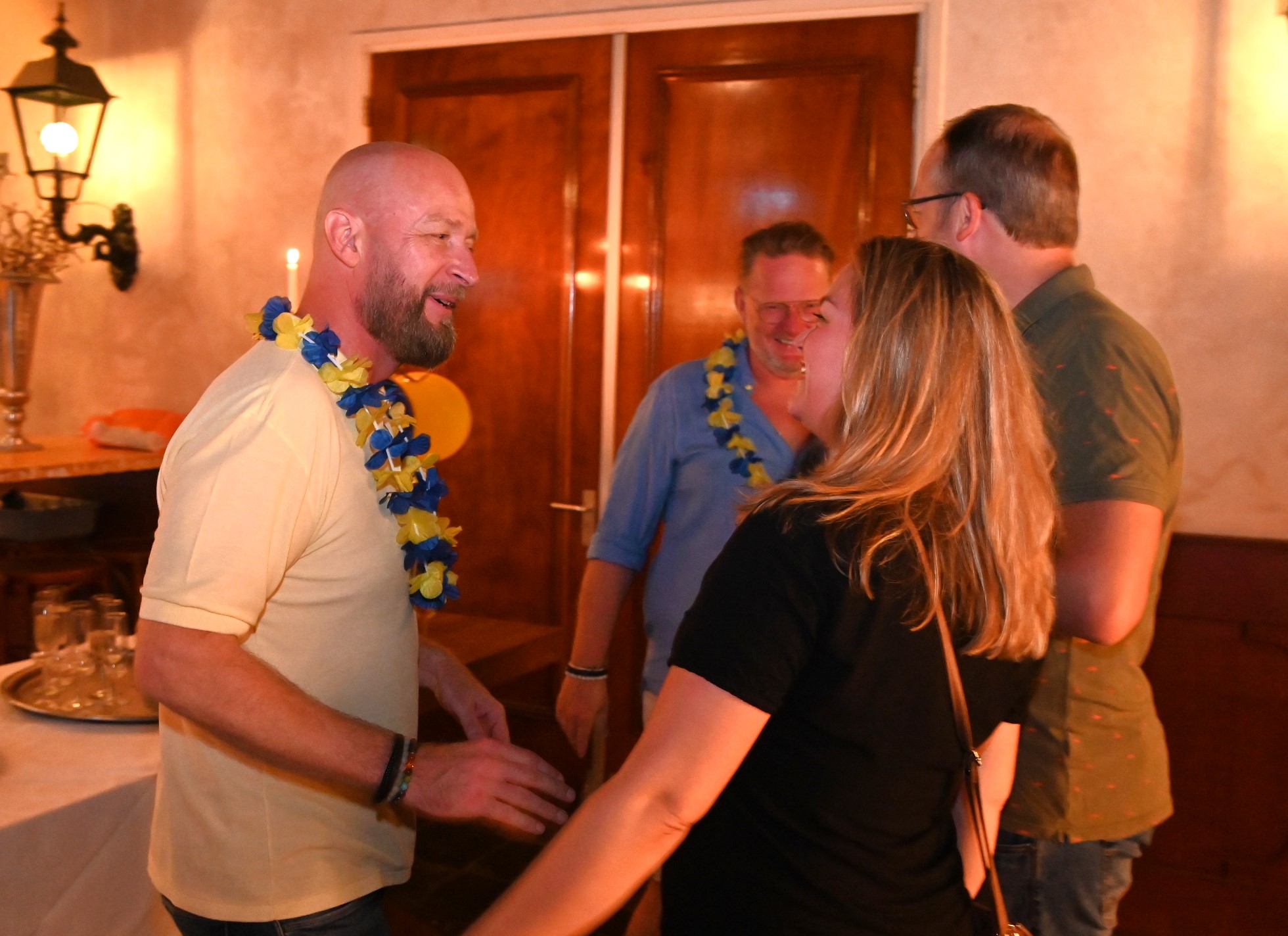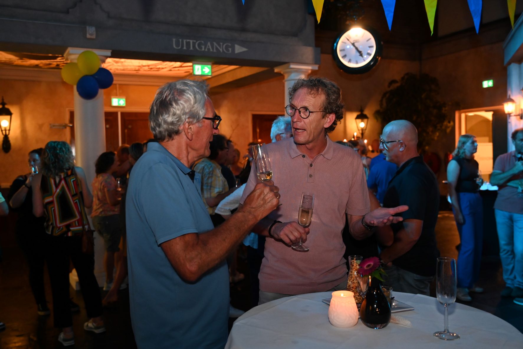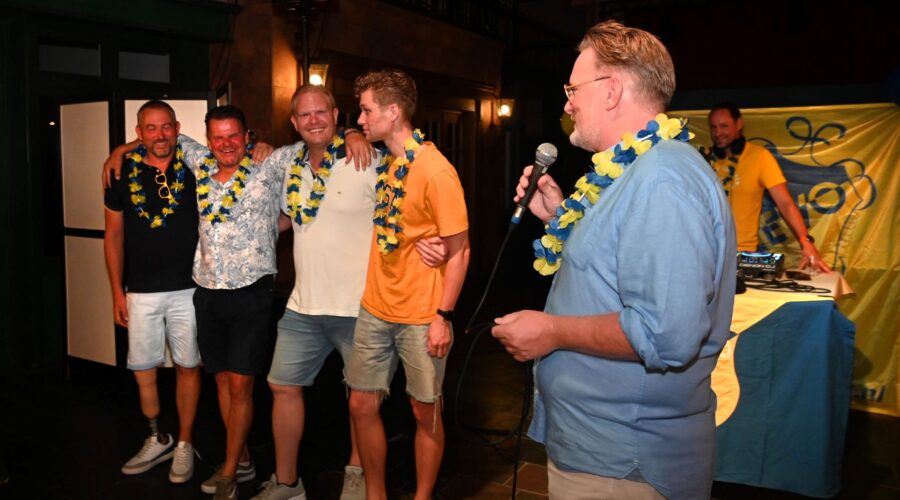 Waterpolo- en zwemvereniging Flevo Nijkerk heeft zaterdagavond 9 september haar jubileumfeest gevierd in Kade10. Met het feest, dat ook een soort reünie bleek, werd herdacht dat de vereniging negentig jaar bestaat en daarmee één van de oudste clubs van Nijkerk is. Zouden de oprichters van destijds beseffen dat nu negentig jaar later in de voormalige T.O.C. het jubileum zou worden gevierd, sprak voorzitter Henno Koelewijn hardop uit. Hij refereerde tevens aan de woorden die Jan van de Veen uitsprak bij het 75-jarige jubileum van mister Flevo Henk Klok. ‘Bij Flevo word je ondeugend.’ En daarom werd een heel ondeugend feestje gevierd met een DJ en diverse artiesten. Tijdens de toespraak van voorzitter Koelewijn werden ook de vier organisatoren van het jubileumfeest in het zonnetje gezet. Foto Kees van den Heuvel