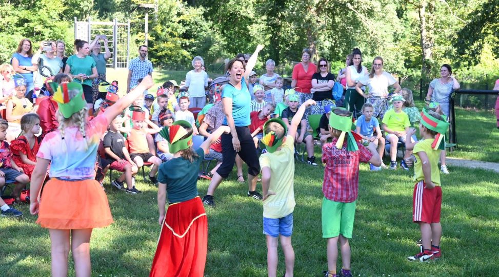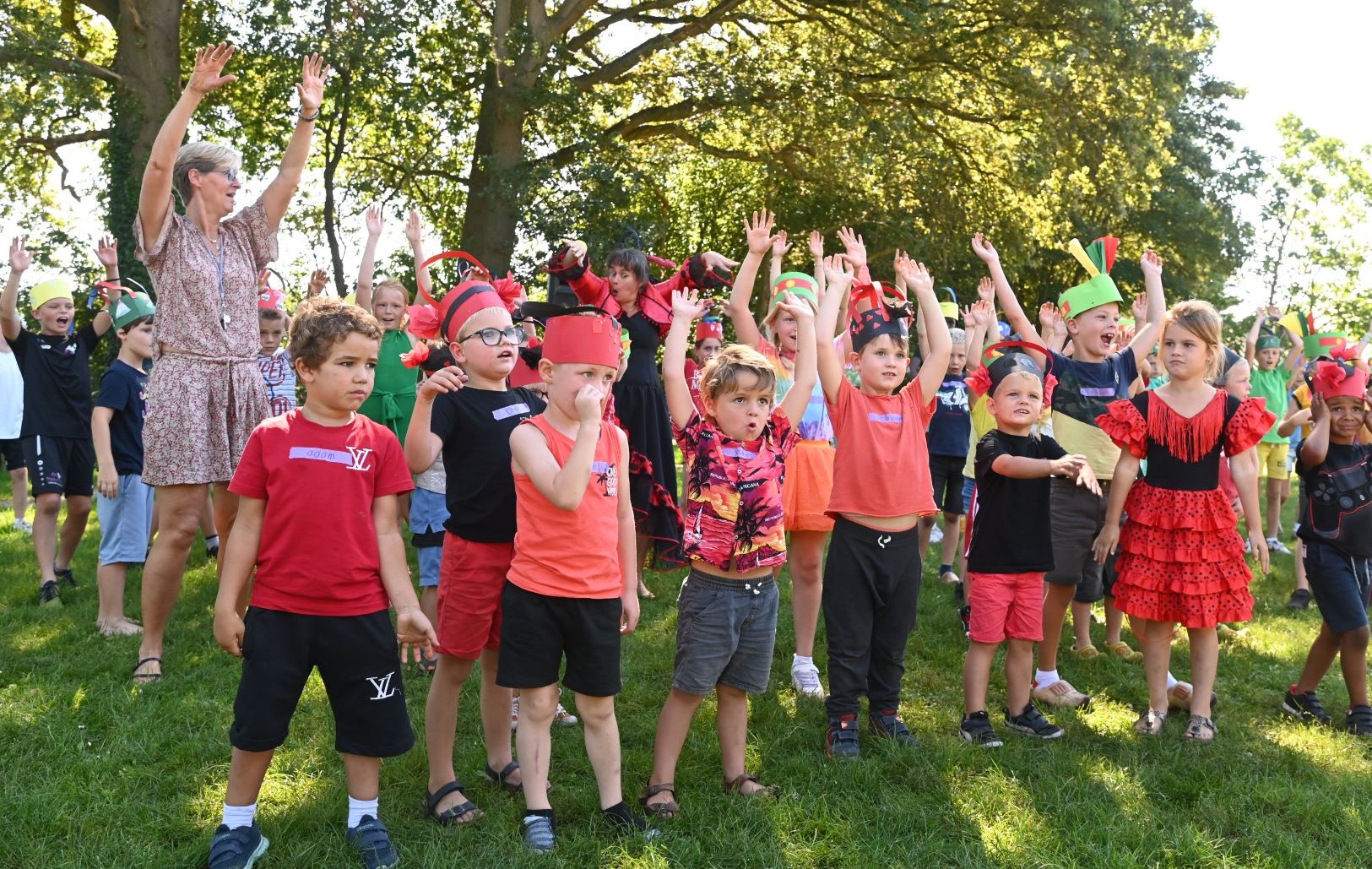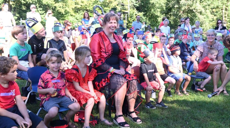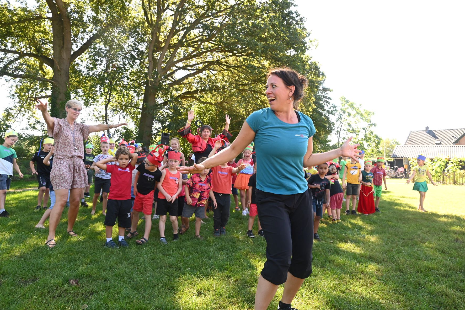 Juf Alieke vierde woensdag 6 september dat ze al 25 jaar werkzaam is op basisschool De Appelgaard in de Nijkerkse kern Appel/Driedorp. In de loop der jaren heeft ze aan alle groepen les gegeven. Ze werd ’s morgens thuis opgehaald door de kleutergroep en aangekomen op school moest ze een rode flamenco-jurk aan. De kinderen van de school verrasten haar met allerlei Zuid-Amerikaanse dansen. Tot slot moest juf Alieke ook meedansen. Ze ontving van de school een cadeaubon, waarvan ze wandelschoenen gaat kopen. Foto Kees van den Heuvel