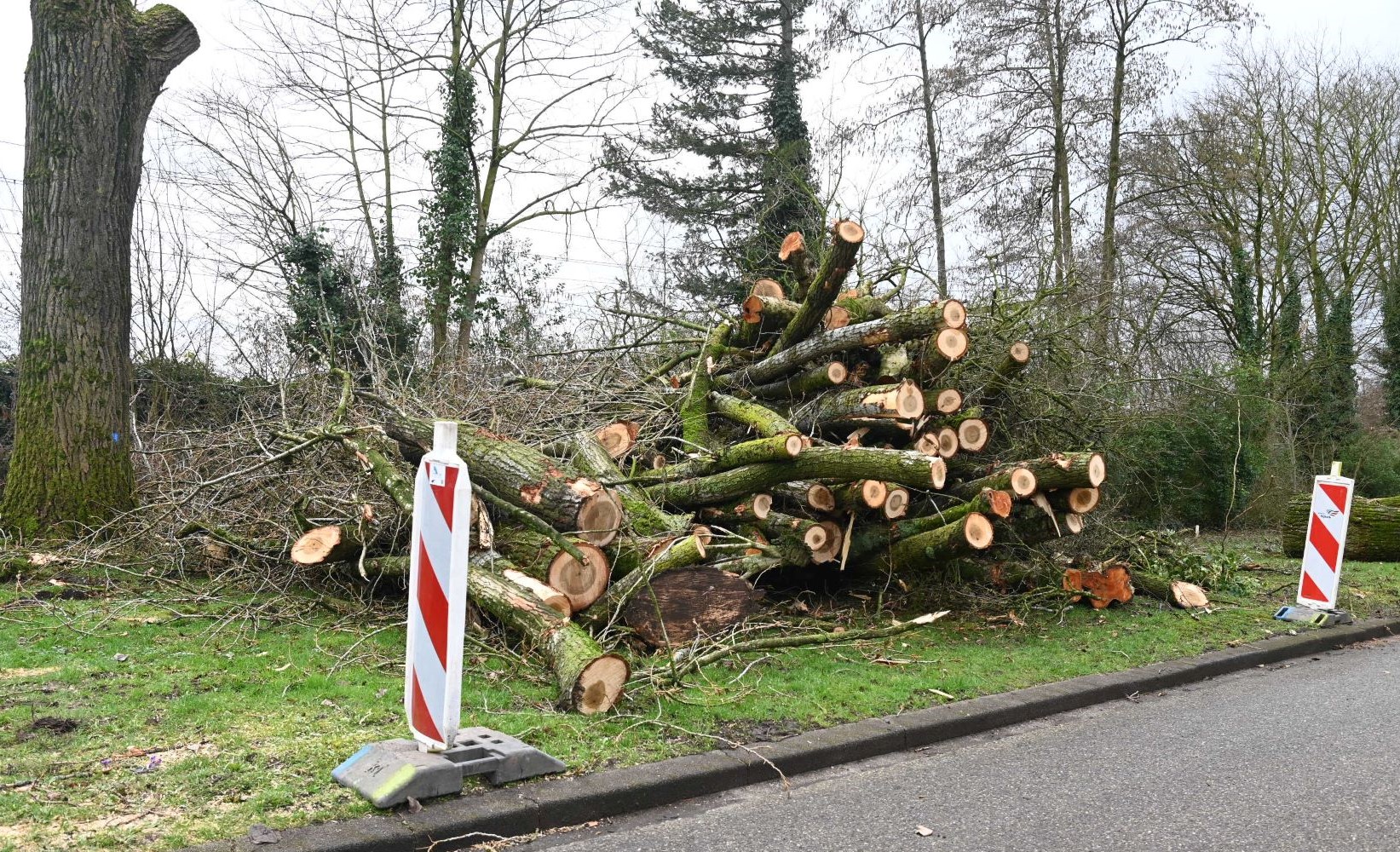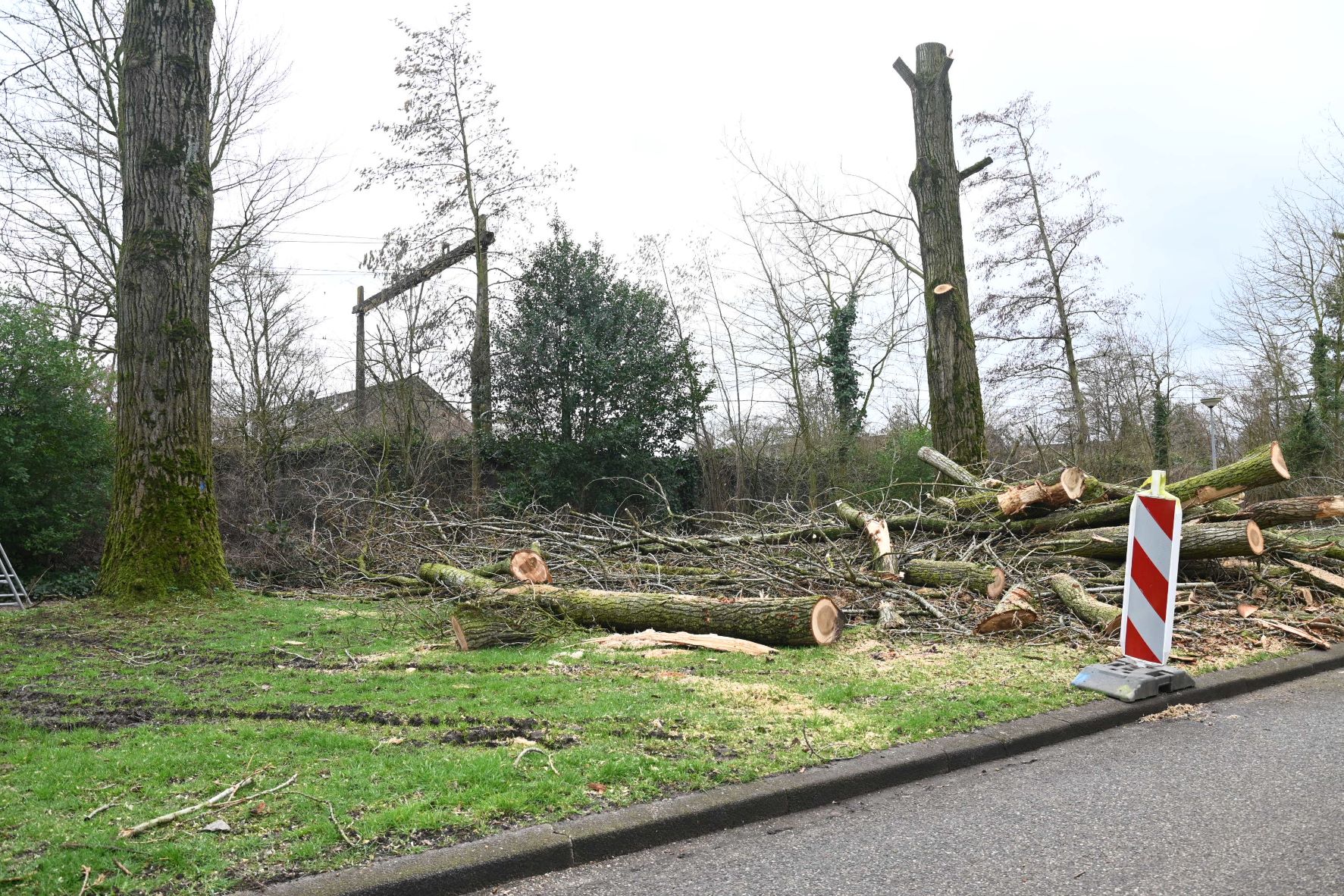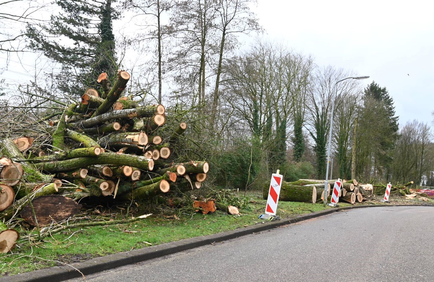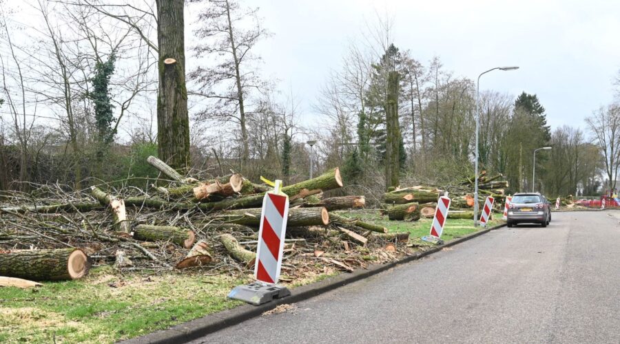 De gemeente Nijkerk heeft de afgelopen dagen veel bomen gekapt op de hoek Hoogstraat en Van Oldenbarneveltstraat. De bewoners ervaren momenteel een kaalslag. De bomen waren 40 tot 80 jaar oud, sommige tientallen meters hoog en vol leven. Bij de flats van de Van oldenbarneveltstraat worden de boomresten versnipperd tot zaagsel. Foto Kees van den Heuvel