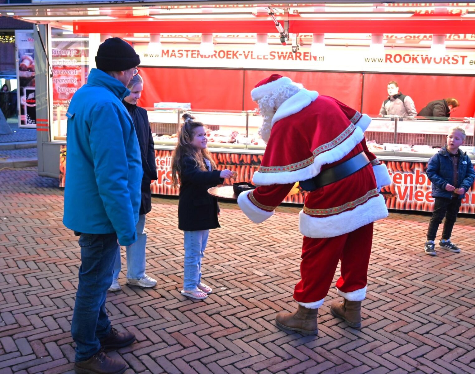 De kerstman ontbrak uiteraard niet op de vrijdagse weekmarkt in Nijkerk. Een week voor het echte feest deelde hij op het Molenplein koekjes uit aan de bezoekers van de markt. Ook mochten de kinderen met hem op de foto en hem een handje geven. Foto Kees van den Heuvel