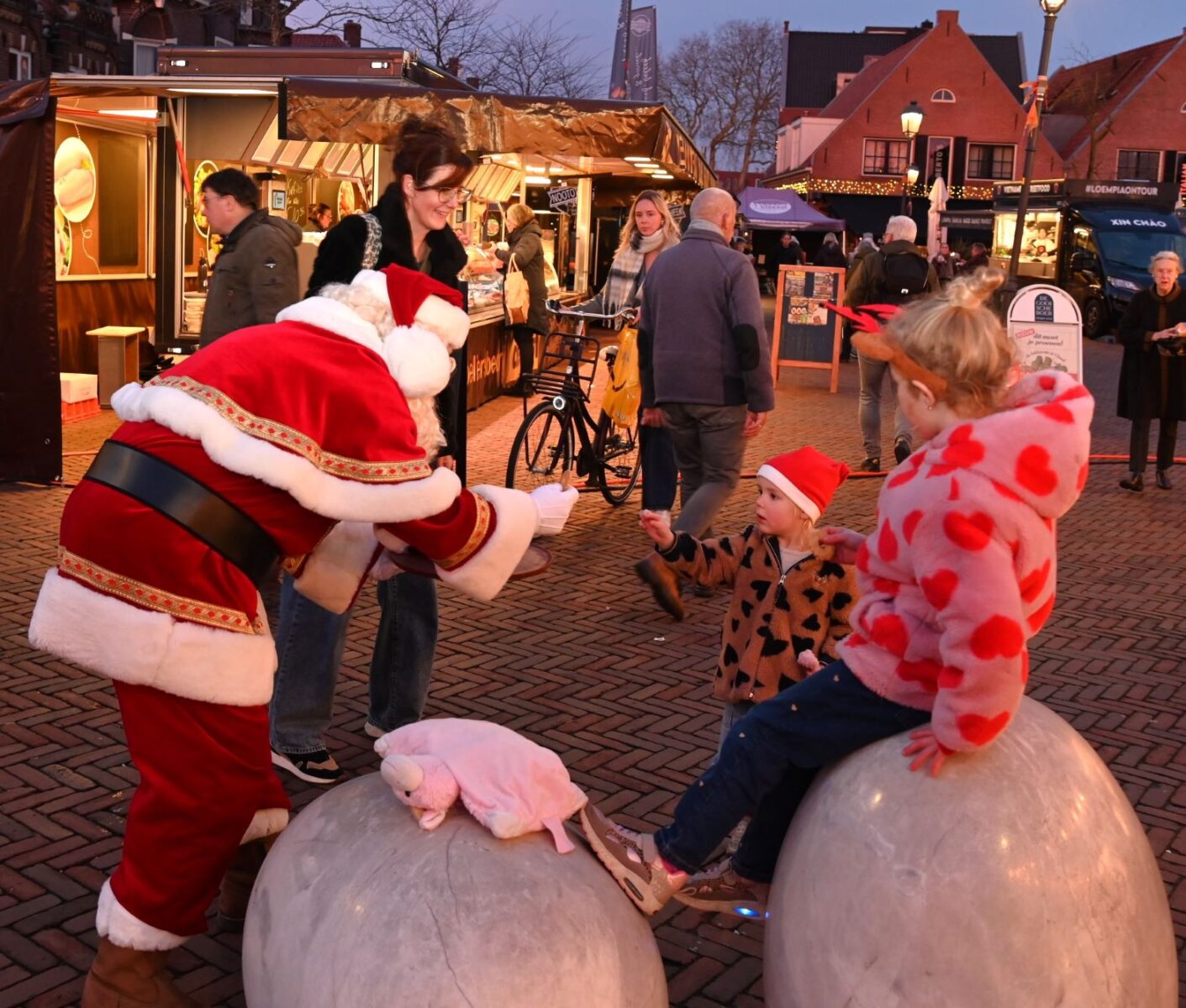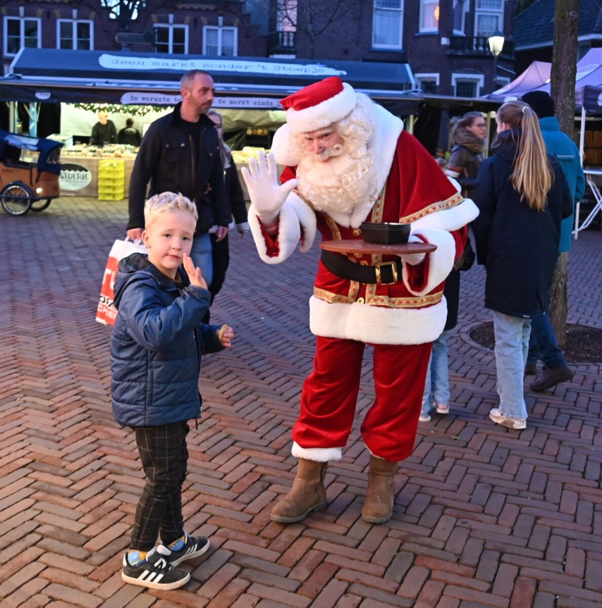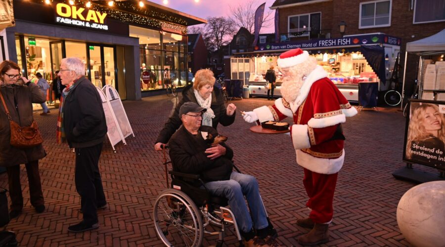 De kerstman ontbrak uiteraard niet op de vrijdagse weekmarkt in Nijkerk. Een week voor het echte feest deelde hij op het Molenplein koekjes uit aan de bezoekers van de markt. Ook mochten de kinderen met hem op de foto en hem een handje geven. Foto Kees van den Heuvel