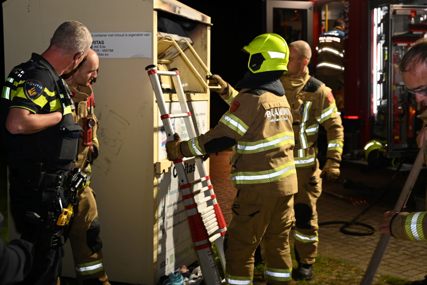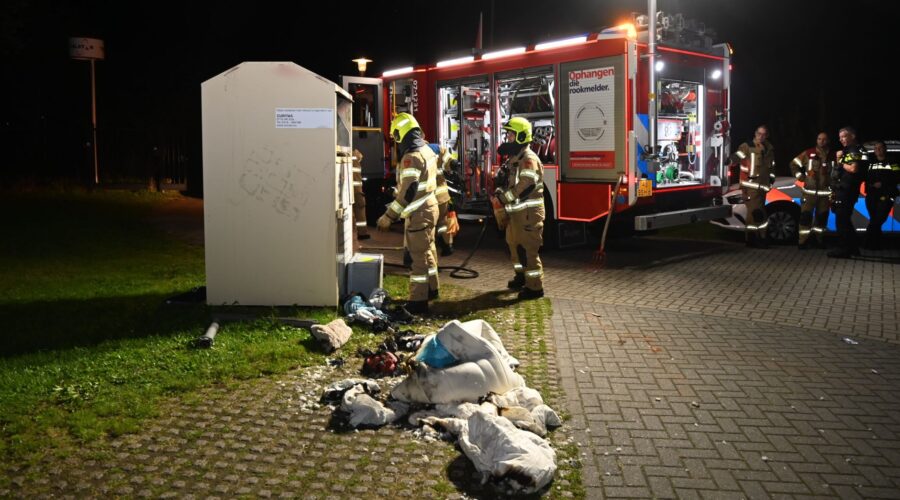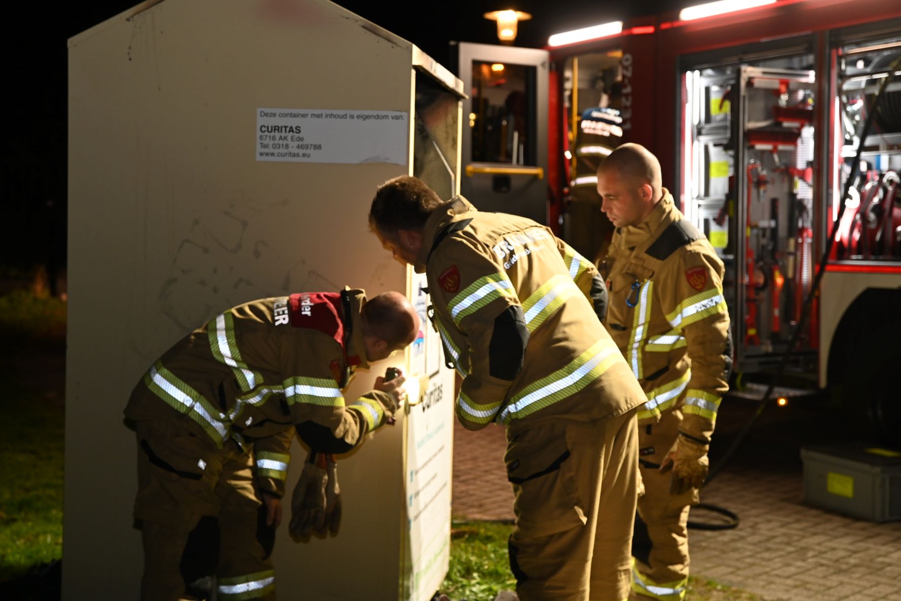 Op de Middelaarseweg in Hoevelaken is zaterdagavond 23 september een kledingcontainer in de fik gestoken. Dat was naast het sportcomplex van Korfbalvereniging Telstar. Nadat de brandende delen zijn verwijderd, heeft de brandweer nog een keer de brandweerspuit goed op de binnenkant gericht, zodat het vuur niet weer oplaait. De container is van Curitas, een organisatie die kleding en schoenen ophaalt voor een duurzame verwerking waarmee verschillende goede doelen worden gesteund, zoals Pax Kinderhulp, Terre des Hommes, Longfonds, Oxfam Novib en KWF. Foto Kees van den Heuvel