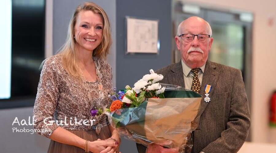 Gerrit van Binnendijk is vrijdag 24 april gedecoreerd als Lid in de Orde van Oranje-Nassau. De 84-jarige inwoner ontving de versierselen die horen bij deze koninklijke onderscheiding uit handen van de burgemeester. Gerrit van Binnendijk krijgt de onderscheiding voor zijn jarenlange, tomeloze inzet voor de kerkelijke gemeenschap in Amersfoort en zijn bestuurlijke bijdrage aan de vrijwilligerszorg in Nijkerk. Van Binnendijk is al sinds 1979 een drijvende kracht binnen de Protestantse Wijkgemeente Adventkerk, waar hij als lid van de kerkenraad van grote waarde is geweest. Zijn invloed strekte zich echter verder uit dan de eigen wijkgemeente. Vanaf 1995 zette hij zich tien jaar lang in voor het College van Kerkrentmeesters van de Protestantse Gemeente Amersfoort, waarvan acht jaar in de rol van voorzitter. Een van zijn belangrijkste verdiensten was het verbinden van de kerkelijke organisatie met externe partners. Hij speelde een cruciale rol in het overleg met instanties die verantwoordelijk zijn voor het behoud van de monumentale Sint-Joriskerk in Amersfoort. Zijn betrokkenheid bij dit historische erfgoed bleek ook uit zijn bestuurslidmaatschap van het Capittel van de Sint-Joriskerk en zijn tienjarige termijn als secretaris van de Stichting Vrienden van de Sint-Joriskerk (2000-2010). Naast zijn kerkelijke activiteiten was de heer Van Binnendijk ook buiten Amersfoort actief. Tussen 2011 en 2017 bekleedde hij diverse bestuursfuncties bij de Unie van Vrijwilligers (UVV) in Nijkerk. Vandaag de dag is zijn inzet meer privé van aard, maar niet minder intensief: sinds 2017 is hij de vaste mantelzorger voor zijn echtgenote. De toekenning van de koninklijke onderscheiding onderstreept de grote dankbaarheid van de gemeenschap voor de decennialange inzet en plichtsbetrachting van de heer Van Binnendijk. Tekst Kees van den Heuvel, Foto Aalt Guliker