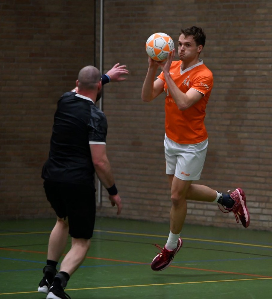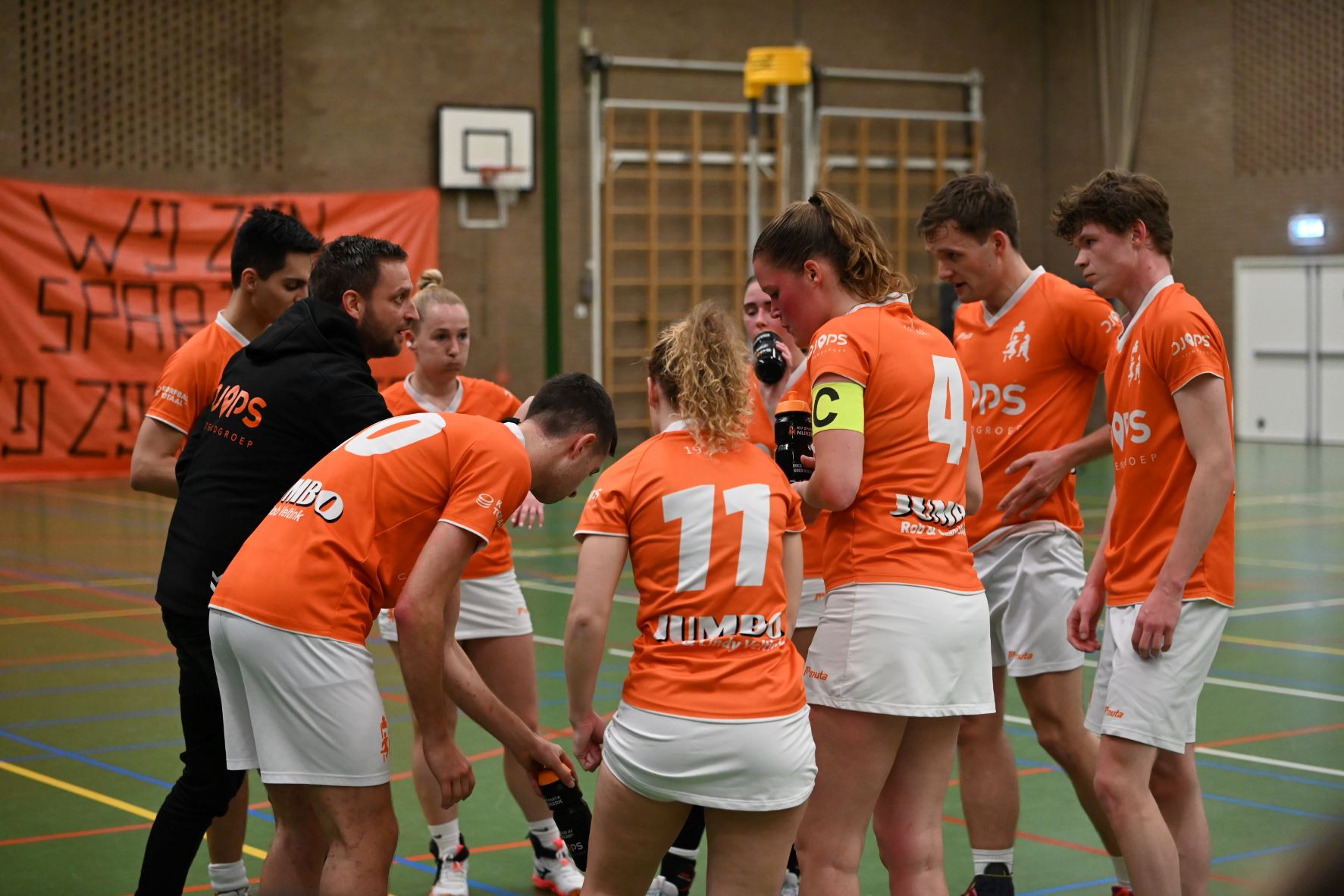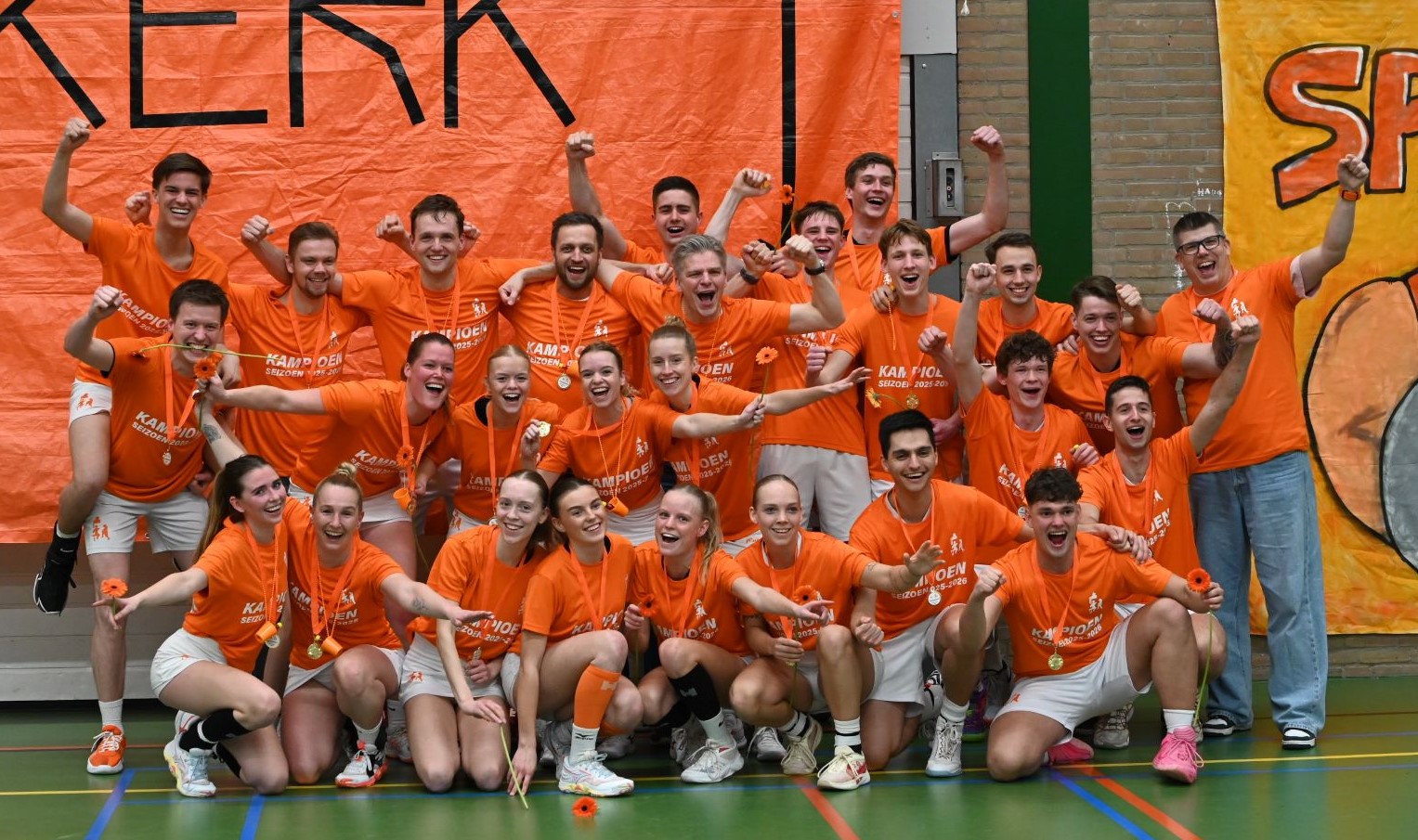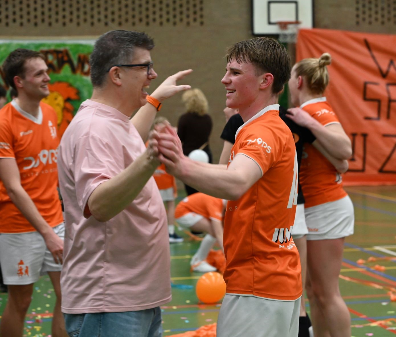 Na de zwaarbevochten overwinning op Atlantis een week eerder, waarbij Sparta het kampioenschap in eigen hand nam, was de spanning in de zaal voelbaar. HBC uit Beverwijk kwam echter alleen in het begin van het stuk voor. Waarschijnlijk kampte de Spartanen met iets teveel wedstrijdspanning en kwamen ze aanvankelijk op achterstand. Toen de scores opeen werden geregen, nam het zelfvertrouwen toe. Met een ruststand van 11-6 werd die dominantie al weerspiegeld en kon het thuispubliek zich halverwege al voorzichtig opmaken voor een feestje. In de tweede helft bleef Sparta geconcentreerd spelen. Waar de ploeg in eerdere wedstrijden soms nog de verdediging openzette, hielden ze nu, net als in de slotfase tegen Atlantis, de boel potdicht. HBC slaagde er nauwelijks in om door de Nijkerkse muur heen te breken. De aanvalsmachine van Sparta bleef ondertussen rustig doorbouwen aan de score, wat uiteindelijk resulteerde in een klinkende 18-8 einduitslag. Na het laatste fluitsignaal barstte het feest los in de hal en ontvingen de kampioenen een medaille, bos bloemen en een kampioensshirt. Foto en verslag Kees van den Heuvel