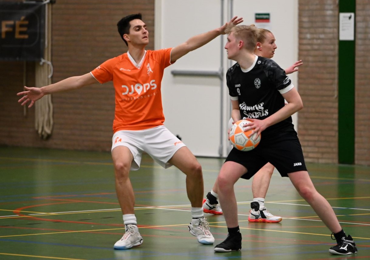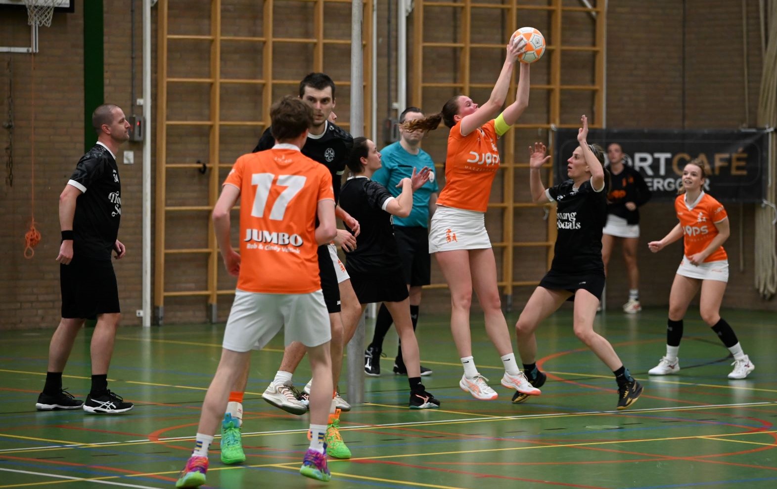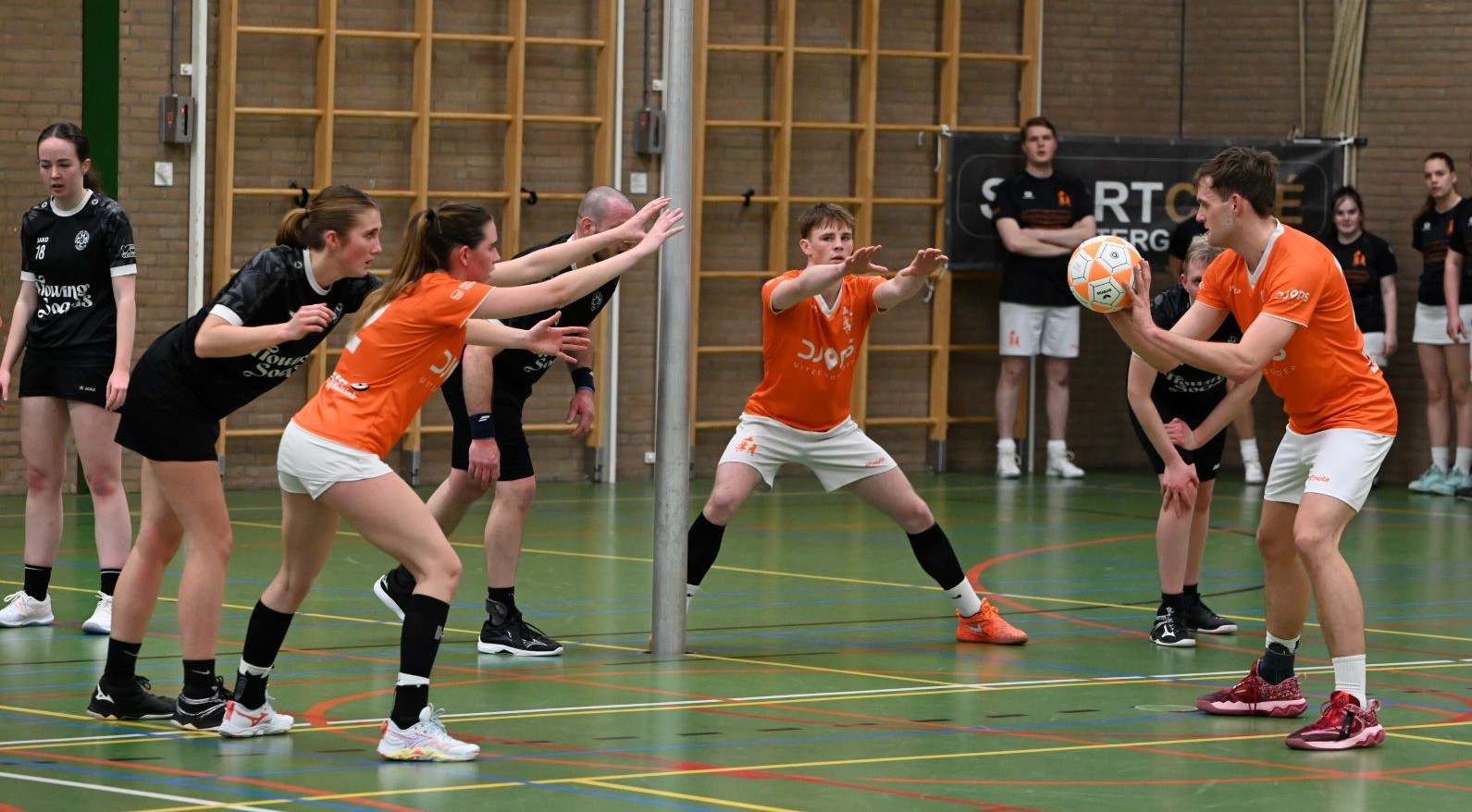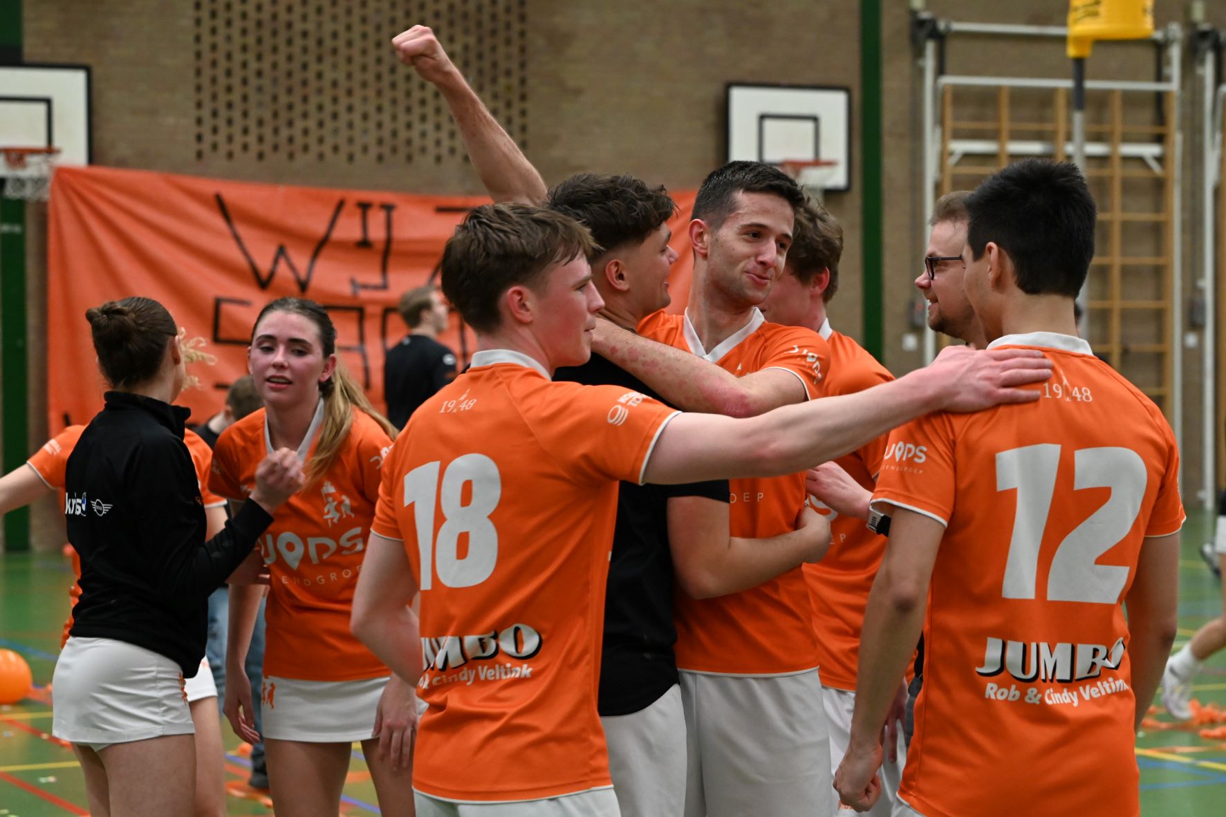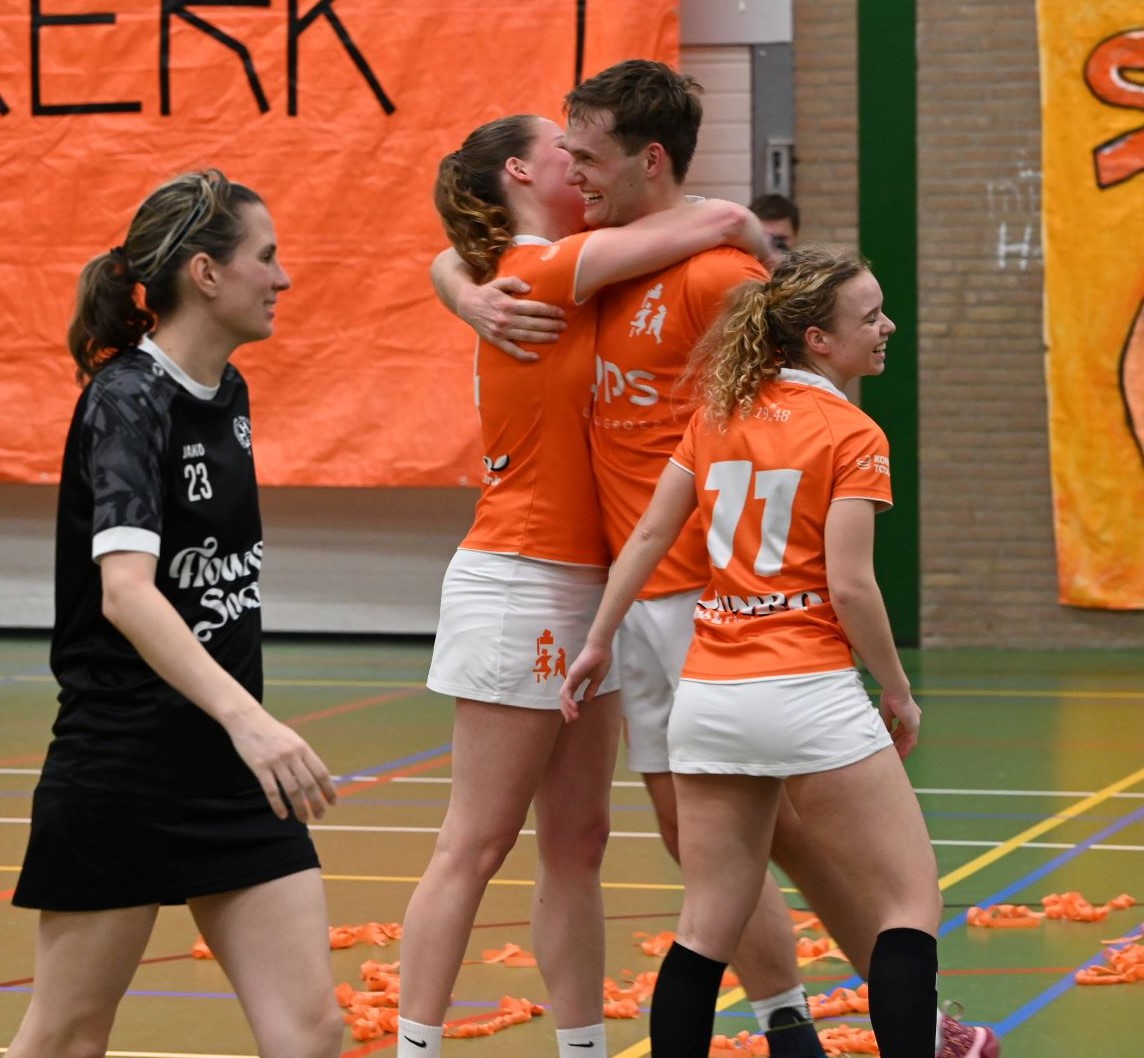 Na de zwaarbevochten overwinning op Atlantis een week eerder, waarbij Sparta het kampioenschap in eigen hand nam, was de spanning in de zaal voelbaar. HBC uit Beverwijk kwam echter alleen in het begin van het stuk voor. Waarschijnlijk kampte de Spartanen met iets teveel wedstrijdspanning en kwamen ze aanvankelijk op achterstand. Toen de scores opeen werden geregen, nam het zelfvertrouwen toe. Met een ruststand van 11-6 werd die dominantie al weerspiegeld en kon het thuispubliek zich halverwege al voorzichtig opmaken voor een feestje. In de tweede helft bleef Sparta geconcentreerd spelen. Waar de ploeg in eerdere wedstrijden soms nog de verdediging openzette, hielden ze nu, net als in de slotfase tegen Atlantis, de boel potdicht. HBC slaagde er nauwelijks in om door de Nijkerkse muur heen te breken. De aanvalsmachine van Sparta bleef ondertussen rustig doorbouwen aan de score, wat uiteindelijk resulteerde in een klinkende 18-8 einduitslag. Na het laatste fluitsignaal barstte het feest los in de hal en ontvingen de kampioenen een medaille, bos bloemen en een kampioensshirt. Foto en verslag Kees van den Heuvel