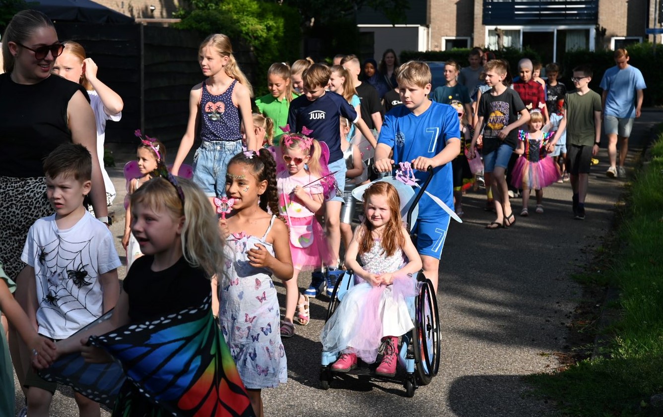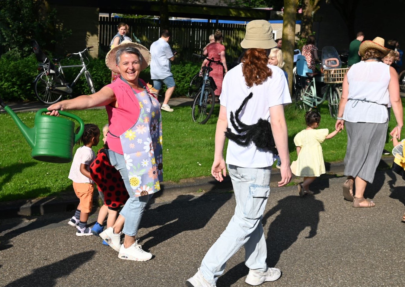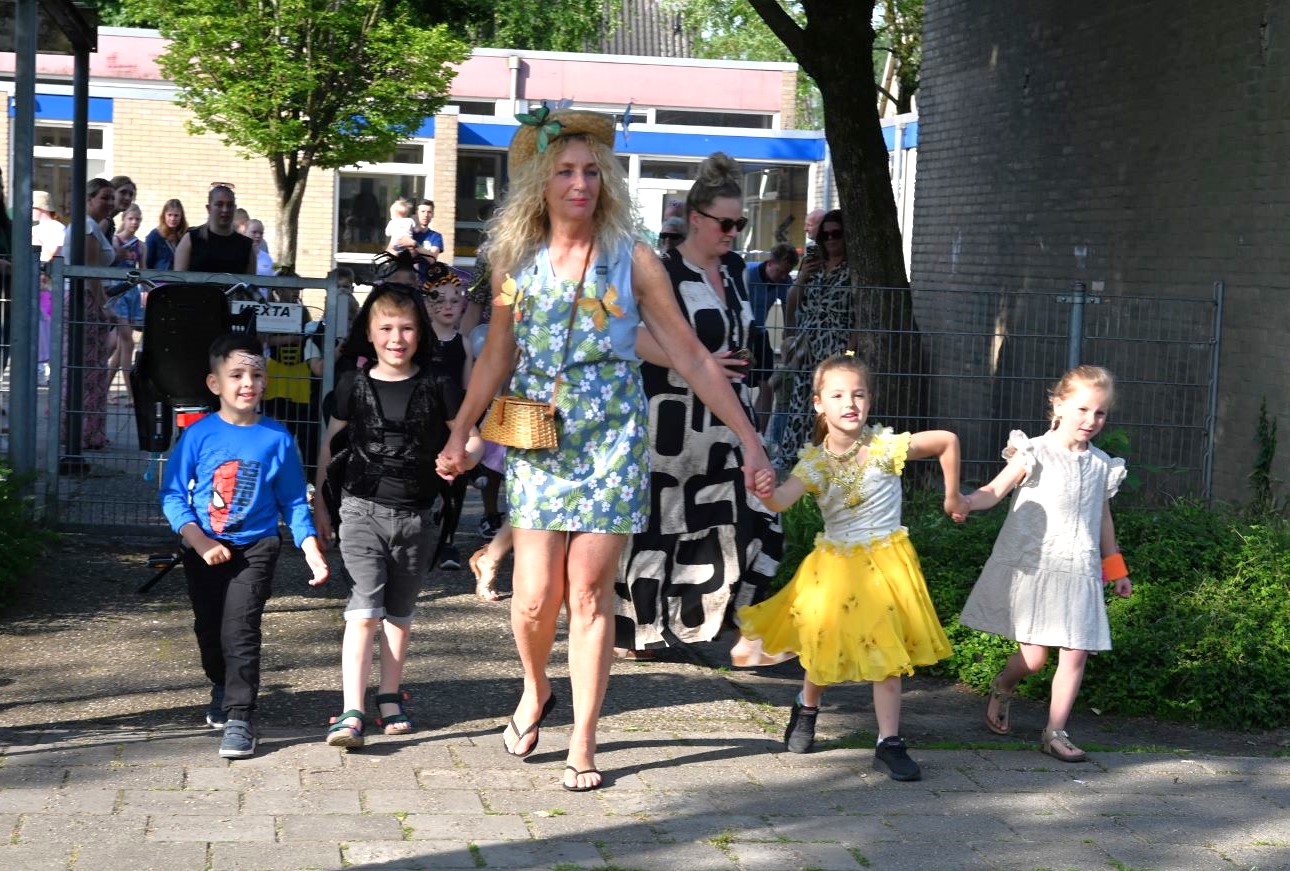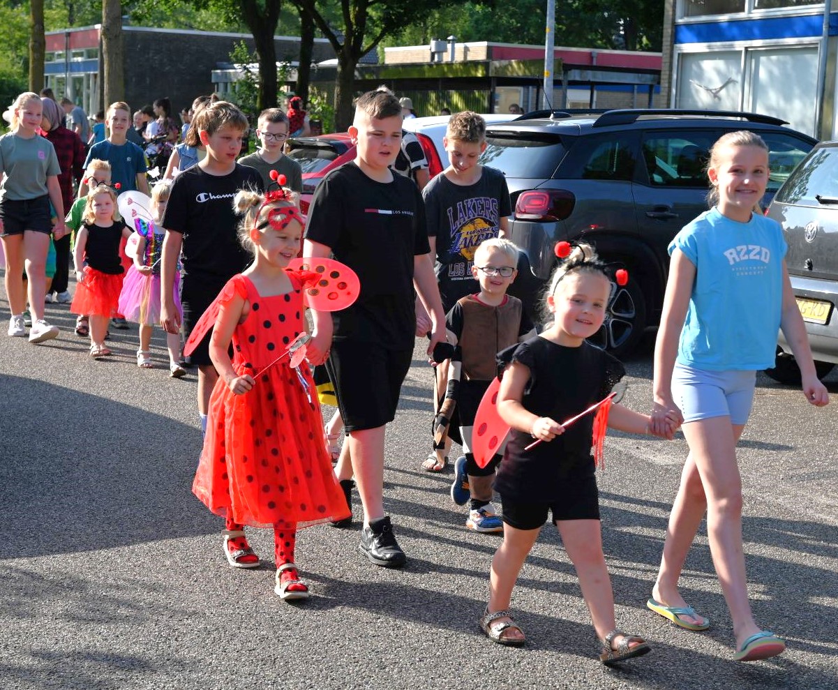 Vrijdag 13 juni begon voor kindcentrum Prins Willem-Alexander muzikaal. Op de noodlocatie Bizetlaan werd een peuter/kleuterfeest georganiseerd. Het werd een kriebelbeestjesfeest, veel leerlingen waren verkleed als insecten. Onder aanvoering van enkele muzikanten van het Nijkerks Stedelijk Fanfare Corps liepen de kinderen een rondje om het schoolgebouw. Foto Kees van den Heuvel