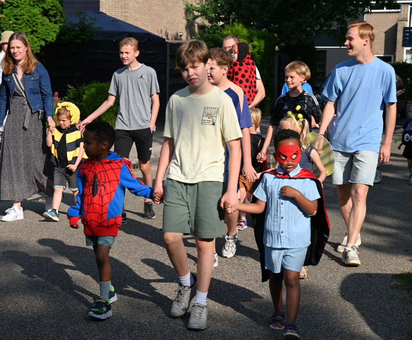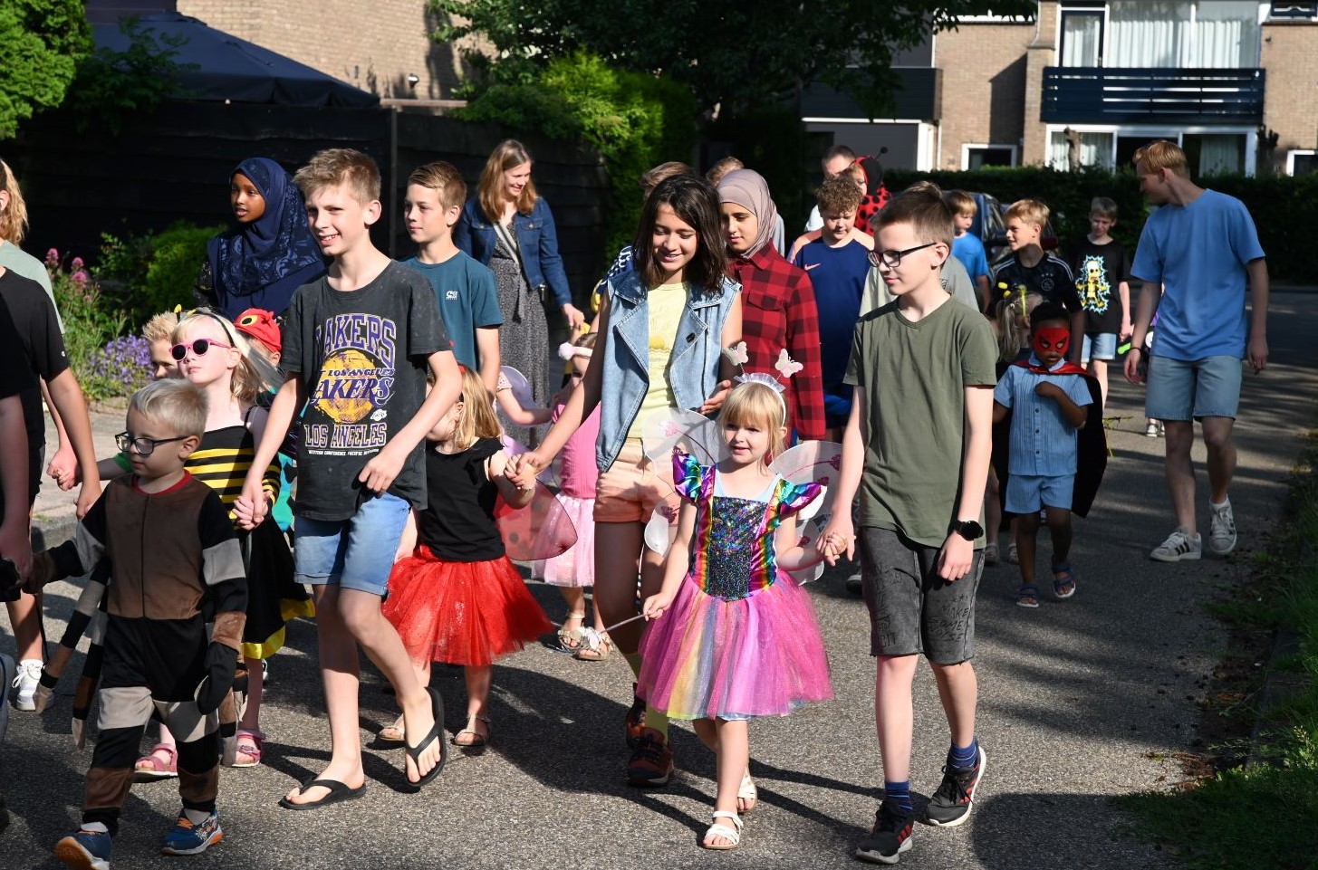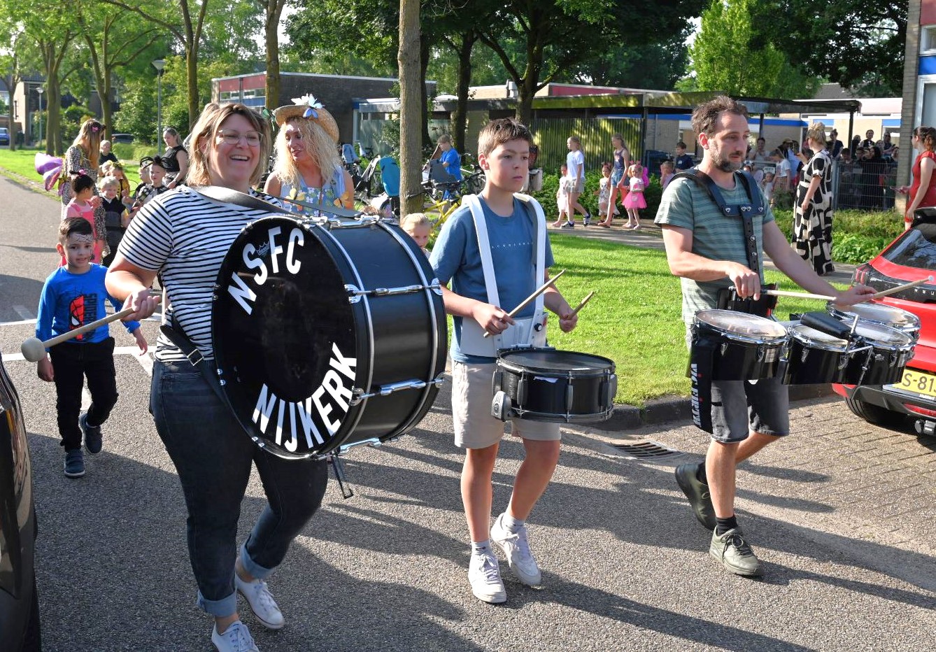 Vrijdag 13 juni begon voor kindcentrum Prins Willem-Alexander muzikaal. Op de noodlocatie Bizetlaan werd een peuter/kleuterfeest georganiseerd. Het werd een kriebelbeestjesfeest, veel leerlingen waren verkleed als insecten. Onder aanvoering van enkele muzikanten van het Nijkerks Stedelijk Fanfare Corps liepen de kinderen een rondje om het schoolgebouw. Foto Kees van den Heuvel