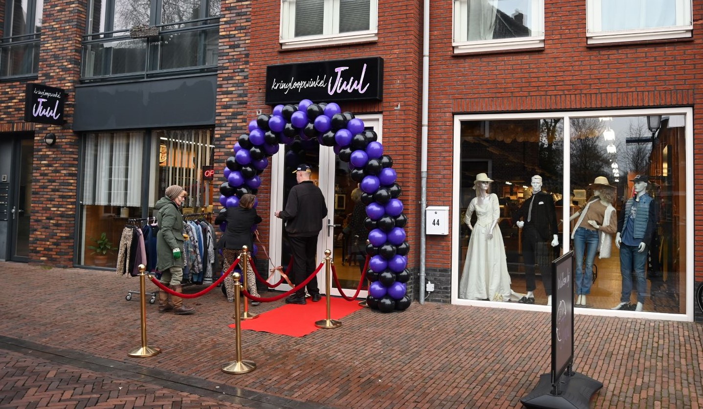 Zaterdagmorgen 4 januari vond de heropening plaats van Kringloop “JUUL”. Het bedrijf van Juliette Neuteboom verhuisde van Langestraat 12 naar Langestraat 44. Langestraat 44 was het pand waar Pomandi maatkleding gevestigd was, naast Inkstation. De opening werd verricht door Juliette en haar moeder door een lint door te knippen. Met de nieuwe winkelruimte gaat de onderneemster er flink op vooruit, want die verdubbelt bijna drie keer. Ze heeft nu meer ruimte om de meubels, accessoires, kleding, boeken, interieurspullen etc kwijt te kunnen alsmede een eigen werkplaats. Er zijn ook paskamers. Foto Kees van den Heuvel