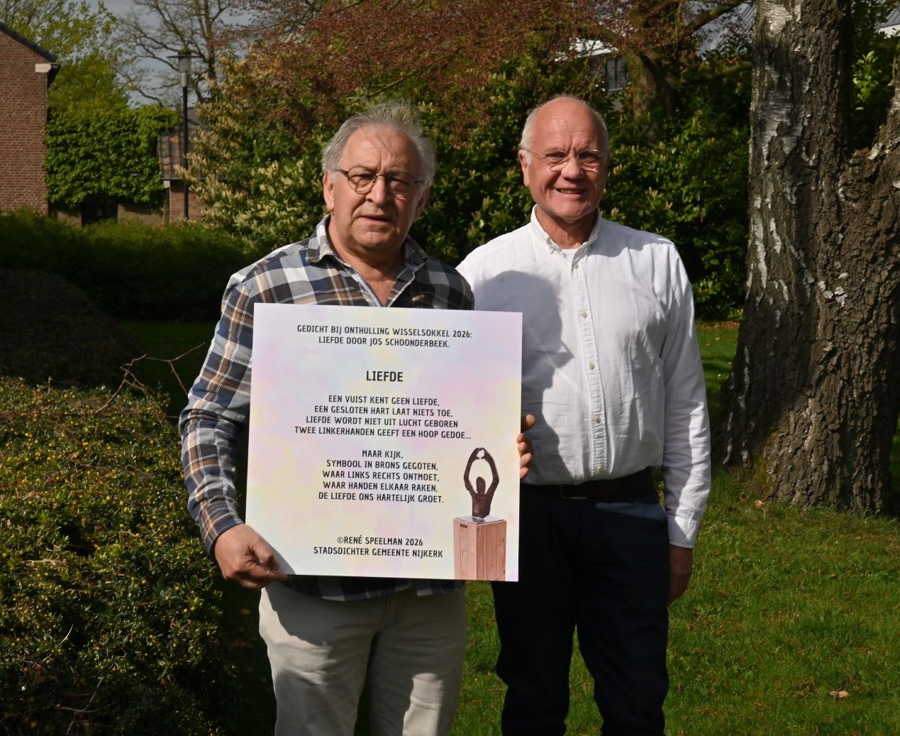De onthulling werd extra glans gegeven door stadsdichter René Speelman, die een speciaal voor deze gelegenheid geschreven gedicht getiteld ‘Liefde’ voordroeg. De aanwezigen zagen hoe het beeld nu zijn plek heeft ingenomen naast de huisartsenpraktijk, waar het de komende twee jaar een baken van bezinning zal vormen. Na de officiële plechtigheid kwam het gezelschap samen in de nabijgelegen bibliotheek. Onder het genot van een toost werd er nagepraat met de kunstenaar en zijn trotse familie over dit nieuwe artistieke hoogtepunt voor de gemeente Nijkerk.