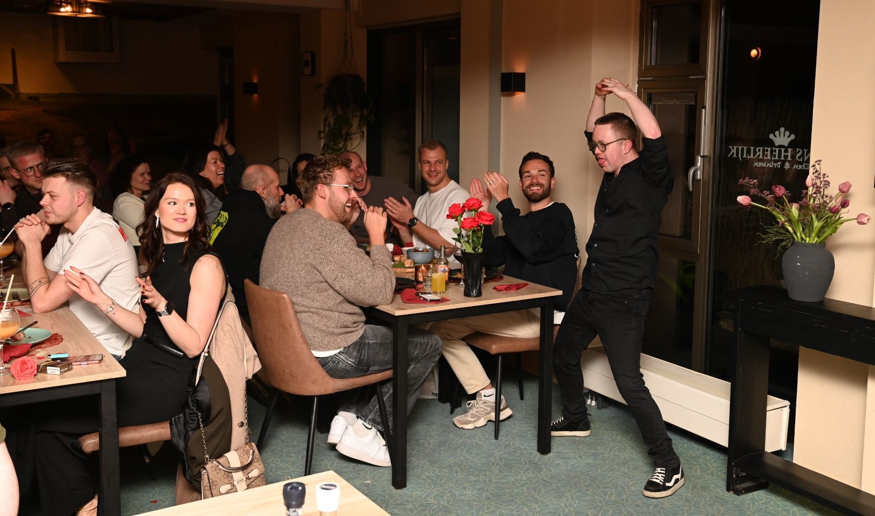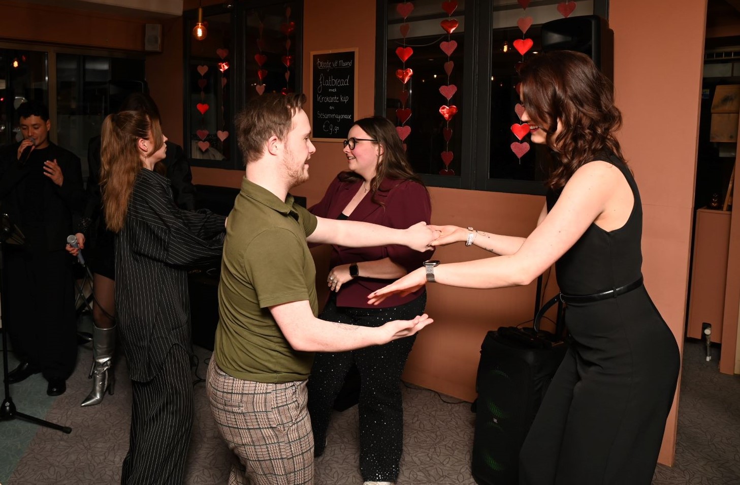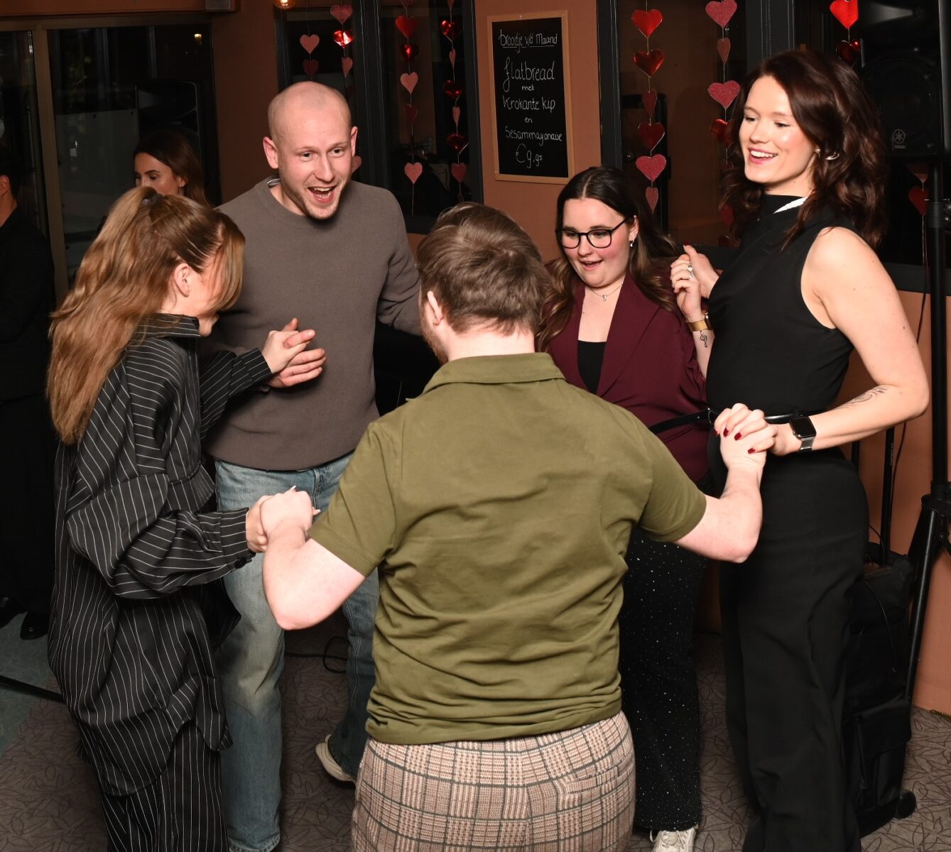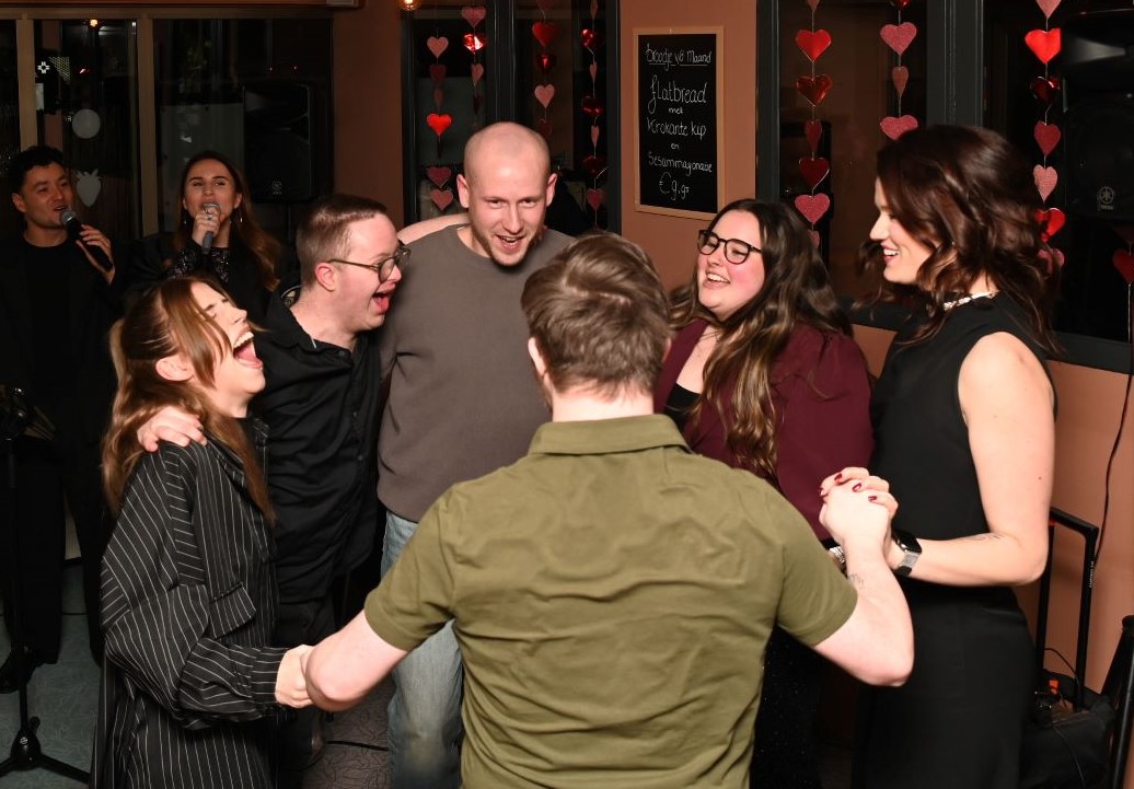 Het heette een romantisch diner te zijn in het Nijkerkse restaurant Prins Heerlijk, maar het Valentijnsdiner eindigde vrijdagavond 6 februari in een grote hossende massa. Niemand minder dan zanger/dansschooleigenaar Laurens Hagens was hiervoor verantwoordelijk. Het restaurant had hem weten te strikken voor de muzikale omlijsting. De kaartjes voor het diner waren snel uitverkocht. Niet alleen vanwege de smaakvolle menukaart, maar ook vanwege het grote feest. Het personeel van Prins Heerlijk kennende stond het restaurant in mum van tijd op zijn kop en was het verandert in een carnavaleske feestsfeer. Foto Kees van den Heuvel
