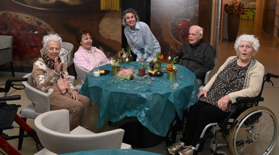 Samen met de bewoners werden tientallen bakjes voorzien van paaseitjes, de paashaas en kleurrijke krokussen, hyacinten en andere vrolijke voorjaarsplanten. Het binnen werken had ook een voordeel: de bewoners konden nu van heel dichtbij meekijken en meehelpen, wat zorgde voor extra veel aanspraak en gezelligheid. Het resultaat is een prachtige zee aan kleuren die, zodra het even droog is, op de balkons en bij de entrees geplaatst worden. “Het is elk jaar weer een feestje,” vertelt een van de vrijwilligers. “De regen houdt ons niet tegen; de glimlach van de bewoners als ze die vrolijke bakken zien, daar doen we het voor.” De dag werd traditiegetrouw afgesloten met een gezamenlijk koffiemoment, waarbij de eerste plannen voor het onderhoud van al dat nieuwe groen alweer werden gesmeed. Foto Kees van den Heuvel