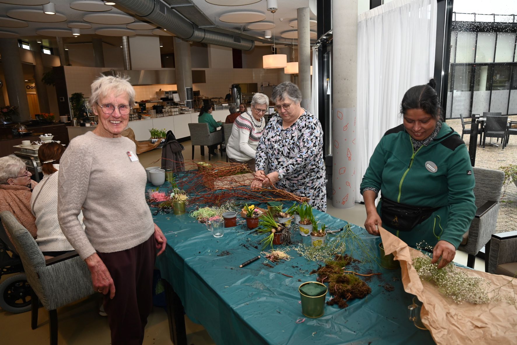 De voorspelde regen mocht de pret niet drukken bij Zorgcentrum De Pol. Vrijdag 13 maart staken enthousiaste vrijwilligers de handen uit de mouwen voor NLdoet om de leefomgeving van de bewoners letterlijk en figuurlijk op te fleuren. Door de aanhoudende neerslag werd het vullen van de bloembakken en lentepracht naar binnen verplaatst. De tafels waren afgedekt met zeil en de geur van verse potgrond en voorjaarsbloeiers vulde al snel de gangen.