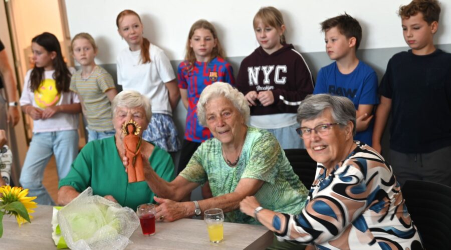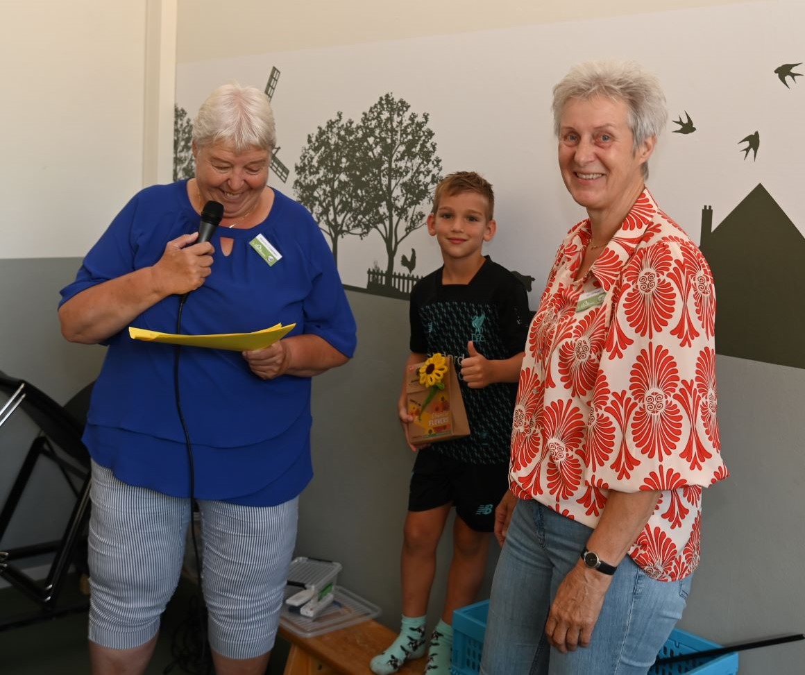 Het zou een strijd worden tussen de bewoners van de Nijkerkse kernen Appel en Driedorp en de leerlingen van de basisschool De Appelgaard: Wie heeft de hoogste zonnebloem van Appel en Driedorp? Uiteindelijk wonnen de inwoners van beide kernen. Mevrouw Cozijnsen, woonachtig op de Slichtenhorsterweg, had de hoogste zonnebloem met 3,48 meter. Leerlinge Dana volgde daarop met een zonnebloem van 3,42 meter. Bij sommige inwoners is de uitdaging mislukt, want de kippen hadden de zonnebloemzaadjes opgegeten. De prijsuitreiking was donderdagmorgen 4 september in het Appelhuus. Foto Kees van den Heuvel