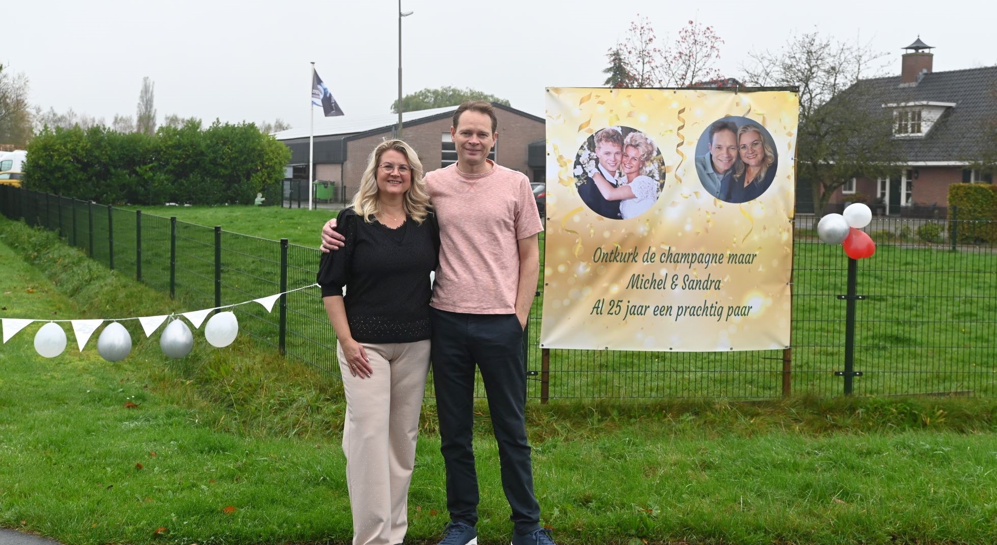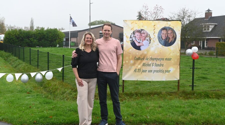 Groot feest op de Schoolstraat in Nijkerkerveen, want Michel en Sandra Bosch zijn dinsdag 29 oktober exact een kwart eeuw getrouwd. Dus… ontkurk de champagne maar. Al 25 jaar een prachtig paar. Pa Evert en ma Els Bosch en de kinderen ontwierpen als vanouds dit prachtige spandoek. Het bruidspaar heeft het grote feest al gevierd. Foto Kees van den Heuvel