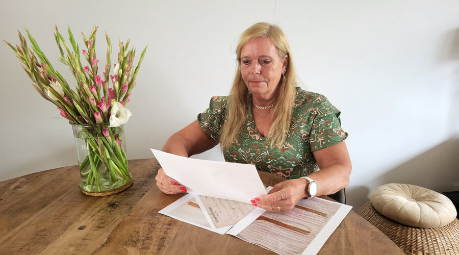 Aan de keukentafel haalt Mieke een aantal kopieën tevoorschijn. Het zijn foto’s van de brieven die ze vond in de erfenis van haar vader. Ze begint te vertellen, vanaf het begin van haar zoektocht: ,,Mijn vader, Gerard van Hattum, woonde in Hoevelaken en is in 2001 overleden. Samen met mijn broer heb ik destijds zijn huis leeggehaald. Uit kasten en lades kwamen allerlei papieren en documenten, tot bankafschriften aan toe. We hebben alles in een krat gedaan om later nog eens op ons gemak uit te kunnen zoeken.”