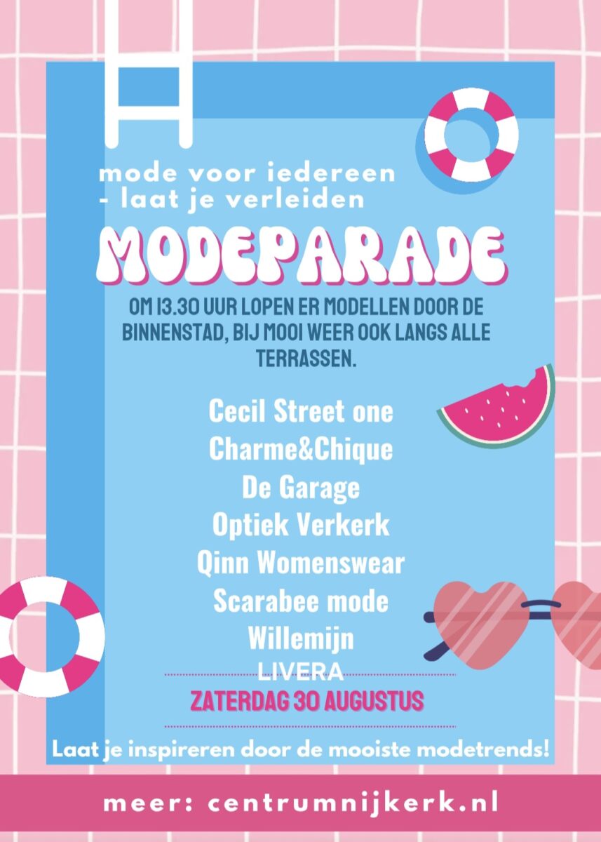 Op zaterdag 30 augustus wordt het centrum van Nijkerk omgetoverd tot een zomerse beleving tijdens de Zomer Shop Tour. Een hele dag lang valt er van alles te zien, proeven en beleven – de perfecte gelegenheid om te ontdekken wat onze lokale winkels en horeca allemaal te bieden hebben. Laat je verrassen door spetterende aanbiedingen, zomerse hapjes en drankjes en vrolijke sfeeracties. Verspreid door de stad vind je diverse uitstallingen, proeverijen en activiteiten voor jong en oud. Alsof dat nog niet genoeg is, kun je ook genieten van een modeshow die dwars door het centrum trekt – lokale modewinkels presenteren met flair de nieuwste najaarscollecties. Aan de modeshow nemen de volgende winkels deel: Cecil Street One, Charme&Chique, De Garage, Optiek Verkerk, Qinn Womenswear, Scarabee, Willemijn en Livera.