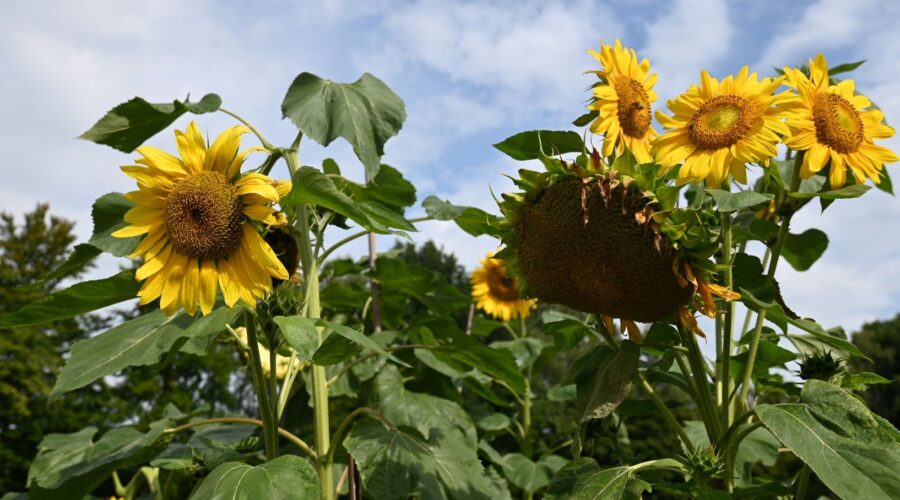 De leerlingen van de basisschool De Appelgaard in de Nijkerkse kern Appel/Driedorp zullen niet weten wat ze meemaken als ze begin september weer terugkeren naar de school. De zonnebloemen die zijn geplant in de moestuin van de school, hebben gigantische vormen aangenomen. Het is een grote gele oase. Foto Kees van den Heuvel
