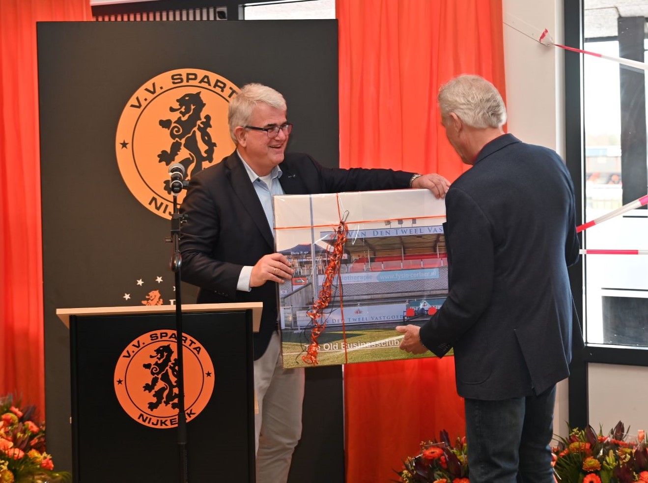 Onlangs nam Nico Fiegen afscheid als voorzitter van de Businessclub van Sparta Nijkerk en bij die gelegenheid ontving hij een Koninklijke Onderscheiding. Ook enkele weken later tijdens de nieuwjaarsbijeenkomst werd hij nog even in het zonnetje gezet. Nico ontving voor al zijn inspanningen een grote foto van de huidige businessruimte van de Nijkerkse voetbalvereniging. Die businessruimte gaat de komende tijd flink op de schop. De metamorfose wordt mogelijk nadat de leden van Sparta Nijkerk in december akkoord hebben gegeven op een extra financiering en een aangepast bouwplan. Foto Kees van den Heuvel