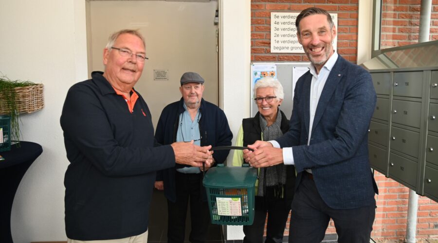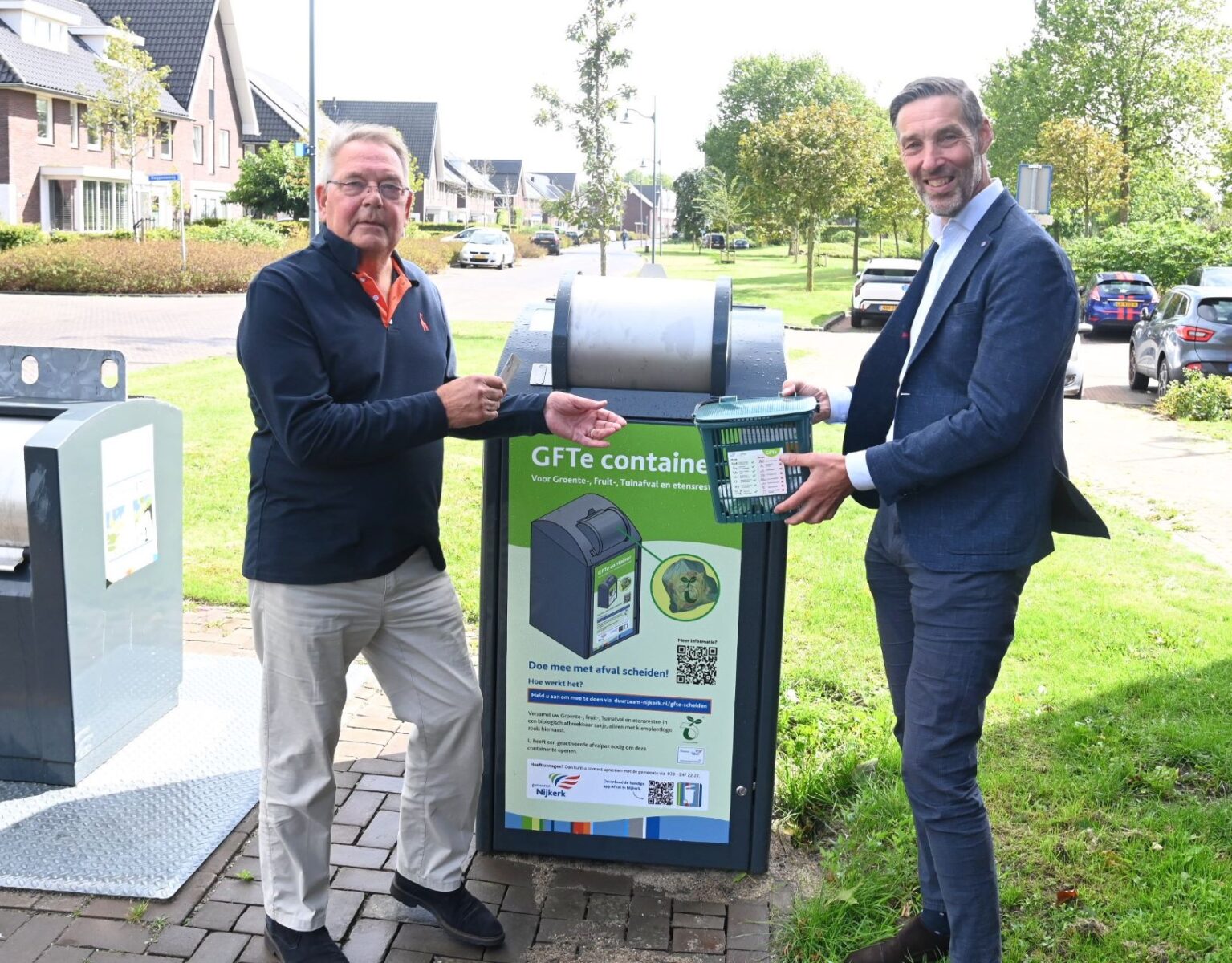 In Nijkerk is een pilot gestart om de gescheiden inzameling van gft (groente-, fruit- en tuinafval) te verbeteren, omdat er te veel gft in het restafval terechtkomt. In deze pilot krijgen bewoners van drie flats aan de Zijdevlinder speciale gft-containers die met een persoonlijke pas worden gebruikt. Het doel is om te onderzoeken of deze aanpak de hoeveelheid gft in het restafval effectief kan terugdringen en het gemak voor bewoners vergroot, waarna de gemeente de resultaten zal gebruiken om te bepalen of dit systeem op grotere schaal kan worden ingevoerd. De eerste pas en afvalemmer was voor Henk Niezen die dit in ontvangst nam van wethouder René Windhouwer. Op basis van de resultaten van deze pilot zal de gemeente Nijkerk beoordelen of het systeem breder kan worden uitgerold bij andere flats en wooncomplexen in de gemeente. Foto Kees van den Heuvel