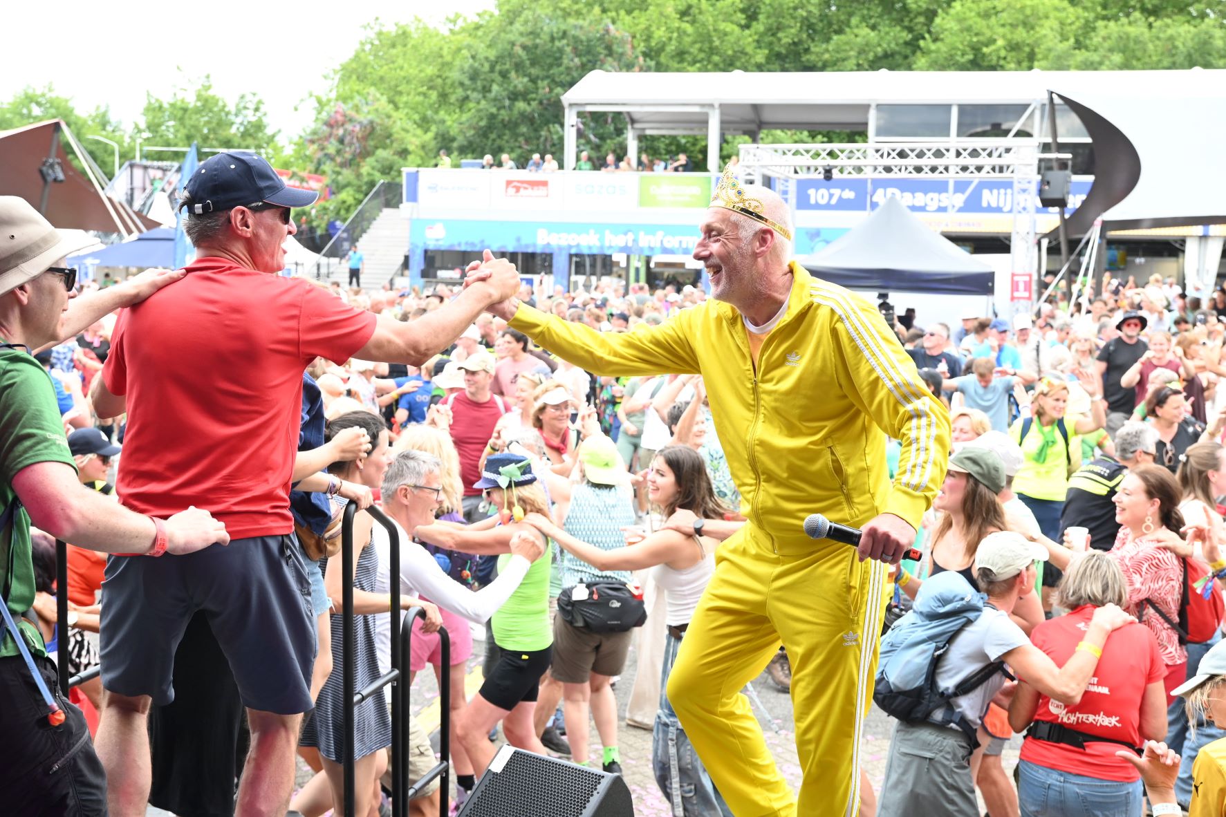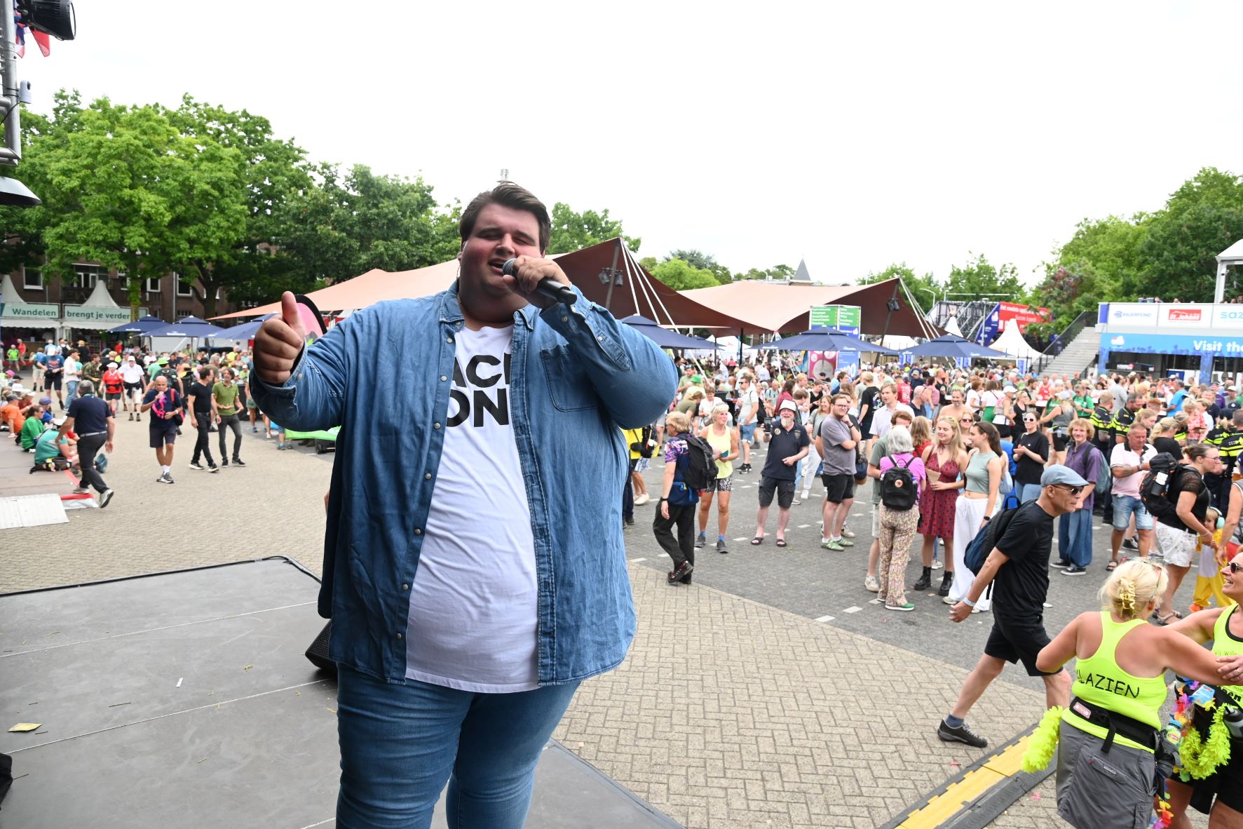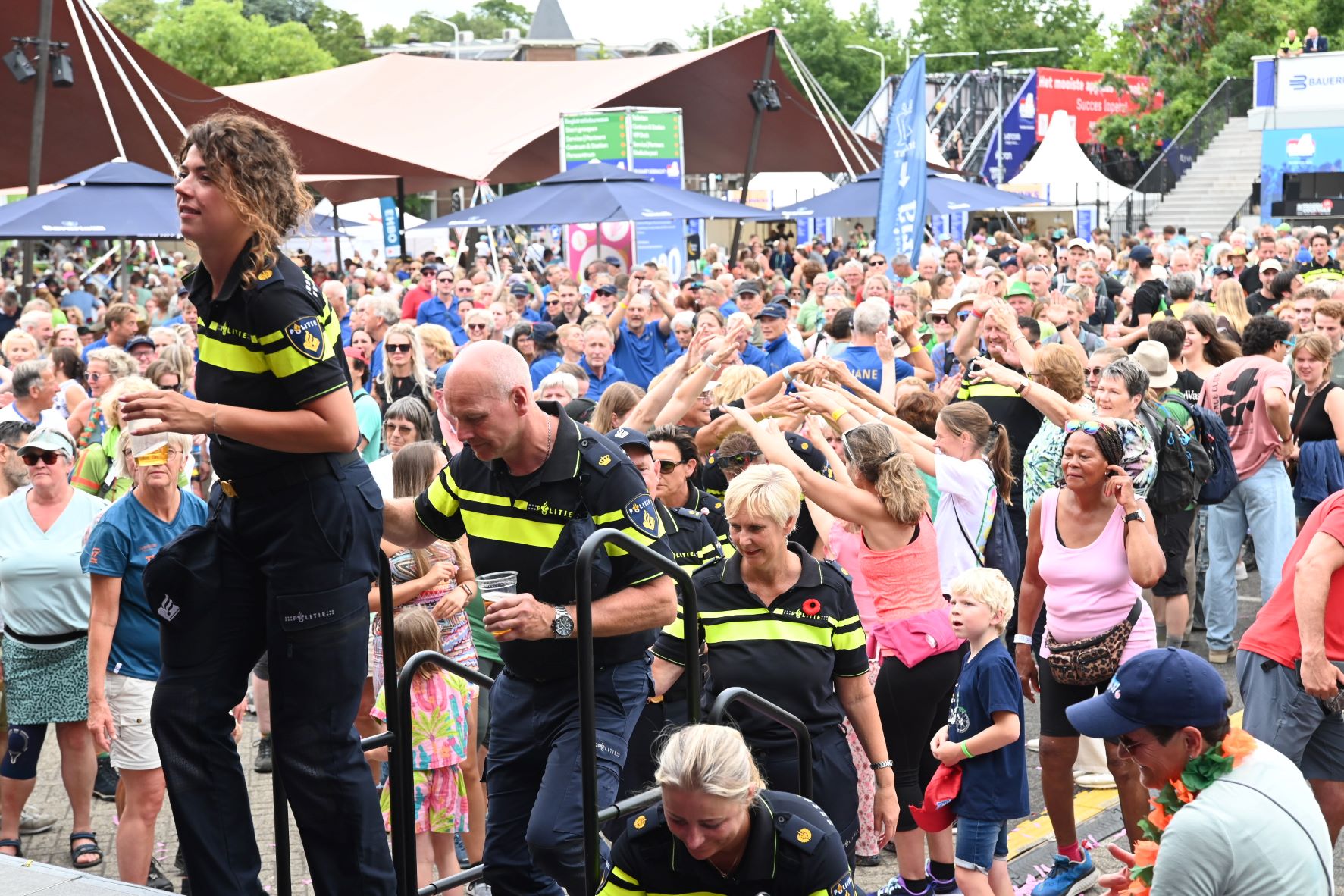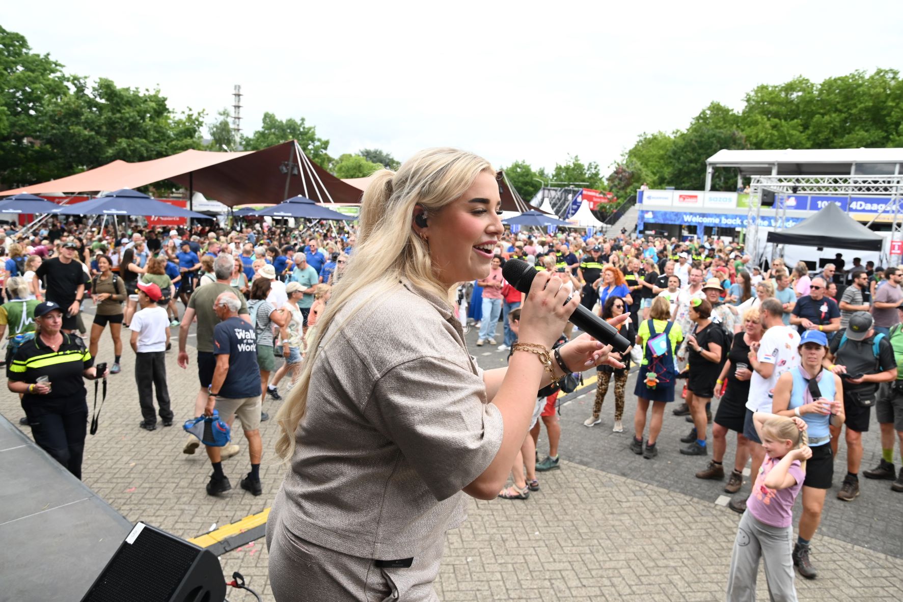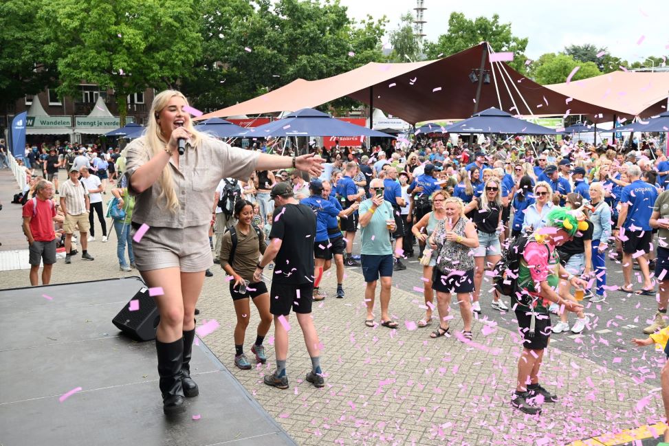 De Nijmeegse Vierdaagse heeft dit jaar een grote Nijkerkse inbreng. Het Nijkerkse platenlabel RoodHitBlauw van Ronald Visch levert een groot deel van de artiesten en de presentatie op de wedren (start en finishplek) is in handen van Marja Willems. Samen met DJ Wipneus en Pim ging Nijmegen donderdag 17 juli helemaal uit zijn dak. Het lukte hen zelfs om het gehele politiekorps op het podium te lokken. Het is elke dag groot feest, maar vrijdag wordt onwaarschijnlijk het hoofdpunt van de week met de Via Gladiola. Behalve Wipneus en Pim was de Veense Courant ook aanwezig tijdens een optreden van zangeres Senna en Mike Versteeg. Diezelfde Versteeg (eerste foto hieronder) is vrijdagavond 18 juli ook te zien op het Plein in Nijkerk tijdens de eerste editie van een reeks Pleinconcerten. Foto en bron Kees van den Heuvel