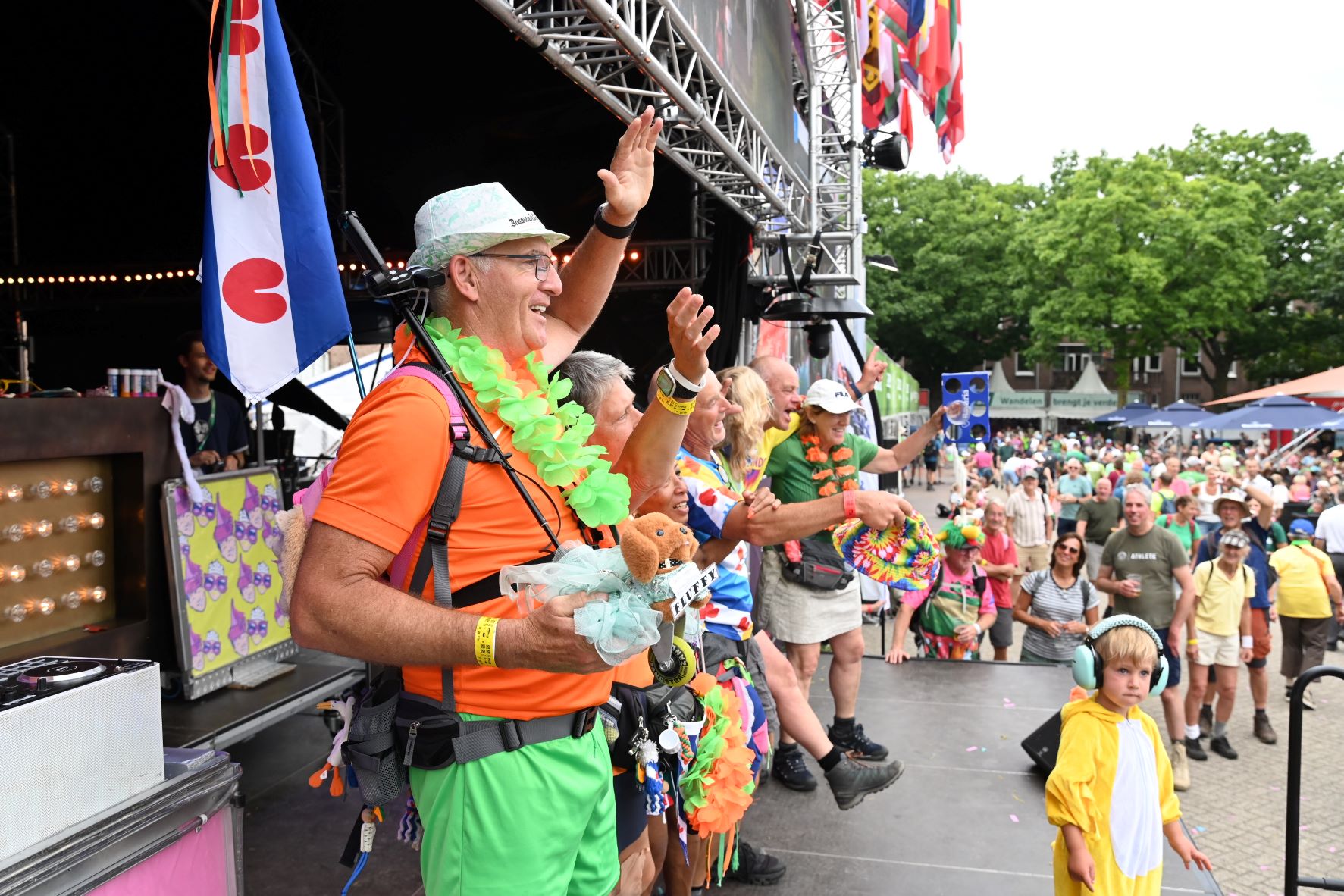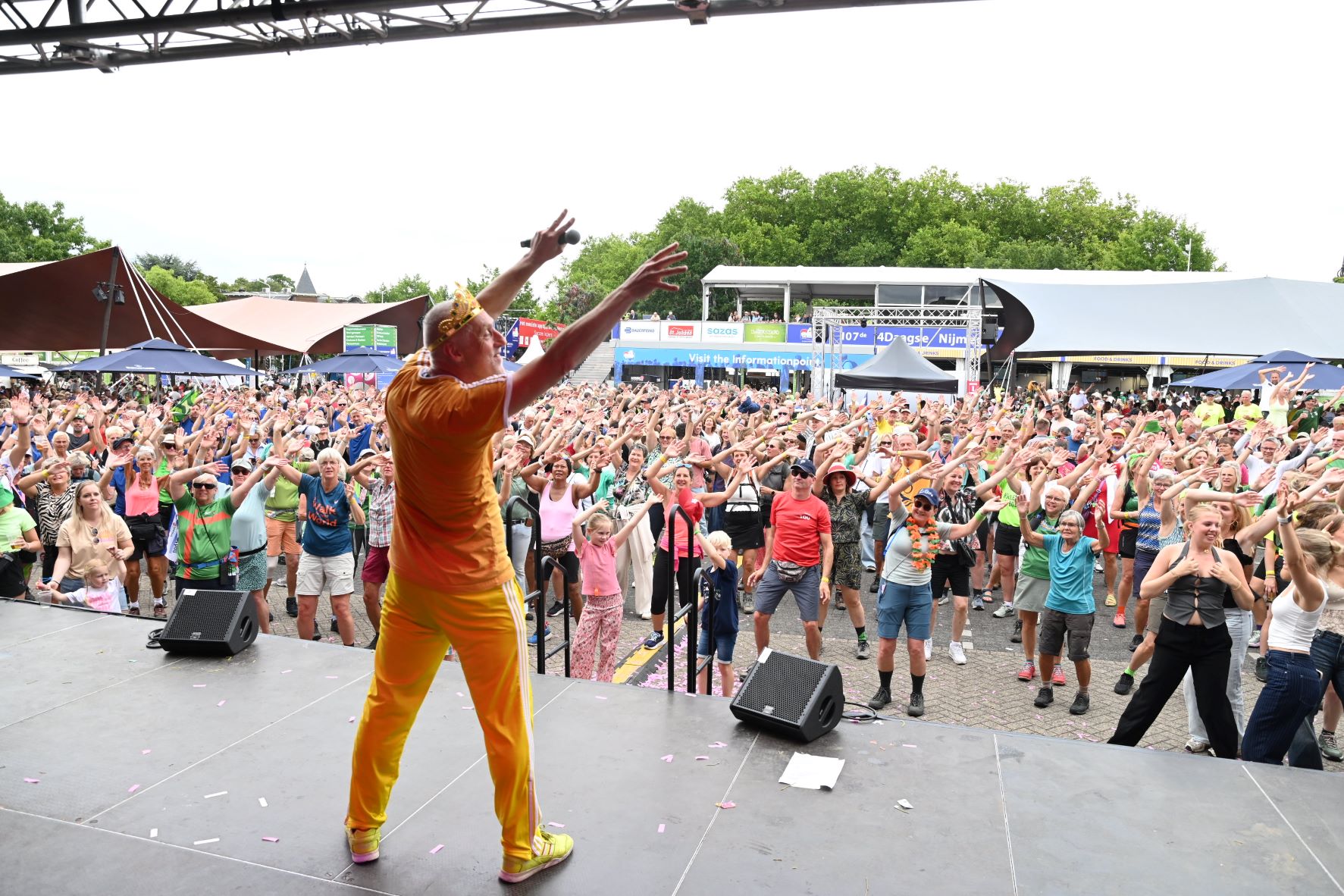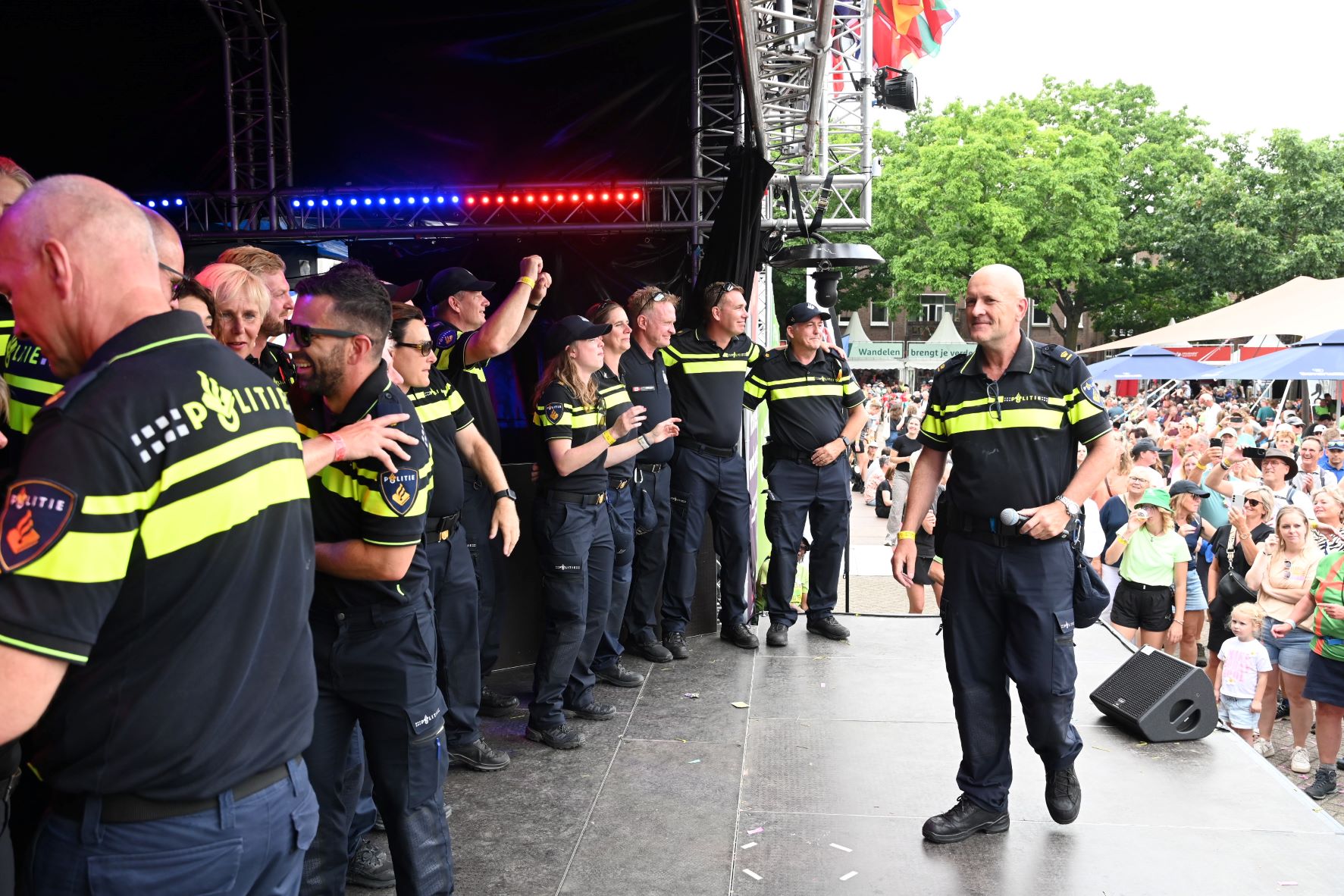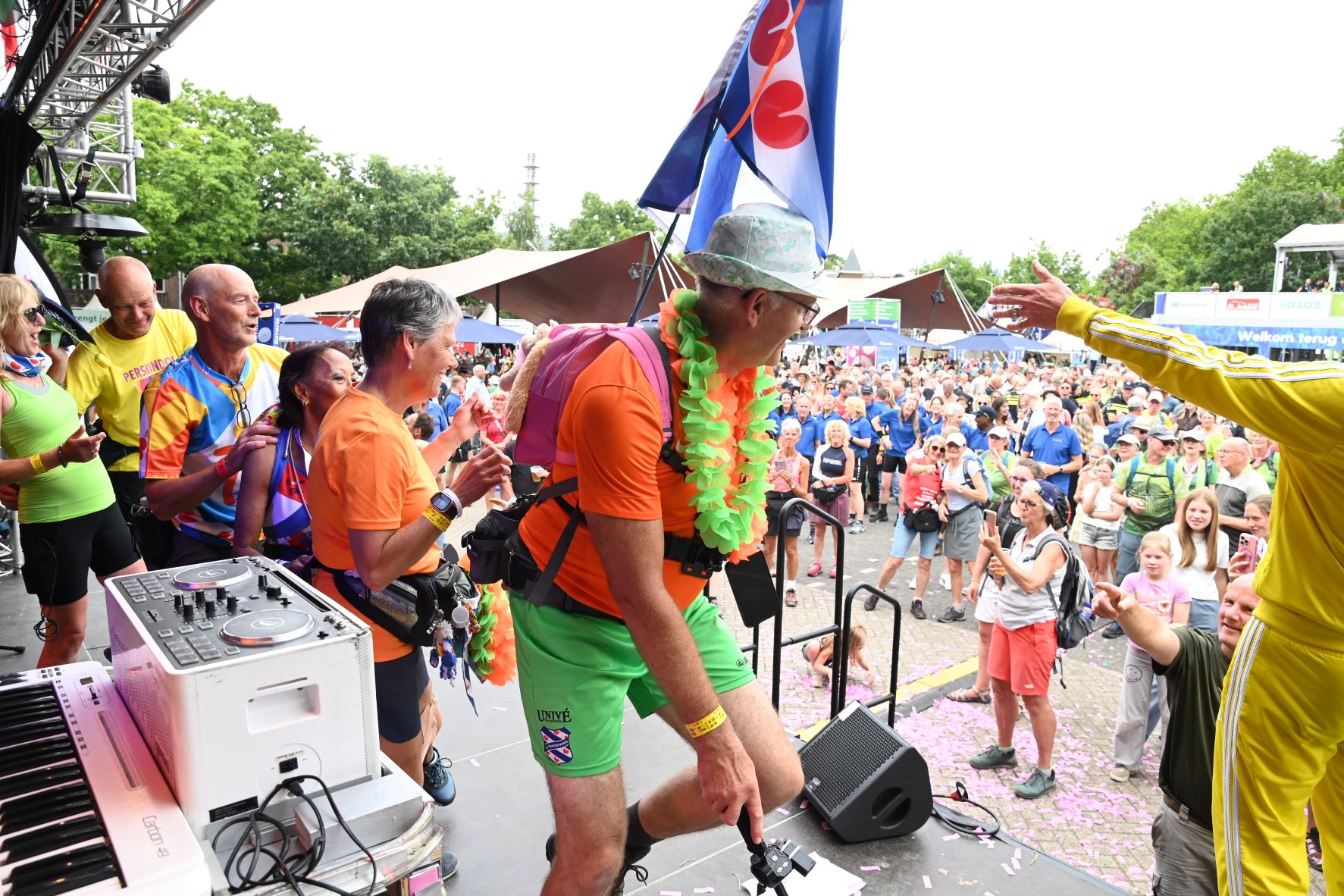 De Nijmeegse Vierdaagse heeft dit jaar een grote Nijkerkse inbreng. Het Nijkerkse platenlabel RoodHitBlauw van Ronald Visch levert een groot deel van de artiesten en de presentatie op de wedren (start en finishplek) is in handen van Marja Willems. Samen met DJ Wipneus en Pim ging Nijmegen donderdag 17 juli helemaal uit zijn dak. Het lukte hen zelfs om het gehele politiekorps op het podium te lokken. Het is elke dag groot feest, maar vrijdag wordt onwaarschijnlijk het hoofdpunt van de week met de Via Gladiola. Behalve Wipneus en Pim was de Veense Courant ook aanwezig tijdens een optreden van zangeres Senna en Mike Versteeg. Diezelfde Versteeg (eerste foto hieronder) is vrijdagavond 18 juli ook te zien op het Plein in Nijkerk tijdens de eerste editie van een reeks Pleinconcerten. Foto en bron Kees van den Heuvel
